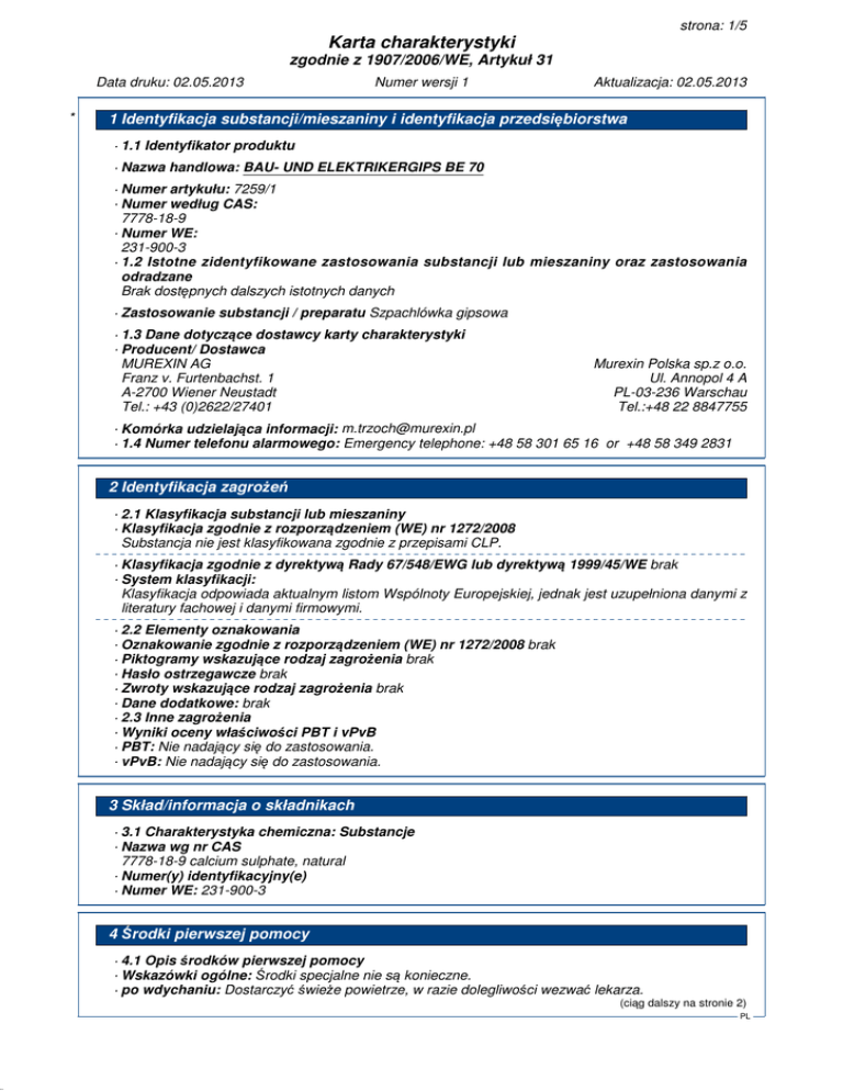 36.0.8 strona: 1/5 Karta charakterystyki zgodnie z 1907/2006/WE, Artykuł 31 Data druku: 02.05.2013 * Numer wersji 1 Aktualizacja: 02.05.2013 1 Identyfikacja substancji/mieszaniny i identyfikacja przedsiębiorstwa · 1.1 Identyfikator produktu · Nazwa handlowa: BAU- UND ELEKTRIKERGIPS BE 70 · Numer artykułu: 7259/1 · Numer według CAS: 7778-18-9 · Numer WE: 231-900-3 · 1.2 Istotne zidentyfikowane zastosowania substancji lub mieszaniny oraz zastosowania odradzane Brak dostępnych dalszych istotnych danych · Zastosowanie substancji / preparatu Szpachlówka gipsowa · 1.3 Dane dotyczące dostawcy karty charakterystyki · Producent/ Dostawca MUREXIN AG Franz v. Furtenbachst. 1 A-2700 Wiener Neustadt Tel.: +43 (0)2622/27401 Murexin Polska sp.z o.o. Ul. Annopol 4 A PL-03-236 Warschau Tel.:+48 22 8847755 · Komórka udzielająca informacji: [email protected] · 1.4 Numer telefonu alarmowego: Emergency telephone: +48 58 301 65 16 or +48 58 349 2831 2 Identyfikacja zagrożeń · 2.1 Klasyfikacja substancji lub mieszaniny · Klasyfikacja zgodnie z rozporządzeniem (WE) nr 1272/2008 Substancja nie jest klasyfikowana zgodnie z przepisami CLP. · Klasyfikacja zgodnie z dyrektywą Rady 67/548/EWG lub dyrektywą 1999/45/WE brak · System klasyfikacji: Klasyfikacja odpowiada aktualnym listom Wspólnoty Europejskiej, jednak jest uzupełniona danymi z literatury fachowej i danymi firmowymi. · 2.2 Elementy oznakowania · Oznakowanie zgodnie z rozporządzeniem (WE) nr 1272/2008 brak · Piktogramy wskazujące rodzaj zagrożenia brak · Hasło ostrzegawcze brak · Zwroty wskazujące rodzaj zagrożenia brak · Dane dodatkowe: brak · 2.3 Inne zagrożenia · Wyniki oceny właściwości PBT i vPvB · PBT: Nie nadający się do zastosowania. · vPvB: Nie nadający się do zastosowania. 3 Skład/informacja o składnikach · 3.1 Charakterystyka chemiczna: Substancje · Nazwa wg nr CAS 7778-18-9 calcium sulphate, natural · Numer(y) identyfikacyjny(e) · Numer WE: 231-900-3 4 Środki pierwszej pomocy · 4.1 Opis środków pierwszej pomocy · Wskazówki ogólne: Środki specjalne nie są konieczne. · po wdychaniu: Dostarczyć świeże powietrze, w razie dolegliwości wezwać lekarza. (ciąg dalszy na stronie 2) PL 36.0.8 strona: 2/5 Karta charakterystyki zgodnie z 1907/2006/WE, Artykuł 31 Data druku: 02.05.2013 Numer wersji 1 Aktualizacja: 02.05.2013 Nazwa handlowa: BAU- UND ELEKTRIKERGIPS BE 70 (ciąg dalszy od strony 1) · po styczności ze skórą: Natychmiast zmyć wodą i mydłem i dobrze spłukać. · po styczności z okiem: Płukać oczy z otwartą powieką przez kilka minut pod bieżącą wodą. · po przełknięciu: Przy trwałych dolegliwościach porozumieć się z lekarzem. · 4.2 Najważniejsze ostre i opóźnione objawy oraz skutki narażenia Brak dostępnych dalszych istotnych danych · 4.3 Wskazania dotyczące wszelkiej natychmiastowej pomocy lekarskiej i szczególnego postępowania z poszkodowanym Brak dostępnych dalszych istotnych danych 5 Postępowanie w przypadku pożaru · 5.1 Środki gaśnicze · Przydatne środki gaśnicze: CO2, proszek gaśniczy lub strumień wody. Większy pożar zwalczać strumieniem wody lub pianą odporną na działanie alkoholu. · 5.2 Szczególne zagrożenia związane z substancją lub mieszaniną Brak dostępnych dalszych istotnych danych · 5.3 Informacje dla straży pożarnej · Specjalne wyposażenie ochronne: Środki specjalne nie są konieczne. 6 Postępowanie w przypadku niezamierzonego uwolnienia do środowiska · 6.1 Indywidualne środki ostrożności, wyposażenie ochronne i procedury w sytuacjach awaryjnych Nie konieczne. · 6.2 Środki ostrożności w zakresie ochrony środowiska: Nie dopuścić do przedostania się do kanalizacji lub zbiorników wodnych. · 6.3 Metody i materiały zapobiegające rozprzestrzenianiu się skażenia i służące do usuwania skażenia: Zdjąć mechanicznie. · 6.4 Odniesienia do innych sekcji Nie powstają żadne materiały niebezpieczne. 7 Postępowanie z substancjami i mieszaninami oraz ich magazynowanie · 7.1 Środki ostrożności dotyczące bezpiecznego postępowania Środki specjalne nie są konieczne. · Wskazówki dla ochrony przeciwpożarowej i przeciwwybuchowej: Nie są potrzebne szczególne zabiegi. · 7.2 Warunki bezpiecznego magazynowania, łącznie z informacjami dotyczącymi wszelkich wzajemnych niezgodności · Składowanie: · Wymagania w stosunku do pomieszczeń składowych i zbiorników: Przechowywać tylko w oryginalnych beczkach. · Wskazówki odnośnie wspólnego składowania: nie konieczne · Dalsze wskazówki odnośnie warunków składowania: Składować w suchym miejscu. · 7.3 Szczególne zastosowanie(-a) końcowe Brak dostępnych dalszych istotnych danych 8 Kontrola narażenia/środki ochrony indywidualnej · Dodatkowe wskazówki dla wykonania urządzeń technicznych: Brak dalszych danych, patrz punkt 7. (ciąg dalszy na stronie 3) PL 36.0.8 strona: 3/5 Karta charakterystyki zgodnie z 1907/2006/WE, Artykuł 31 Data druku: 02.05.2013 Numer wersji 1 Aktualizacja: 02.05.2013 Nazwa handlowa: BAU- UND ELEKTRIKERGIPS BE 70 (ciąg dalszy od strony 2) · 8.1 Parametry dotyczące kontroli · Składniki wraz z kontrolowanymi wartościami granicznymi zależnymi od miejsca pracy: nie dotyczy · Wskazówki dodatkowe: Podstawą były aktualnie obowiązujące wykazy. · 8.2 Kontrola narażenia · Osobiste wyposażenie ochronne: · Ogólne środki ochrony i higieny: Trzymać z dala od środków spożywczych napojów i pasz. Zabrudzoną, nasączoną odzież natychmiast zdjąć. Myć ręce przed przerwą i przed końcem pracy. · Ochrona dróg oddechowych: Nie konieczne. · Ochrona rąk: Nie konieczne. · Materiał, z którego wykonane są rękawice Wybór odpowiednich rękawic nie zależy tylko od materiału, lecz także od innych cech jakościowych i zmienia się od producenta do producenta. · Czas penetracji dla materiału, z którego wykonane są rękawice Od producenta rękawic należy uzyskać informacj
