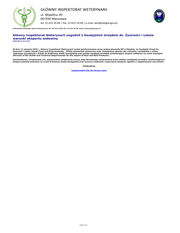 Sekretariat Głównego Lekarza Weterynarii, tel. 22 623 20 89, fax. 22 623 14 08, email: [email protected] Główny Inspektorat Weterynarii uzgodnił z Saudyjskim Urzędem ds. Żywności i Leków warunki eksportu wołowiny 2016-08-12 16:12:59 W dniu 11 sierpnia 2016 r. Główny Inspektorat Weterynarii został poinformowany przez polską placówkę RP w Rijadzie, że Saudyjski Urząd ds. Żywności i Leków (Saudi Food and Drug Authority – SFDA) zatwierdził ostateczny wzór świadectwa zdrowia dla wołowiny i produktów z mięsa wołowego wysyłanych z Polski do Królestwa Arabii Saudyjskiej oraz polsko-saudyjski protokół umożliwiający eksport wołowiny na rynek saudyjski (Minutes of the Health and Technical Requirements for the Import of Beef and Beef Products). Zatwierdzenie i przekazanie ww. dokumentów ostatecznie kończy etap formalnego ustanowienia przez władze saudyjskie procedur umożliwiających eksport polskiej wołowiny na rynek Królestwa Arabii Saudyjskiej oraz oznacza możliwość rozpoczęcia eksportu zgodnie z uzgodnionymi warunkami. dziękujemy bezpośredni link do strony www strona 1/1 Powered by TCPDF (www.tcpdf.org)