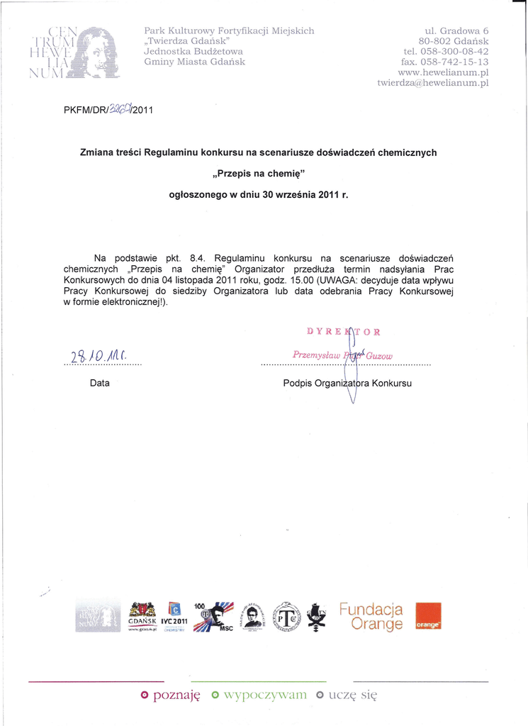 ul. Gradowa 6 80-802 Gdańsk tel. 058-300-08-42 fax. 058-742-15-13 www.hewelianum.pl [email protected] Park Kulturowy Fortyfikacji Miejskich "Twierdza Gdańsk" Jednostka Budżetowa Gminy Miasta Gdańsk PKFM/DR/320C#2011 Zmiana treści Regulaminu konkursu na scenariusze doświadczeń chemicznych "Przepis na chemię" ogłoszonego w dniu 30 września 2011 r. Na podstawie pkt. 8.4. Regulaminu konkursu na scenariusze doświadczeń chemicznych "Przepis na chemię" Organizator przedłuża termin nadsyłania Prac Konkursowych do dnia 04 listopada 2011 roku, godz. 15.00 (UWAGA: decyduje data wpływu Pracy Konkursowej do siedziby Organizatora lub data odebrania Pracy Konkursowej w formie elektronicznej!). DYR E 2f6.) D .;ffl(. Przemysław .............................. Data Guzow Podpis Organi at ra Konkursu - GDANSK IVC2011 o poznaję Fundacja Orange o \'VYP oc Z ywan1 o uczę się