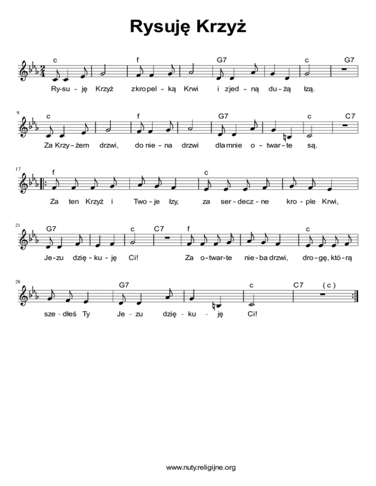 Rysuję Krzyż 2 c 4 Ry su 9 c ję f G7 Krzyż z kro pel ką Krwi f drzwi, do nie na drzwi 17 f Je zu ten Krzyż i Two je c ną łzą. G7 du żą C7 za f Ci! Za o twar te G7 Je zu dzię twar te kro nie ba drzwi, ple Krwi, c dro gę, któ rą C7 ( c ) ku są. c sze dłeś Ty o C7 ser decz ne ję dla mnie G7 c łzy, dzię ku 28 i z jed c 21 G7 Za Krzy żem Za c ję www.nuty.religijne.org Ci!