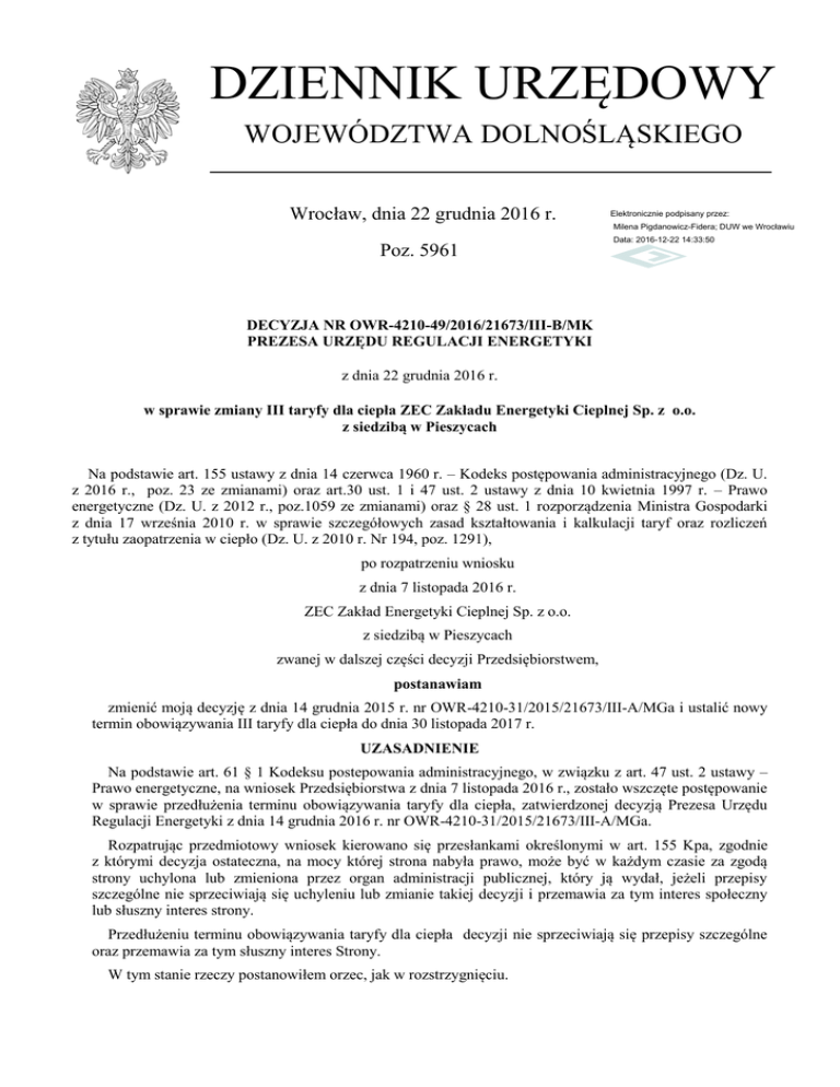 DZIENNIK URZĘDOWY WOJEWÓDZTWA DOLNOŚLĄSKIEGO Wrocław, dnia 22 grudnia 2016 r. Elektronicznie podpisany przez: Milena Pigdanowicz-Fidera; DUW we Wrocławiu Poz. 5961 Data: 2016-12-22 14:33:50 DECYZJA NR OWR-4210-49/2016/21673/III-B/MK PREZESA URZĘDU REGULACJI ENERGETYKI z dnia 22 grudnia 2016 r. w sprawie zmiany III taryfy dla ciepła ZEC Zakładu Energetyki Cieplnej Sp. z o.o. z siedzibą w Pieszycach Na podstawie art. 155 ustawy z dnia 14 czerwca 1960 r. – Kodeks postępowania administracyjnego (Dz. U. z 2016 r., poz. 23 ze zmianami) oraz art.30 ust. 1 i 47 ust. 2 ustawy z dnia 10 kwietnia 1997 r. – Prawo energetyczne (Dz. U. z 2012 r., poz.1059 ze zmianami) oraz § 28 ust. 1 rozporządzenia Ministra Gospodarki z dnia 17 września 2010 r. w sprawie szczegółowych zasad kształtowania i kalkulacji taryf oraz rozliczeń z tytułu zaopatrzenia w ciepło (Dz. U. z 2010 r. Nr 194, poz. 1291), po rozpatrzeniu wniosku z dnia 7 listopada 2016 r. ZEC Zakład Energetyki Cieplnej Sp. z o.o. z siedzibą w Pieszycach zwanej w dalszej części decyzji Przedsiębiorstwem, postanawiam zmienić moją decyzję z dnia 14 grudnia 2015 r. nr OWR-4210-31/2015/21673/III-A/MGa i ustalić nowy termin obowiązywania III taryfy dla ciepła do dnia 30 listopada 2017 r. UZASADNIENIE Na podstawie art. 61 § 1 Kodeksu postepowania administracyjnego, w związku z art. 47 ust. 2 ustawy – Prawo energetyczne, na wniosek Przedsiębiorstwa z dnia 7 listopada 2016 r., zostało wszczęte postępowanie w sprawie przedłużenia terminu obowiązywania taryfy dla ciepła, zatwierdzonej decyzją Prezesa Urzędu Regulacji Energetyki z dnia 14 grudnia 2016 r. nr OWR-4210-31/2015/21673/III-A/MGa. Rozpatrując przedmiotowy wniosek kierowano się przesłankami określonymi w art. 155 Kpa, zgodnie z którymi decyzja ostateczna, na mocy której strona nabyła prawo, może być w każdym czasie za zgodą strony uchylona lub zmieniona przez organ administracji publicznej, który ją wydał, jeżeli przepisy szczególne nie sprzeciwiają się uchyleniu lub zmianie takiej decyzji i przemawia za tym interes społeczny lub słuszny interes strony. Przedłużeniu terminu obowiązywania taryfy dla ciepła decyzji nie sprzeciwiają się przepisy szczególne oraz przemawia za tym słuszny interes Strony. W tym stanie rzeczy postanowiłem orzec, jak w rozstrzygnięciu. Dziennik Urzędowy Województwa Dolnośląskiego –2– Poz. 5961 POUCZENIE 1) od niniejszej decyzji przysługuje odwołanie do Sądu Okręgowego w Warszawie – Sądu Ochrony Konkurencji i Konsumentów – za moim pośrednictwem, w terminie dwutygodniowym od dnia jej doręczenia (art. 30 ust. 2 i 3 ustawy z dnia 10 kwietnia 1997 r. - Prawo energetyczne oraz art. 47946 pkt 1 i art. 47947 § 1 Kodeksu postępowania cywilnego). 2) odwołanie od decyzji powinno czynić zadość wymaganiom przepisanym dla pisma procesowego oraz zawierać oznaczenie zaskarżonej decyzji i wartości przedmiotu sporu, przytoczenie zarzutów, zwięzłe ich uzasadnienie, wskazanie dowodów, a także zawierać wniosek o uchylenie albo o zmianę decyzji w całości lub w części (art. 47949 Kodeksu postępowania cywilnego). Odwołanie należy przesłać na adres Południowo-Zachodniego Oddziału Terenowego Urzędu Regulacji Energetyki - ul. Marszałka Józefa Piłsudskiego 49-57, 50-032 Wrocław. 3) stosownie do art. 31 ust. 4 oraz art. 47 ust. 3 pkt 2 ustawy – Prawo energetyczne, niniejsza decyzja zostanie skierowana do ogłoszenia w Dzienniku Urzędowym Województwa Dolnośląskiego. Radca Prezesa w Południowo-Zachodnim Oddziale Terenowym Urzędu Regulacji Energetyki we Wrocławiu: A. Łukasiewicz Otrzymują: 1) ZEC Zakład Energetyki Cieplnej Sp. z o.o. ul. Bielawska 6/17 58-250 Pieszyce 2) Wojewoda Dolnośląski Decyzja zwolniona z opłaty skarbowej na podstawie art. 4 i załącznika (Część I ust. 53 pkt 1) ustawy o opłacie skarbowej. - starszy specjalista Mirosław Kaczmarek