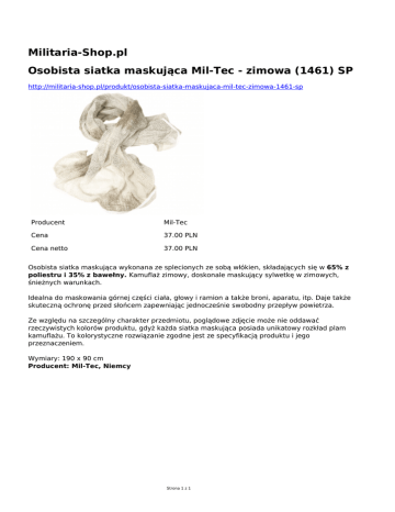 Militaria-Shop.pl Osobista siatka maskująca Mil-Tec - zimowa (1461) SP http://militaria-shop.pl/produkt/osobista-siatka-maskujaca-mil-tec-zimowa-1461-sp Producent Mil-Tec Cena 37.00 PLN Cena netto 37.00 PLN Osobista siatka maskująca wykonana ze splecionych ze sobą włókien, składających się w 65% z poliestru i 35% z bawełny. Kamuflaż zimowy, doskonale maskujący sylwetkę w zimowych, śnieżnych warunkach. Idealna do maskowania górnej części ciała, głowy i ramion a także broni, aparatu, itp. Daje także skuteczną ochronę przed słońcem zapewniając jednocześnie swobodny przepływ powietrza. Ze względu na szczególny charakter przedmiotu, poglądowe zdjęcie może nie oddawać rzeczywistych kolorów produktu, gdyż każda siatka maskująca posiada unikatowy rozkład plam kamuflażu. To kolorystyczne rozwiązanie zgodne jest ze specyfikacją produktu i jego przeznaczeniem. Wymiary: 190 x 90 cm Producent: Mil-Tec, Niemcy Strona 1 z 1