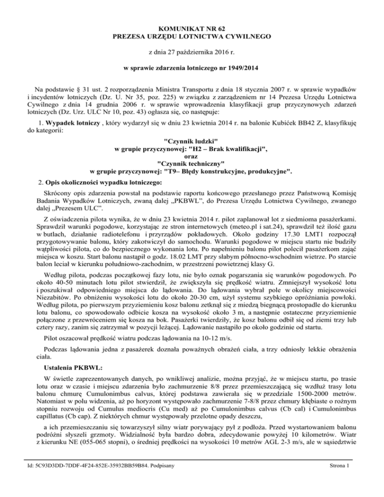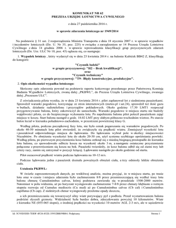 KOMUNIKAT NR 62 PREZESA URZĘDU LOTNICTWA CYWILNEGO z dnia 27 października 2016 r. w sprawie zdarzenia lotniczego nr 1949/2014 Na podstawie § 31 ust. 2 rozporządzenia Ministra Transportu z dnia 18 stycznia 2007 r. w sprawie wypadków i incydentów lotniczych (Dz. U. Nr 35, poz. 225) w związku z zarządzeniem nr 14 Prezesa Urzędu Lotnictwa Cywilnego z dnia 14 grudnia 2006 r. w sprawie wprowadzenia klasyfikacji grup przyczynowych zdarzeń lotniczych (Dz. Urz. ULC Nr 10, poz. 43) ogłasza się, co następuje: 1. Wypadek lotniczy , który wydarzył się w dniu 23 kwietnia 2014 r. na balonie Kubićek BB42 Z, klasyfikuję do kategorii: "Czynnik ludzki" w grupie przyczynowej: "H2 – Brak kwalifikacji", oraz "Czynnik techniczny" w grupie przyczynowej: "T9– Błędy konstrukcyjne, produkcyjne". 2. Opis okoliczności wypadku lotniczego: Skrócony opis zdarzenia powstał na podstawie raportu końcowego przesłanego przez Państwową Komisję Badania Wypadków Lotniczych, zwaną dalej „PKBWL”, do Prezesa Urzędu Lotnictwa Cywilnego, zwanego dalej „Prezesem ULC”. Z oświadczenia pilota wynika, że w dniu 23 kwietnia 2014 r. pilot zaplanował lot z siedmioma pasażerkami. Sprawdził warunki pogodowe, korzystając ze stron internetowych (meteo.pl i sat.24), sprawdził też ilość gazu w butlach, działanie radiotelefonu i przyrządów pokładowych. Około godziny 17.30 LMT1 rozpoczął przygotowywanie balonu, który zakotwiczył do samochodu. Warunki pogodowe w miejscu startu nie budziły wątpliwości pilota, co do bezpiecznego wykonania lotu. Po napełnieniu balonu pilot polecił pasażerkom zająć miejsca w koszu. Start balonu nastąpił o godz. 18.02 LMT przy słabym północno-wschodnim wietrze. Po starcie balon leciał w kierunku południowo-zachodnim, w przestrzeni powietrznej klasy G. Według pilota, podczas początkowej fazy lotu, nie było oznak pogarszania się warunków pogodowych. Po około 40-50 minutach lotu pilot stwierdził, że zwiększyła się prędkość wiatru. Zmniejszył wysokość lotu i poszukiwał odpowiedniego miejsca do lądowania. Do lądowania wybrał pole w okolicy miejscowości Niezabitów. Po obniżeniu wysokości lotu do około 20-30 cm, użył systemu szybkiego opróżniania powłoki. Według pilota, po pierwszym przyziemieniu kosz balonu zetknął się z miedzą biegnącą prostopadle do kierunku lotu balonu, co spowodowało odbicie kosza na wysokość około 3 m, a następnie ostateczne przyziemienie połączone z przewróceniem się kosza na bok. Pasażerki twierdziły, że kosz balonu odbił się od ziemi trzy lub cztery razy, zanim się zatrzymał w pozycji leżącej. Lądowanie nastąpiło po około godzinie od startu. Pilot oszacował prędkość wiatru podczas lądowania na 10-12 m/s. Podczas lądowania jedna z pasażerek doznała poważnych obrażeń ciała, a trzy odniosły lekkie obrażenia ciała. Ustalenia PKBWL: W świetle zaprezentowanych danych, po wnikliwej analizie, można przyjąć, że w miejscu startu, po trasie lotu oraz w czasie i miejscu zdarzenia było zachmurzenie 8/8 przez przemieszczającą się wzdłuż trasy lotu balonu chmurę Cumulonimbus calvus, której podstawa zawierała się w przedziale 1500-2000 metrów. Natomiast w polu widzenia, aż po horyzont występowało zachmurzenie 7-8/8 przez chmury kłębiaste o rożnym stopniu rozwoju od Cumulus mediocris (Cu med) aż po Cumulonimbus calvus (Cb cal) i Cumulonimbus capillatus (Cb cap). Z niektórych chmur występowały przelotne opady deszczu, a ich przemieszczaniu się towarzyszył silny wiatr porywający pył z podłoża. Przed wystartowaniem balonu podróżni słyszeli grzmoty. Widzialność była bardzo dobra, zdecydowanie powyżej 10 kilometrów. Wiatr z kierunku NE (055-065 stopni), o średniej prędkości na wysokości 10 metrów AGL 2-3 m/s, ale w sąsiedztwie Id: 5C93D3DD-7DDF-4F24-852E-35932BB59B84. Podpisany Strona 1 chmur Cumulonimbus silny i porywisty, którego prędkość w porywach można szacować na 8-12 m/s. Temperatura powietrza około 18°C. Ciśnienie atmosferyczne QNH około 1018 hPa z tendencją wzrostową. Ze zgromadzonych informacji wynika, że pilot podjął się wykonania lotu, będąc przekonanym, że aktualne w czasie startu i przewidywane w czasie lotu warunki meteorologiczne nie stanowią zagrożenia. Jednak podane przez pilota źródła informacji, z jakich korzystał (meteo.pl i SAT 24), nie dawały podstaw do tak optymistycznej oceny pogody. Być może pilot nie posługiwał się informacjami meteorologicznymi przeznaczonymi dla lotnictwa, gdyż nie potrafił on odczytywać podstawowych informacji meteorologicznych zawartych w METAR, SIGNIFICANT, AIRMET, GAMET i TAF. Zdaniem PKBWL, problem z oceną aktualnych i prognozowanych warunków meteorologicznych wynikał z braku wiedzy pilota na poziomie wymaganym do uzyskania licencji. W świetle przedstawionych wyżej warunków pogodowych, a także prognoz pogodowych, należało liczyć się z tym, że w miejscu startu, na trasie przelotu oraz w miejscu lądowania balonu, mogły występować chmury Cumulonimbus niebezpieczne dla lotnictwa, a lokalnie także burze z deszczem oraz przelotny deszcz. Pilot twierdził, że warunki atmosferyczne pogorszyły się po 40-50 minutach od startu. Jednak analiza czasów wykonania zdjęć przez pasażerki dowodzi, że chmura Cumulonimbus (Cb) i opad deszczu widoczne były z balonu już w pierwszej minucie po starcie. W opinii PKBWL, pilot powinien rozpoznać widoczne zagrożenie i niezwłocznie wylądować w pierwszym możliwym miejscu. Z analizy zdjęć wykonanych przez pasażerki wynika, że balon przelatywał nad polami uprawnymi, na których można było bezpiecznie wylądować. PKBWL zwraca uwagę, że w sytuacji zagrożenia nie ma znaczenia spowodowanie strat na polu uprawnym, czy uciążliwość wynoszenia zespołów balonu do najbliższej drogi, którą może dojechać samochód ekipy naziemnej. Liczy się przede wszystkim bezpieczeństwo, a ewentua