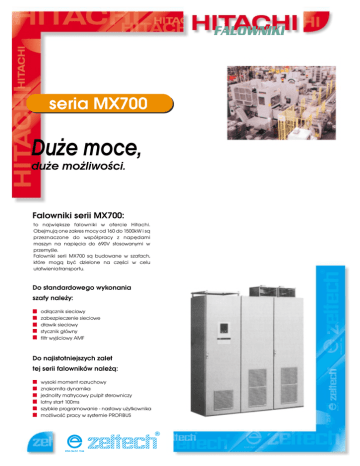 FALOWNIKI seria MX700 Du¿e moce, du¿e mo¿liwoci. Falowniki serii MX700: to najwiêksze falowniki w ofercie Hitachi. Obejmuj¹ one zakres mocy od 160 do 1500kW i s¹ przeznaczone do wspó³pracy z napêdami maszyn na napiêcia do 690V stosowanymi w przemyle. Falowniki serii MX700 s¹ budowane w szafach, które mog¹ byæ dzielone na czêci w celu u³atwienia transportu. Do standardowego wykonania szafy nale¿y: od³¹cznik sieciowy zabezpieczenie sieciowe d³awik sieciowy stycznik g³ówny filtr wyjciowy AMF Do najistotniejszych zalet tej serii falowników nale¿¹: wysoki moment rozruchowy znakomita dynamika jednolity matrycowy pulpit sterowniczy lotny start 100ms szybkie programowanie - nastawy u¿ytkownika mo¿liwoæ pracy w systemie PROFIBUS Dane techniczne falowników: IDEE DLA PRZYSZ£OCI serii MX700 Rozmiar 7 Rozmiar 6 Rozmiar 8 Model 160C / 200P 200C / 250P 250C / 315 P 315C / 400P 400C / 500P 500C / 630P 630C / 800P 800C / 1000P 1000C / 1200P 1200C / 1500P Obci¹¿enie sta³omomentowe Max. moc wspó³pracuj¹cego silnika [kW] 160 200 250 315 400 500 630 800 1000 1200 Moc wyjciowa [kVA] 227 275 341 418 520 657 837 1046 1255 1578 Znamionowy pr¹d wyjciowy [A] 190 230 285 350 435 550 700 875 1050 1320 Dopuszczalne przeci¹¿enie pr¹dowe 150% In przez 60s w 10 minutach Obci¹¿enie zmiennomomentowe Moc wspó³pracuj¹cego silnika [kW] 200 250 315 400 500 630 800 1000 1200 1500 Moc wyjciowa [kVA] 275 329 406 502 621 789 1004 1255 1506 1888 Znamionowy pr¹d wyjciowy [A] 230 275 340 420 520 660 840 1055 1260 1580 Dopuszczalne przeci¹¿enie pr¹dowe 120% In przez 60s w 10 minutach Czas przyspieszania i zwalniania Od 0.1s do 160s (dostêpny jest drugi zestaw czasów przyspieszania i zwalniania) W przypadku cyfrowego zadawania czêstotliwoci - 0.01Hz (50Hz) W przypadku analogowego zadawania czêstotliwoci - 0.05 Hz (50Hz) Rozdzielczoæ czêstotliwoci 3 - fazowe 690V ± 10%, 50Hz ± 5% Napiêcie zasilania Znamionowe napiêcie zasilania 3 - fazowe 95%Uzas, 50Hz ± 5% Czêstotliwoæ wyjciowa 0 ÷ 300Hz Czêstotliwoæ kluczowania tranzystorów max. 2,5kHz (samodostosowalna) Stopieñ ochrony Wymiary [mm] IP23 Wysokoæ 2300 2300 2300 Szerokoæ 1200 2000 3600 G³êbokoæ 600 600 600 900 1400 1100+900 Masa [kg] Sygna³ wejciowy Sygnalizacja wyjciowa Panel operatorski Zadawanie czêstotliwoci Zadawanie rozkazu ruchu 4 programowalne zaciski wejciowe (opcjonalnie do 12) Wejcie termistorowe - Sygna³ pr¹dowy (0) 4 - 20mA - Motopotencjometr - Sygna³ napiêciowy 0 - 10V - Potecjometr 10kW Sygna³y zewnêtrzne Panel operatorski Sygna³y ci¹g³e FWD / REV Sygna³y impulsowe FWD, REV, STOP Sygna³y zewnêtrzne FWD, REV, STOP, Jogging, prêdkoæ wielopoziomowa, 2-gi zestaw czasów,blokada falownika, zewnêtrzne wy³¹czanie EXT, blokada regulatora PID, sieæ ZA£/WY£, blokada zmiany parametrów, sterowanie lokalne/zdalne, kasowanie blokady Przekanik wyjciowy RL1, NC1, NO1 (opcjonalnie do 5 szt.) gotowoæ, praca, awaria, gotowoæ i praca, ostrze¿enie, praca generatorowa, napiêcie za³¹czone, potwierdzenie pracy w trybie lokalnym, sygnalizacja osi¹gniêcia, przekroczenia czêstotliwoci Sygna³y monitoruj¹ce pracê falownika sygna³ analogowy 4÷20mA, 0÷20mA, monitorowanie czêstotliwoci, pr¹du, napiêcia, mocy, momentu Inne w³aciwoci Inne funkcje szybki stop, makroaplikacje, wybór jêzyka komunikatów, autostrojenie, eliminacja czêstotliwoci zabronionych, wbudowany regulator PID, synchronizacja czêstotliwoci z prêdkoci¹ silnika Funkcje zabezpieczaj¹ce zabezpieczanie: nadnapiêciowe, podnapiêciowe, nadpr¹dowe, nieprawid³owy sygna³ 4mA, przeci¹¿enie silnika, nabieg, przekroczona temperatura radiatora, zabezpieczenie przed utykiem Zaciski TH DYSTRYBUTOR Warunki zewnêtrzne Temperatura otoczenia od 0°C do 40°C Temperatura sk³adowania od -25°C do +70°C wykona³ Robert Jastrzêbski ’02.2000