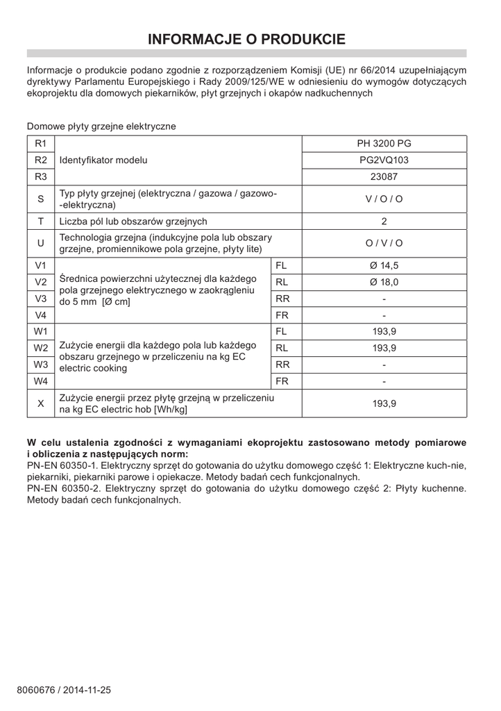 INFORMACJE O PRODUKCIE Informacje o produkcie podano zgodnie z rozporządzeniem Komisji (UE) nr 66/2014 uzupełniającym dyrektywy Parlamentu Europejskiego i Rady 2009/125/WE w odniesieniu do wymogów dotyczących ekoprojektu dla domowych piekarników, płyt grzejnych i okapów nadkuchennych Domowe płyty grzejne elektryczne R1 R2 PH 3200 PG Identyfikator modelu PG2VQ103 R3 S 23087 Typ płyty grzejnej (elektryczna / gazowa / gazowo ‑elektryczna) T Liczba pól lub obszarów grzejnych U Technologia grzejna (indukcyjne pola lub obszary grzejne, promiennikowe pola grzejne, płyty lite) V1 V2 V3 Średnica powierzchni użytecznej dla każdego pola grzejnego elektrycznego w zaokrągleniu do 5 mm [Ø cm] V4 W1 W2 W3 Zużycie energii dla każdego pola lub każdego obszaru grzejnego w przeliczeniu na kg EC electric cooking W4 X Zużycie energii przez płytę grzejną w przeliczeniu na kg EC electric hob [Wh/kg] V/O/O 2 O/V/O FL Ø 14,5 RL Ø 18,0 RR ‑ FR ‑ FL 193,9 RL 193,9 RR ‑ FR ‑ 193,9 W celu ustalenia zgodności z wymaganiami ekoprojektu zastosowano metody pomiarowe i obliczenia z następujących norm: PN‑EN 60350‑1. Elektryczny sprzęt do gotowania do użytku domowego część 1: Elektryczne kuch‑nie, piekarniki, piekarniki parowe i opiekacze. Metody badań cech funkcjonalnych. PN‑EN 60350‑2. Elektryczny sprzęt do gotowania do użytku domowego część 2: Płyty kuchenne. Metody badań cech funkcjonalnych. 8060676 / 2014‑11‑25 INFORMACE O VÝROBKU Informace o výrobku byla uvedena v souladu s nařízením Komise (EU) č. 66/2014 doplňujícím směrnice Evropského parlamentu a Rady 2009/125/ES ve vztahu k požadavkům týkajícím se ekoprojektu pro trouby pro domácnost, varných desek a elektrických sporákových odsavačů par pro domácnost Elektrické varné desky pro domácnost R1 R2 PH 3200 PG Identifikátor modelu PG2VQ103 R3 S 23087 Typ varné desky (elektrická / Plynová / Plynové ‑Elektrické) T Počet varných zón a/nebo ploch U Technologie ohřevu (indukční varné zóny a varné plochy, sálavé varné zóny, pevné plotny) V1 V2 V3 průměr užitečné plochy povrchu jednotlivých elektricky ohřívaných varných zón zaokrouhlený na nejbližších 5 mm [Ø cm] V4 W1 W2 W3 W4 X Spotřeba energie na elektrickou varnou zónu nebo plochu přepočtenou na kg EC electric cooking V/O/O 2 O/V/O FL Ø 14,5 RL Ø 18,0 RR ‑ FR ‑ FL 193,9 RL 193,9 RR ‑ FR ‑ Spotřeba energie na varnou desku přepočtenou na kg EC electric hob [Wh/kg] 193,9 Pro zjištění shody s požadavky ekoprojektu byly použity měřicí a výpočtové metody z následujících norem: EN 60350‑1 EN 60350‑2 INFORMÁCIE O VÝROBKU Informácia o výrobku bola uvedená v súlade s nariadením Komísie (EÚ) č. 66/2014 doplňujúcim smernice Európskeho parlamentu a Rady 2009/125/ES vo vzťahu k požiadavkám týkajúcim sa ekoprojektu pre rúry na pečenie pre domácnosť, varných dosák a odsávače pár pre domácnosť Elektrické varné dosky pre domácnosť R1 R2 PH 3200 PG Identifikátor modelu PG2VQ103 R3 S 23087 Typ varnej dosky (elektrickáa / Plynové / Plynové ‑elektrická) T Počet zón a/alebo plôch na varenie U Technológia ohrevu (indukčné zóny a plochy na varenie, sálavé zóny na varenie, pevné platne) V1 V/O/O 2 O/V/O FL Ø 14,5 RL Ø 18,0 RR ‑ FR ‑ W1 FL 193,9 W2 RL 193,9 RR ‑ FR ‑ V2 V3 Priemer plochy užitočného povrchu na elektricky ohrievanú zónu na varenie, zaokrúhlený na najbližších 5 mm [Ø cm] V4 W3 W4 X Vypočítaná spotreba energie na zónu alebo plochu na varenie na kg EC electric cooking Spotreba energie varnej dosky vypočítaná na kg EC electric hob [Wh/kg] 193,9 Pre zistenie zhody s požiadavkami ekoprojektu boli použité metódy merania z nasledujúcich noriem: EN 60350‑1 EN 60350‑2 a výpočtov