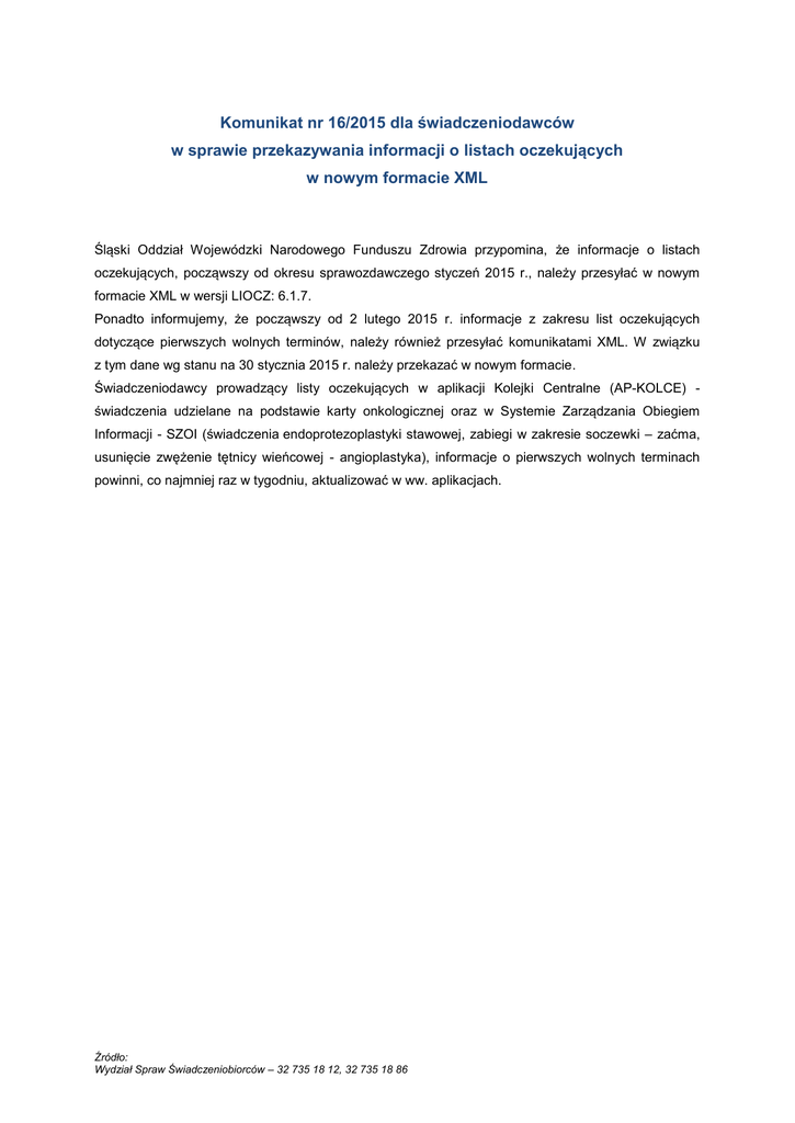 Komunikat nr 16/2015 dla świadczeniodawców w sprawie przekazywania informacji o listach oczekujących w nowym formacie XML Śląski Oddział Wojewódzki Narodowego Funduszu Zdrowia przypomina, że informacje o listach oczekujących, począwszy od okresu sprawozdawczego styczeń 2015 r., należy przesyłać w nowym formacie XML w wersji LIOCZ: 6.1.7. Ponadto informujemy, że począwszy od 2 lutego 2015 r. informacje z zakresu list oczekujących dotyczące pierwszych wolnych terminów, należy również przesyłać komunikatami XML. W związku z tym dane wg stanu na 30 stycznia 2015 r. należy przekazać w nowym formacie. Świadczeniodawcy prowadzący listy oczekujących w aplikacji Kolejki Centralne (AP-KOLCE) świadczenia udzielane na podstawie karty onkologicznej oraz w Systemie Zarządzania Obiegiem Informacji - SZOI (świadczenia endoprotezoplastyki stawowej, zabiegi w zakresie soczewki – zaćma, usunięcie zwężenie tętnicy wieńcowej - angioplastyka), informacje o pierwszych wolnych terminach powinni, co najmniej raz w tygodniu, aktualizować w ww. aplikacjach. Źródło: Wydział Spraw Świadczeniobiorców – 32 735 18 12, 32 735 18 86