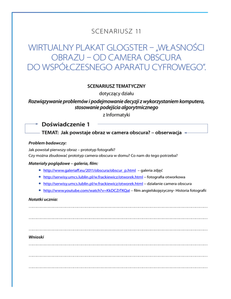 SCENARIUSZ 11 WIRTUALNY PLAKAT GLOGSTER – „WŁASNOŚCI OBRAZU – OD CAMERA OBSCURA DO WSPÓŁCZESNEGO APARATU CYFROWEGO”. SCENARIUSZ TEMATYCZNY dotyczący działu Rozwiązywanie problemów i podejmowanie decyzji z wykorzystaniem komputera, stosowanie podejścia algorytmicznego z Informatyki Doświadczenie 1 TEMAT: Jak powstaje obraz w camera obscura? – obserwacja Problem badawczy: Jak powstał pierwszy obraz – prototyp fotografii? Czy można zbudować prototyp camera obscura w domu? Co nam do tego potrzeba? Materiały poglądowe – galeria, film: yy http://www.galeriaff.eu/2011/obscura/obscur_p.html – galeria zdjęć yy http://serwisy.umcs.lublin.pl/w.frackiewicz/otworek.html – fotografia otworkowa yy http://serwisy.umcs.lublin.pl/w.frackiewicz/otworek.html – działanie camera obscura yy http://www.youtube.com/watch?v=KkDCZrTKQaI – film angielskojęzyczny- Historia fotografii Notatki ucznia: …………………………………………………………………………………………………………………… …………………………………………………………………………………………………………………… …………………………………………………………………………………………………………………… Wnioski …………………………………………………………………………………………………………………… …………………………………………………………………………………………………………………… ……………………………………………………………………………………………………………………