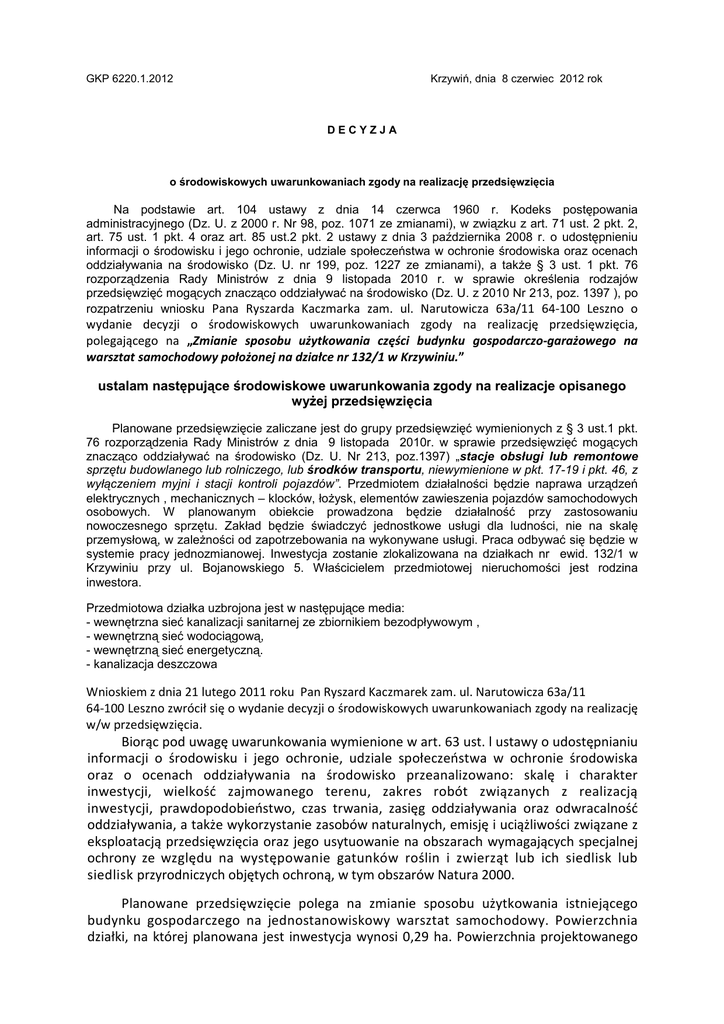 GKP 6220.1.2012 Krzywiń, dnia 8 czerwiec 2012 rok DECYZJA o środowiskowych uwarunkowaniach zgody na realizację przedsięwzięcia Na podstawie art. 104 ustawy z dnia 14 czerwca 1960 r. Kodeks postępowania administracyjnego (Dz. U. z 2000 r. Nr 98, poz. 1071 ze zmianami), w związku z art. 71 ust. 2 pkt. 2, art. 75 ust. 1 pkt. 4 oraz art. 85 ust.2 pkt. 2 ustawy z dnia 3 października 2008 r. o udostępnieniu informacji o środowisku i jego ochronie, udziale społeczeństwa w ochronie środowiska oraz ocenach oddziaływania na środowisko (Dz. U. nr 199, poz. 1227 ze zmianami), a także § 3 ust. 1 pkt. 76 rozporządzenia Rady Ministrów z dnia 9 listopada 2010 r. w sprawie określenia rodzajów przedsięwzięć mogących znacząco oddziaływać na środowisko (Dz. U. z 2010 Nr 213, poz. 1397 ), po rozpatrzeniu wniosku Pana Ryszarda Kaczmarka zam. ul. Narutowicza 63a/11 64-100 Leszno o wydanie decyzji o środowiskowych uwarunkowaniach zgody na realizację przedsięwzięcia, polegającego na „Zmianie sposobu użytkowania części budynku gospodarczo-garażowego na warsztat samochodowy położonej na działce nr 132/1 w Krzywiniu.” ustalam następujące środowiskowe uwarunkowania zgody na realizacje opisanego wyżej przedsięwzięcia Planowane przedsięwzięcie zaliczane jest do grupy przedsięwzięć wymienionych z § 3 ust.1 pkt. 76 rozporządzenia Rady Ministrów z dnia 9 listopada 2010r. w sprawie przedsięwzięć mogących znacząco oddziaływać na środowisko (Dz. U. Nr 213, poz.1397) „stacje obsługi lub remontowe sprzętu budowlanego lub rolniczego, lub środków transportu, niewymienione w pkt. 17-19 i pkt. 46, z wyłączeniem myjni i stacji kontroli pojazdów”. Przedmiotem działalności będzie naprawa urządzeń elektrycznych , mechanicznych – klocków, łożysk, elementów zawieszenia pojazdów samochodowych osobowych. W planowanym obiekcie prowadzona będzie działalność przy zastosowaniu nowoczesnego sprzętu. Zakład będzie świadczyć jednostkowe usługi dla ludności, nie na skalę przemysłową, w zależności od zapotrzebowania na wykonywane usługi. Praca odbywać się będzie w systemie pracy jednozmianowej. Inwestycja zostanie zlokalizowana na działkach nr ewid. 132/1 w Krzywiniu przy ul. Bojanowskiego 5. Właścicielem przedmiotowej nieruchomości jest rodzina inwestora. Przedmiotowa działka uzbrojona jest w następujące media: - wewnętrzna sieć kanalizacji sanitarnej ze zbiornikiem bezodpływowym , - wewnętrzną sieć wodociągową, - wewnętrzną sieć energetyczną. - kanalizacja deszczowa Wnioskiem z dnia 21 lutego 2011 roku Pan Ryszard Kaczmarek zam. ul. Narutowicza 63a/11 64-100 Leszno zwrócił się o wydanie decyzji o środowiskowych uwarunkowaniach zgody na realizację w/w przedsięwzięcia. Biorąc pod uwagę uwarunkowania wymienione w art. 63 ust. l ustawy o udostępnianiu informacji o środowisku i jego ochronie, udziale społeczeństwa w ochronie środowiska oraz o ocenach oddziaływania na środowisko przeanalizowano: skalę i charakter inwestycji, wielkość zajmowanego terenu, zakres robót związanych z realizacją inwestycji, prawdopodobieństwo, czas trwania, zasięg oddziaływania oraz odwracalność oddziaływania, a także wykorzystanie zasobów naturalnych, emisję i uciążliwości związane z eksploatacją przedsięwzięcia oraz jego usytuowanie na obszarach wymagających specjalnej ochrony ze względu na występowanie gatunków roślin i zwierząt lub ich siedlisk lub siedlisk przyrodniczych objętych ochroną, w tym obszarów Natura 2000. Planowane przedsięwzięcie polega na zmianie sposobu użytkowania istniejącego budynku gospodarczego na jednostanowiskowy warsztat samochodowy. Powierzchnia działki, na której planowana jest inwestycja wynosi 0,29 ha. Powierzchnia projektowanego warsztatu wyniesie około 60 m 2 . Komunikacja odbywać się będzie z drogi gminnej. W warsztacie wykonywane będą usługi z zakresu diagnostyki i mechaniki pojazdowej oraz naprawy urządzeń elektrycznych. Nie przewiduje się wymiany olejów. Warsztat wyposażony będzie w urządzenia diagnostyczne, podnośnik elektryczny, prasę hydrauliczną. Planuje się naprawę około 2 pojazdów dziennie. Na terenie zakładu pracować będzie jedna osoba. Planowane przedsięwzięcie zaopatrywane będzie w wodę z gminnej sieci wodociągowej. Ścieki bytowe odprowadzane będą do bezodpływowego zbiornika, a następnie wywożone przez koncesjonowanego przewoźnika do oczyszczalni ścieków. Wody opadowe i roztopowe z dachów odprowadzane będą do gminnej kanalizacji deszczowej. Wody opadowe z terenów wokół inwestycji odprowadzane będą powierzchniowo do gruntu. Odpady magazynowane będą selektywnie w wyznaczonych miejscach, a następnie przekazywane do odzysku lub unieszkodliwienia firmom posiadającym stosowne zezwolenia. Ponadto, w celu neutralizacji ewentualnych wycieków substancji zanieczyszczających w warsztacie stosowane będą sorbenty. W warsztacie wykonana zostanie również szczelna posadzka uniemożliwiająca przedostanie się zanieczyszczeń do gruntu. Inwestycja zlokalizowana jest w sąsiedztwie terenów rolnych oraz drogi gminnej. Najbliższa zabudowa mieszkaniowa znajduje się w odległości około 60 m od planowanej inwestycji. Praca odbywać się będzie w systemie pracy jednozmianowej w godzinach od 8 do 16 i nie przekroczy 8 godzin na dobę. Warsztat czynny będzie wyłącznie w porze dziennej. Inwestor oświadczył, że wszelkie prace powodujące emisję hałasu wykonywane będą wewnątrz budynku. Biorąc pod uwagę powyższe oraz skalę inwestycji nie przewiduje się znaczącego zwiększenia poziomu hałasu w środowisku, a co za tym idzie przekroczenia akustycznych standardów jakości środowiska. Stwierdzono także, iż oddziaływanie planowanego przedsięwzięcia nie będzie miało istotnego wpływu na stan powietrza w rejonie inwestycji. W związku z zapisami art. 63 ust. l pkt l lit. c i ę ustawy o udostępnian