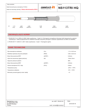 Nazwa Opis produktu Kabel koncentryczny wewnętrzny 75 Ohm Kabel do transmisji cyfrowej ( Ø 1,13 (Cu) NS113TRI HQ klasa ekranowania A/A+) 4,80 (PEG) 4,90 (Al/PET) 5,50 (Al) 5,60 (Al/PET) 6,80 (PVC) OBOWIĄZUJĄCE NORMY 1. PN-EN 50117-2-4: 2005+A1:2008. Kable współosiowe - Część 2-4: Wymagania szczegółowe dotyczące kabli stosowanych w sieciach rozdzielczych - Kable przyłączeniowe do układania wewnątrz budynków pracujące w zakresie częstotliwości od 5MHz do 3000MHz. 2. PN-EN 50117-1:2003+A1: 2007. Kable współosiowe - Część 1: Wymagania ogólne. DANE TECHNICZNE Żyła wewnętrzna miedziana (Cu) 1,13 ± 0,02 mm Dielektryk spieniany fizycznie polietylen (PEG) 4,80 ± 0,02 mm Ekran folia aluminium/PET (Al/PET) 0,04mm Oplot drut aluminiowy (gęsto pleciony) (Al) 144x0,12mm Optyczne pokrycie oplotem 98% Ekran folia aluminium/PET (Al/PET) 0,04mm Otulina zewnętrzna PVC biały (PVC) 6,8mm Temperatura pracy -20ºC ÷ +70ºC Temperatura układania 0ºC ÷ +70ºC Minimalny promień gięcia [x śred. kabla] >8 Novisat sp. z o.o. ul. Zaporoska 37B 53-519 Wrocław Polska tel.+4871 799 09 34 Data 2015-05-19 mail: [email protected] Strona 2 Nazwa Opis produktu Kabel koncentryczny wewnętrzny 75 Ohm Kabel do transmisji cyfrowej ( NS113TRI HQ klasa ekranowania A/A+) DANE ELEKTRYCZNE Impedancja charakterystyczna (przy częstotliwości 200MHz) 75 ± 3 Ohm Pojemność jednostkowa 50,3 ± 2 pF/m Skuteczna przenikalność dielektryczna Ɛ < 2,2 Tłumienność echa własnego ≥ 40dB Tłumienność kabla (przy częstotliwości 200MHz) ≤ 20dB/100m Współczynnik skuteczności ekranowania 30-1000 [Mhz] ≥ 85 Współczynnik skuteczności ekranowania 1500-2200 [Mhz] ≥75 NS113TRI 60 Insertion loss (dB/100m) at 20°C 50 40 30 NS113TRI 20 10 0 0 0,5 1 1,5 2 Frequency (GHz, 5MHz - 2,4GHz ) Rysunek 1: Tłumienie kabla w przedziale częstotliwości 5-2400MHz Novisat sp. z o.o. ul. Zaporoska 37B 53-519 Wrocław Polska tel.+4871 799 09 34 Data 2015-05-19 mail: [email protected] Strona 3 Nazwa Opis produktu Kabel koncentryczny wewnętrzny 75 Ohm Kabel do transmisji cyfrowej ( klasa ekranowania A/A+) NS113TRI HQ Rysunek 1: Przebieg przebieg zmian fazy w funkcji częstotliwości Rysunek 2: Tłumienność kabla NS113 TRI Rysunek 3: Tłumienność odbiciowa kabla NS113 TRI - port 1 Rysunek 3: Tłumienność odbiciowa kabla NS113 TRI - port 2 PRODUKTY POWIĄZANE Złącze typu F 6,8mm nakręcane Złącze typu F podwójne ( tzw. beczka) Złącze typu F 6,8 mm zaciskanie (w sześciokąt) Zaciskarka do złącz typu F zaciskanych Klucz do złącz typu F Novisat sp. z o.o. ul. Zaporoska 37B 53-519 Wrocław Polska tel.+4871 799 09 34 Data 2015-05-19 mail: [email protected] Strona 3