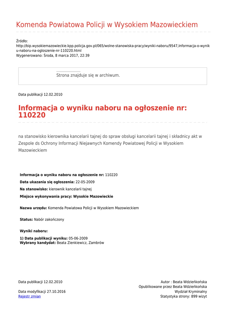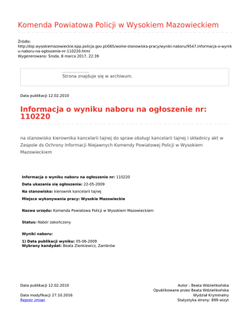 Komenda Powiatowa Policji w Wysokiem Mazowieckiem Źródło: http://bip.wysokiemazowieckie.kpp.policja.gov.pl/065/wolne-stanowiska-pracy/wyniki-naboru/9547,Informacja-o-wynik u-naboru-na-ogloszenie-nr-110220.html Wygenerowano: Środa, 8 marca 2017, 22:39 Strona znajduje się w archiwum. Data publikacji 12.02.2010 Informacja o wyniku naboru na ogłoszenie nr: 110220 na stanowisko kierownika kancelarii tajnej do spraw obsługi kancelarii tajnej i składnicy akt w Zespole ds Ochrony Informacji Niejawnych Komendy Powiatowej Policji w Wysokiem Mazowieckiem Informacja o wyniku naboru na ogłoszenie nr: 110220 Data ukazania się ogłoszenia: 22-05-2009 Na stanowisko: kierownik kancelarii tajnej Miejsce wykonywania pracy: Wysokie Mazowieckie Nazwa urzędu: Komenda Powiatowa Policji w Wysokiem Mazowieckiem Status: Nabór zakończony Wyniki naboru: 1) Data publikacji wyniku: 05-06-2009 Wybrany kandydat: Beata Zienkiewicz, Zambrów Data publikacji 12.02.2010 Data modyfikacji 27.10.2016 Rejestr zmian Autor : Beata Wdzieńkońska Opublikowane przez Beata Wdzieńkońska Wydział Kryminalny Statystyka strony: 899 wizyt