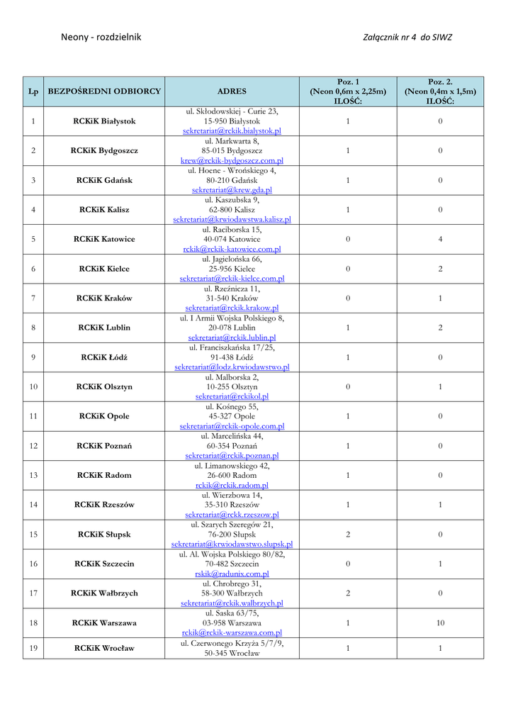 Neony - rozdzielnik Lp BEZPOŚREDNI ODBIORCY 1 RCKiK Białystok 2 RCKiK Bydgoszcz 3 RCKiK Gdańsk 4 RCKiK Kalisz 5 RCKiK Katowice 6 RCKiK Kielce 7 RCKiK Kraków 8 RCKiK Lublin 9 RCKiK Łódź 10 RCKiK Olsztyn 11 RCKiK Opole 12 RCKiK Poznań 13 RCKiK Radom 14 RCKiK Rzeszów 15 RCKiK Słupsk 16 RCKiK Szczecin 17 RCKiK Wałbrzych 18 RCKiK Warszawa 19 RCKiK Wrocław Załącznik nr 4 do SIWZ ADRES ul. Skłodowskiej - Curie 23, 15-950 Białystok [email protected] ul. Markwarta 8, 85-015 Bydgoszcz [email protected] ul. Hoene - Wrońskiego 4, 80-210 Gdańsk [email protected] ul. Kaszubska 9, 62-800 Kalisz [email protected] ul. Raciborska 15, 40-074 Katowice [email protected] ul. Jagielońska 66, 25-956 Kielce [email protected] ul. Rzeźnicza 11, 31-540 Kraków [email protected] ul. I Armii Wojska Polskiego 8, 20-078 Lublin [email protected] ul. Franciszkańska 17/25, 91-438 Łódź [email protected] ul. Malborska 2, 10-255 Olsztyn [email protected] ul. Kośnego 55, 45-327 Opole [email protected] ul. Marcelińska 44, 60-354 Poznań [email protected] ul. Limanowskiego 42, 26-600 Radom [email protected] ul. Wierzbowa 14, 35-310 Rzeszów [email protected] ul. Szarych Szeregów 21, 76-200 Słupsk [email protected] ul. Al. Wojska Polskiego 80/82, 70-482 Szczecin [email protected] ul. Chrobrego 31, 58-300 Wałbrzych [email protected] ul. Saska 63/75, 03-958 Warszawa [email protected] ul. Czerwonego Krzyża 5/7/9, 50-345 Wrocław Poz. 1 (Neon 0,6m x 2,25m) ILOŚĆ: Poz. 2. (Neon 0,4m x 1,5m) ILOŚĆ: 1 0 1 0 1 0 1 0 0 4 0 2 0 1 1 2 1 0 0 1 1 0 1 0 1 0 1 1 2 0 0 1 2 0 1 10 1 1 Neony - rozdzielnik Załącznik nr 4 do SIWZ [email protected] 20 21 22 23 RCKiK Zielona Góra Wojskowe Centrum Krwiodawstwa i Krwiolecznictwa Centrum Krwiodawstwa i Krwiolecznictwa Ministerstwa Spraw Wewnętrznych Instytut Hematologii i Transfuzjologii ul Zyty 21, 65-046 Zielona Góra [email protected] ul. Koszykowa 78 00-671 Warszawa 1 [email protected] ul. Wołoska 137 02-507 Warszawa [email protected] ul. Indiry Gandhi 14 02-776 Warszawa [email protected] Łącznie: 1 0 1 0 0 1 1 0 19 24