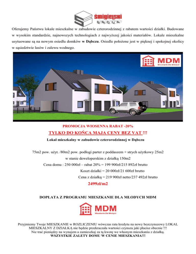 Oferujemy Państwu lokale mieszkalne w zabudowie czterorodzinnej z rabatem wartości działki. Budowane w wysokim standardzie, najnowszych technologiach z najwyższej jakości materiałów. Lokale mieszkalne usytuowane są na nowym osiedlu domków w Dąbczu. Osiedle położone jest w pięknej i spokojnej okolicy w sąsiedztwie lasów i zalewu wodnego. PROMOCJA WIOSENNA RABAT -20% TYLKO DO KOŃCA MAJA CENY BEZ VAT !!! Lokal mieszkalny w zabudowie czterorodzinnej w Dąbczu 75m2 pow. użyt. /80m2 pow. podłogi parter z poddaszem + strych użytkowy 25m2 w stanie deweloperskim z działką 150m2 Cena domu : 250 000zł – rabat 20% = 199 900zł/215 892zł brutto Koszt działki = 20 000zł/21 600zł brutto Cena z działką = 219 900zł netto/237 492zł brutto 2499zł/m2 DOPŁATA Z PROGRAMU MIESZKANIE DLA MŁODYCH MDM Przyjmiemy Twoje MIESZKANIE w ROZLICZENIU wówczas rata kredytu na nowy bezczynszowy LOKAL MIESZKALNY Z DZIAŁKĄ nie będzie przekraczała wartości czynszu jaki płacisz obecnie !!! Nie trać pieniędzy na wynajem a zamieszkaj za tą kwotę we własnym mieszkaniu z działką. WSZYSTKIE ZALETY DOMU W CENIE MIESZKANIA!!! I Standard wykończenia: 219 900zł netto/237 492zł brutto fundament beton B20 zbrojony stalą ściany fundamentowe bloczki betonowe M6+ styropian Aqua (gr 5cm) instalacja kominkowa z wybudowanym kominem ceramicznym przygotowanym do podłączenia kominka ściany konstrukcyjne zewnętrzne Pustak ceramiczny (gr 24 cm) + styropian (gr 20cm) konstrukcja dachu - dachówka betonowa BRAAS - kolor antracyt stolarka okienna PCV profil VEKA w okleinach kolor antracyt z zewnątrz rolety zewnętrzne nadstawne PORTOS w kolorze antracyt (ocieplane) drzwi zewnętrzne Setto Diego w okleinie antracyt (ocieplane) wraz z progiem i ościeżnicą termo brama garażowa KRISPOL w kolorze antracyt (ocieplana) podnoszona ręcznie lub okno + roleta elewacja zewnętrzna w kolorze AKRES PUC przyłącza elektryczne doprowadzone do budynku przyłącza wodno-kanalizacyjne doprowadzone do budynku wylana pierwsza posadzka z wyprowadzonymi przyłączami wodno – kanalizacyjnymi ściany konstrukcyjne wewnętrzne (gr 24 cm) strop betonowy TERIVA ścianki wewnętrzne (gr 12 cm) zgodnie z projektem instalacja elektryczna (bez włączników i lamp) instalacja wodna i grzewcza ogrzewanie podłogowe w łazienkach i wiatrołapie tynki wewnętrzne gipsowe nakładane mechanicznie zacierane na mokro nie malowane parapety wewnętrzne MDF posadzka końcowa z ociepleniem ocieplenie dachówki wełną mineralną 25cm, zamknięcie płytą STG II standard wykończenia stan deweloperski Plus - dopłata 10 000zł netto/10 800zł brutto piec gazowy kondensacyjny Buderus z zasobnikiem 45l, oraz grzejni Buderus instalacja gazowa z podłączeniem i uruchomieniem pieca III standard wykończenia - dopłata 10 000zł netto/10 800zł brutto drzwi tarasowe Patio z mechanizmem otwierania uchylno-przesuwanym okna z pakietem trzy szybowym VEKA Perfect Line rolety okienne z napędem elektrycznym silnik elektryczny do bramy garażowej z dwoma pilotami zagospodarowanie podłogi poddasz płytą OSB(2,5cm) oraz schody strychowe Fakro taras z kostki betonowej dodatkowe przyłącze wody ogrodowej odprowadzenie wody deszczowej Dodatkowo GRATIS! ogrodzenie zgodnie ze standardem przyjętym na osiedlu kostka na szerokości podjazdu do garażu i wejściu do domu zgodnie ze standardem przyjętym na osiedlu zagospodarowanie działki z uzupełnieniem ziemi z wyjątkiem końcowej ziemi ogrodowej *Możliwość wykończenia domu pod klucz Warunki płatności * 10 000zł wpłata przy podpisaniu umowy rezerwacyjnej * płatność po wybudowaniu stanu zerowego budynku * płatność po wybudowaniu ścian parteru budynku * płatność po wylaniu stropu i wybudowaniu ścian poddasza budynku * płatność po pozostałej wartości umowy po położeniu dachówki * płatność po pozostałej wartości umowy po zakończeniu elewacji zewnętrznej budynku * płatność po zakończeniu prac stanu deweloperskiego Płatność poszczególnych rat w terminie 14 dni po otrzymaniu informacji i wizycie sprawdzającej wykonanie danego etapu. *Możliwość negocjacji oferty przy zakupie gotówkowym (płatnym jednorazowo) po podpisaniu umowy przedwstępnej. *Powyższy opis ma charakter informacyjny i nie stanowi oferty w rozumieniu Kodeku Cywilnego Art. 66. § 1.
