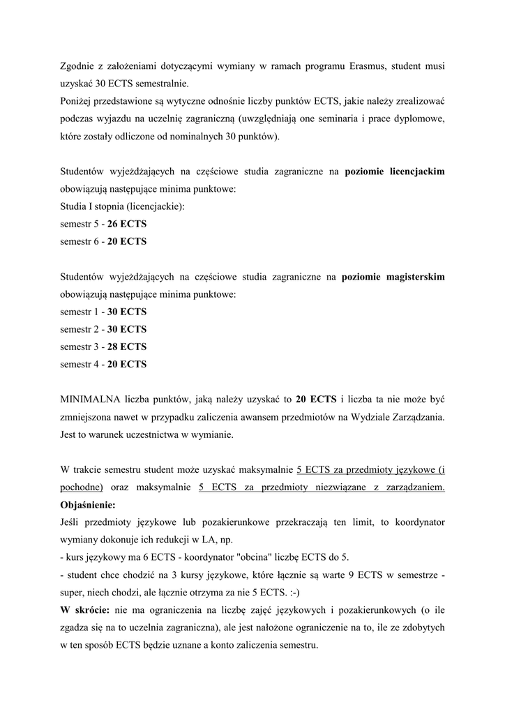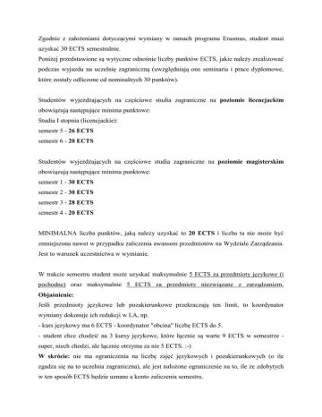 Zgodnie z założeniami dotyczącymi wymiany w ramach programu Erasmus, student musi uzyskać 30 ECTS semestralnie. Poniżej przedstawione są wytyczne odnośnie liczby punktów ECTS, jakie należy zrealizować podczas wyjazdu na uczelnię zagraniczną (uwzględniają one seminaria i prace dyplomowe, które zostały odliczone od nominalnych 30 punktów). Studentów wyjeżdżających na częściowe studia zagraniczne na poziomie licencjackim obowiązują następujące minima punktowe: Studia I stopnia (licencjackie): semestr 5 - 26 ECTS semestr 6 - 20 ECTS Studentów wyjeżdżających na częściowe studia zagraniczne na poziomie magisterskim obowiązują następujące minima punktowe: semestr 1 - 30 ECTS semestr 2 - 30 ECTS semestr 3 - 28 ECTS semestr 4 - 20 ECTS MINIMALNA liczba punktów, jaką należy uzyskać to 20 ECTS i liczba ta nie może być zmniejszona nawet w przypadku zaliczenia awansem przedmiotów na Wydziale Zarządzania. Jest to warunek uczestnictwa w wymianie. W trakcie semestru student może uzyskać maksymalnie 5 ECTS za przedmioty językowe (i pochodne) oraz maksymalnie 5 ECTS za przedmioty niezwiązane z zarządzaniem. Objaśnienie: Jeśli przedmioty językowe lub pozakierunkowe przekraczają ten limit, to koordynator wymiany dokonuje ich redukcji w LA, np. - kurs językowy ma 6 ECTS - koordynator "obcina" liczbę ECTS do 5. - student chce chodzić na 3 kursy językowe, które łącznie są warte 9 ECTS w semestrze super, niech chodzi, ale łącznie otrzyma za nie 5 ECTS. :-) W skrócie: nie ma ograniczenia na liczbę zajęć językowych i pozakierunkowych (o ile zgadza się na to uczelnia zagraniczna), ale jest nałożone ograniczenie na to, ile ze zdobytych w ten sposób ECTS będzie uznane a konto zaliczenia semestru.