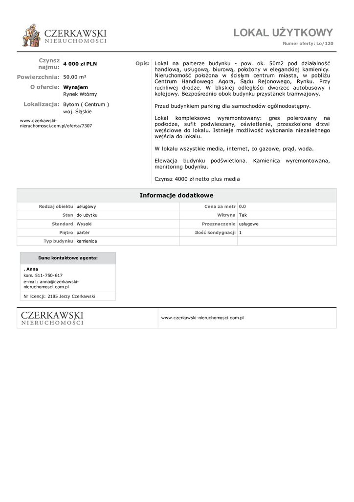 LOKAL UŻYTKOWY Numer oferty: Lo/120 Czynsz 4 000 zł PLN najmu: Powierzchnia: 50.00 m² O ofercie: Wynajem Rynek Wtórny Lokalizacja: Bytom ( Centrum ) woj. Śląskie www.czerkawskinieruchomosci.com.pl/oferta/7307 Opis: Lokal na parterze budynku - pow. ok. 50m2 pod działalność handlową, usługową, biurową, położony w eleganckiej kamienicy. Nieruchomość położona w ścisłym centrum miasta, w pobliżu Centrum Handlowego Agora, Sądu Rejonowego, Rynku. Przy ruchliwej drodze. W bliskiej odległości dworzec autobusowy i kolejowy. Bezpośrednio obok budynku przystanek tramwajowy. Przed budynkiem parking dla samochodów ogólnodostępny. Lokal kompleksowo wyremontowany: gres polerowany na podłodze, sufit podwieszany, oświetlenie, przeszkolone drzwi wejściowe do lokalu. Istnieje możliwość wykonania niezależnego wejścia do lokalu. W lokalu wszystkie media, internet, co gazowe, prąd, woda. Elewacja budynku podświetlona. monitoring budynku. Kamienica Czynsz 4000 zł netto plus media Informacje dodatkowe Rodzaj obiektu usługowy Stan do użytku Standard Wysoki Piętro parter Cena za metr 0.0 Witryna Tak Przeznaczenie usługowe Ilość kondygnacji 1 Typ budynku kamienica Dane kontaktowe agenta: . Anna kom. 511-750-617 e-mail: [email protected] Nr licencji: 2185 Jerzy Czerkawski www.czerkawski-nieruchomosci.com.pl wyremontowana,