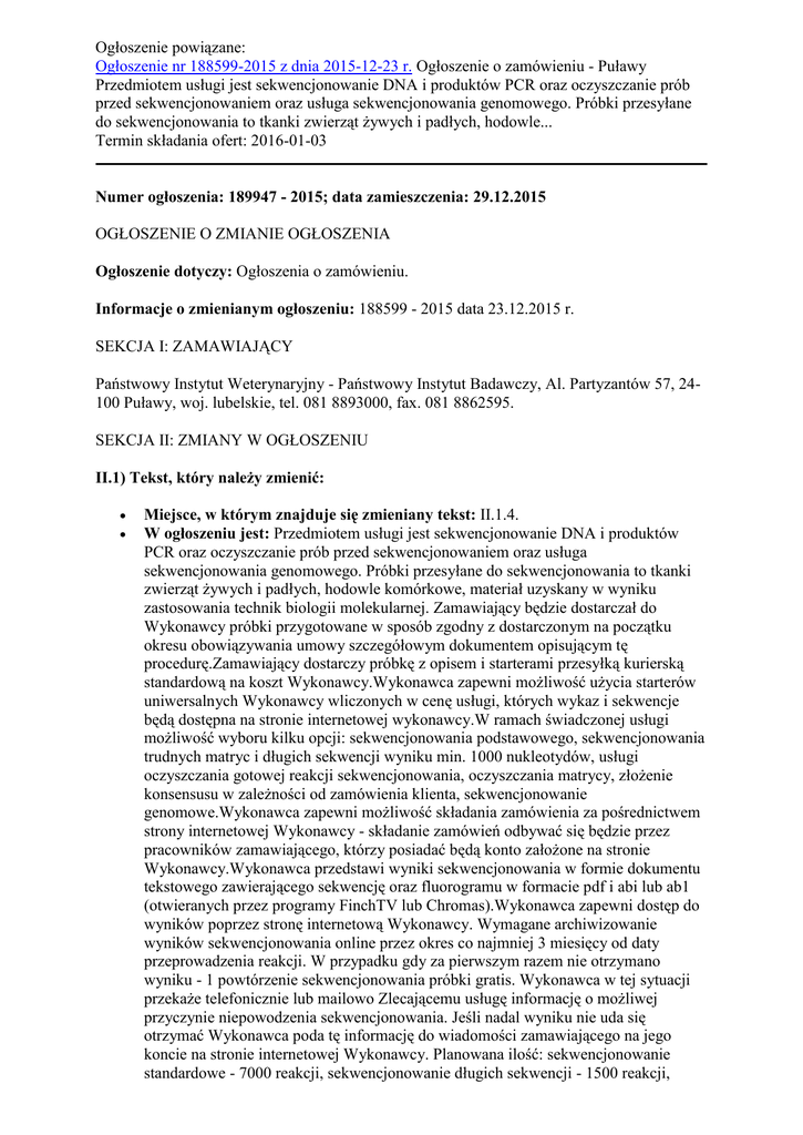 Ogłoszenie powiązane: Ogłoszenie nr 188599-2015 z dnia 2015-12-23 r. Ogłoszenie o zamówieniu - Puławy Przedmiotem usługi jest sekwencjonowanie DNA i produktów PCR oraz oczyszczanie prób przed sekwencjonowaniem oraz usługa sekwencjonowania genomowego. Próbki przesyłane do sekwencjonowania to tkanki zwierząt żywych i padłych, hodowle... Termin składania ofert: 2016-01-03 Numer ogłoszenia: 189947 - 2015; data zamieszczenia: 29.12.2015 OGŁOSZENIE O ZMIANIE OGŁOSZENIA Ogłoszenie dotyczy: Ogłoszenia o zamówieniu. Informacje o zmienianym ogłoszeniu: 188599 - 2015 data 23.12.2015 r. SEKCJA I: ZAMAWIAJĄCY Państwowy Instytut Weterynaryjny - Państwowy Instytut Badawczy, Al. Partyzantów 57, 24100 Puławy, woj. lubelskie, tel. 081 8893000, fax. 081 8862595. SEKCJA II: ZMIANY W OGŁOSZENIU II.1) Tekst, który należy zmienić: Miejsce, w którym znajduje się zmieniany tekst: II.1.4. W ogłoszeniu jest: Przedmiotem usługi jest sekwencjonowanie DNA i produktów PCR oraz oczyszczanie prób przed sekwencjonowaniem oraz usługa sekwencjonowania genomowego. Próbki przesyłane do sekwencjonowania to tkanki zwierząt żywych i padłych, hodowle komórkowe, materiał uzyskany w wyniku zastosowania technik biologii molekularnej. Zamawiający będzie dostarczał do Wykonawcy próbki przygotowane w sposób zgodny z dostarczonym na początku okresu obowiązywania umowy szczegółowym dokumentem opisującym tę procedurę.Zamawiający dostarczy próbkę z opisem i starterami przesyłką kurierską standardową na koszt Wykonawcy.Wykonawca zapewni możliwość użycia starterów uniwersalnych Wykonawcy wliczonych w cenę usługi, których wykaz i sekwencje będą dostępna na stronie internetowej wykonawcy.W ramach świadczonej usługi możliwość wyboru kilku opcji: sekwencjonowania podstawowego, sekwencjonowania trudnych matryc i długich sekwencji wyniku min. 1000 nukleotydów, usługi oczyszczania gotowej reakcji sekwencjonowania, oczyszczania matrycy, złożenie konsensusu w zależności od zamówienia klienta, sekwencjonowanie genomowe.Wykonawca zapewni możliwość składania zamówienia za pośrednictwem strony internetowej Wykonawcy - składanie zamówień odbywać się będzie przez pracowników zamawiającego, którzy posiadać będą konto założone na stronie Wykonawcy.Wykonawca przedstawi wyniki sekwencjonowania w formie dokumentu tekstowego zawierającego sekwencję oraz fluorogramu w formacie pdf i abi lub ab1 (otwieranych przez programy FinchTV lub Chromas).Wykonawca zapewni dostęp do wyników poprzez stronę internetową Wykonawcy. Wymagane archiwizowanie wyników sekwencjonowania online przez okres co najmniej 3 miesięcy od daty przeprowadzenia reakcji. W przypadku gdy za pierwszym razem nie otrzymano wyniku - 1 powtórzenie sekwencjonowania próbki gratis. Wykonawca w tej sytuacji przekaże telefonicznie lub mailowo Zlecającemu usługę informację o możliwej przyczynie niepowodzenia sekwencjonowania. Jeśli nadal wyniku nie uda się otrzymać Wykonawca poda tę informację do wiadomości zamawiającego na jego koncie na stronie internetowej Wykonawcy. Planowana ilość: sekwencjonowanie standardowe - 7000 reakcji, sekwencjonowanie długich sekwencji - 1500 reakcji, oczyszczanie produktu PCR - 7000 szt., wykonanie dwóch reakcji sekwencjonowania, złożenie otrzymanych operacji w jeden konsensus - 600 operacji... W ogłoszeniu powinno być: Przedmiotem usługi jest sekwencjonowanie DNA i produktów PCR oraz oczyszczanie prób przed sekwencjonowaniem. Próbki przesyłane do sekwencjonowania to tkanki zwierząt żywych i padłych, hodowle komórkowe, materiał uzyskany w wyniku zastosowania technik biologii molekularnej. Zamawiający będzie dostarczał do Wykonawcy próbki przygotowane w sposób zgodny z dostarczonym na początku okresu obowiązywania umowy szczegółowym dokumentem opisującym tę procedurę.Zamawiający dostarczy próbkę z opisem i starterami przesyłką kurierską standardową na koszt Wykonawcy.Wykonawca zapewni możliwość użycia starterów uniwersalnych Wykonawcy wliczonych w cenę usługi, których wykaz i sekwencje będą dostępna na stronie internetowej wykonawcy.W ramach świadczonej usługi możliwość wyboru kilku opcji: sekwencjonowania podstawowego, sekwencjonowania trudnych matryc i długich sekwencji wyniku min. 1000 nukleotydów, usługi oczyszczania gotowej reakcji sekwencjonowania, oczyszczania matrycy, złożenie konsensusu w zależności od zamówienia klienta, sekwencjonowanie genomowe.Wykonawca zapewni możliwość składania zamówienia za pośrednictwem strony internetowej Wykonawcy - składanie zamówień odbywać się będzie przez pracowników zamawiającego, którzy posiadać będą konto założone na stronie Wykonawcy.Wykonawca przedstawi wyniki sekwencjonowania w formie dokumentu tekstowego zawierającego sekwencję oraz fluorogramu w formacie pdf i abi lub ab1 (otwieranych przez programy FinchTV lub Chromas).Wykonawca zapewni dostęp do wyników poprzez stronę internetową Wykonawcy. Wymagane archiwizowanie wyników sekwencjonowania online przez okres co najmniej 3 miesięcy od daty przeprowadzenia reakcji. W przypadku gdy za pierwszym razem nie otrzymano wyniku - 1 powtórzenie sekwencjonowania próbki gratis. Wykonawca w tej sytuacji przekaże telefonicznie lub mailowo Zlecającemu usługę informację o możliwej przyczynie niepowodzenia sekwencjonowania. Jeśli nadal wyniku nie uda się otrzymać Wykonawca poda tę informację do wiadomości zamawiającego na jego koncie na stronie internetowej Wykonawcy. Planowana ilość: sekwencjonowanie standardowe - 7000 reakcji, sekwencjonowanie długich sekwencji - 1500 reakcji, oczyszczanie produktu PCR - 7000 szt., wykonanie dwóch reakcji sekwencjonowania, złożenie otrzymanych operacji w jeden konsensus - 600 operacji...