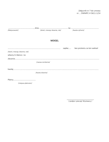 Załącznik nr 7 do umowy nr … DWMPC-V-5611-1/14 ….…………….............................., dnia ..................................................... na .................................................... /Miejscowość/ /dzień, miesiąc słownie, rok/ /kwota cyframi/ WEKSEL …………....................................................................................... zapłac….. bez protestu za ten weksel /dzień, miesiąc słownie, rok/ własny In blanco na zlecenie............................................................................................................................................................. /nazwa remitenta/ kwotę .............................................................................................................................................................. /kwota słownie/ Płatny……………………………………… /miejsce płatności/ ___________________________ / podpis i pieczęć Wystawcy /