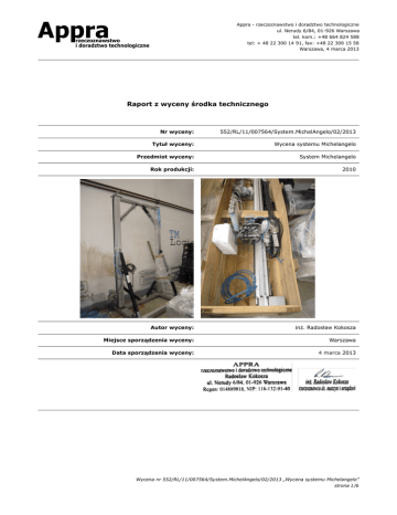 Appra Appra - rzeczoznawstwo i doradztwo technologiczne ul. Nerudy 6/84, 01-926 Warszawa tel. kom.: +48 664 824 588 tel: + 48 22 300 14 91, fax: +48 22 300 15 58 Warszawa, 4 marca 2013 rzeczoznawstwo i doradztwo technologiczne Raport z wyceny środka technicznego Nr wyceny: 552/RL/11/007564/System.MichelAngelo/02/2013 Tytuł wyceny: Wycena systemu Michelangelo Przedmiot wyceny: System Michelangelo Rok produkcji: 2010 Autor wyceny: inż. Radosław Kokosza Miejsce sporządzenia wyceny: Warszawa Data sporządzenia wyceny: 4 marca 2013 Wycena nr 552/RL/11/007564/System.MichelAngelo/02/2013 „Wycena systemu Michelangelo” strona 1 /6 Appra Appra - rzeczoznawstwo i doradztwo technologiczne ul. Nerudy 6/84, 01-926 Warszawa tel. kom.: +48 664 824 588 tel: + 48 22 300 14 91, fax: +48 22 300 15 58 Warszawa, 4 marca 2013 rzeczoznawstwo i doradztwo technologiczne 1. Zamawiający Firma: Raiffeisen-Leasing Polska S.A. Ulica: ul. Prosta 51 Kod, miasto: 00-838, Warszawa 2. Data i miejsce oględzin Data oględzin: 19 lutego 2013 Lokalizacja: TM Logic Ulica: Grodziska 15 Kod, miasto: 05-870, Błonie 3. Cel wyceny Celem wyceny jest wg zlecenia z dnia 15.02.2013r. oszacowanie wartości rynkowej i wartości przy sprzedaży wymuszonej systemu Michelangelo, wyprodukowanego w roku: 2010, poddanego oględzinom w magazynie TM Logic w Błoniach. Wartość szacowana jest dla potrzeb windykacyjnych w firmie Raiffeisen-Leasing Polska S.A. Wycena nr 552/RL/11/007564/System.MichelAngelo/02/2013 „Wycena systemu Michelangelo” strona 2 /6 Appra Appra - rzeczoznawstwo i doradztwo technologiczne ul. Nerudy 6/84, 01-926 Warszawa tel. kom.: +48 664 824 588 tel: + 48 22 300 14 91, fax: +48 22 300 15 58 Warszawa, 4 marca 2013 rzeczoznawstwo i doradztwo technologiczne 4. Uwagi dodatkowe System Michelangelo został poddany oględzinom dnia 15.02.2013r. Podczas oględzin sprzęt znajdował się na terenie hali magazynowej przy ul. Grodziska 15 w Błoniach. Próba rozruchowa została przeprowadzona - system był zdemontowany. Rzeczoznawcy, podczas oględzin, nie okazano dokumentacji z deklaracją zgodności CE. Tabliczki znamionowe i inne oznakowanie Wyceniany system nie posiada tabliczki znamionowej - kontroler Art Robo oznakowany jest tabliczką znamionową - nie jest to tabliczka całego systemu. Fot. 1 Wycena nr 552/RL/11/007564/System.MichelAngelo/02/2013 „Wycena systemu Michelangelo” strona 3 /6 Appra Appra - rzeczoznawstwo i doradztwo technologiczne ul. Nerudy 6/84, 01-926 Warszawa tel. kom.: +48 664 824 588 tel: + 48 22 300 14 91, fax: +48 22 300 15 58 Warszawa, 4 marca 2013 rzeczoznawstwo i doradztwo technologiczne Nazwa środka technicznego: System drukujący Michelangelo Rok produkcji środka technicznego: 2010 Numer seryjny: brak danych Skrócony opis: System drukujący przeznaczony do drukowania bezpośrednio na dużych, nierównych powierzchniach np. maskach samochodowych, i innych powierzchniach o maksymalnej wielkości 180x200 cm. Tabela nr 1 Lp. Specyfikacja wyposażenia 1 Producent/dystrybutor: CTG 2 Typ: 3 Kraj pochodzenia: 4 Rok produkcji: 5 Numer seryjny: 6 Podstawa: 180 cm 7 Wysokość: 200 cm 8 Nierówność poziomów: 20 cm 9 Jednostka drukująca: CMYK 10 Kontroler: Michelangelo Evolution 1,8h 200 Włochy 2010 brak danych Art Robo (Lac Corporation) Tabela nr 2 Wycena nr 552/RL/11/007564/System.MichelAngelo/02/2013 „Wycena systemu Michelangelo” strona 4 /6 Appra rzeczoznawstwo i doradztwo technologiczne Appra - rzeczoznawstwo i doradztwo technologiczne ul. Nerudy 6/84, 01-926 Warszawa tel. kom.: +48 664 824 588 tel: + 48 22 300 14 91, fax: +48 22 300 15 58 Warszawa, 4 marca 2013 Załącznik nr 1 Wycena nr 552/RL/11/007564/System.MichelAngelo/02/2013 „Wycena systemu Michelangelo” strona 5 /6 Appra rzeczoznawstwo i doradztwo technologiczne Appra - rzeczoznawstwo i doradztwo technologiczne ul. Nerudy 6/84, 01-926 Warszawa tel. kom.: +48 664 824 588 tel: + 48 22 300 14 91, fax: +48 22 300 15 58 Warszawa, 4 marca 2013 Wycena nr 552/RL/11/007564/System.MichelAngelo/02/2013 „Wycena systemu Michelangelo” strona 6 /6
