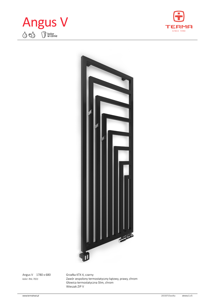 Angus V kolor w cenie Angus V 1780 x 680 kolor: RAL 7021 www.termaheat.pl Grzałka KTX 4, czarny Zawór zespolony termostatyczny kątowy, prawy, chrom Głowica termostatyczna Slim, chrom Wieszak ZIP V 20150715wolka strona 1 z 5 Angus V kolor w cenie projekt: Artes Design Podłączenia: Polecamy: afop(n)(m) (u)(t)(s)(E)(F)(e) (d)(b)(G)(H)(r)(q) (c) Zestaw trójosiowy termostatyczny z możliwością montażu grzałki przez zawór dla podłączenia SX Zestaw maskujący zintegrowany Grzałka REG 3 Dostępne rozmiary: 3 5 4 ↕ 1460 x 520 1300 x 440 1140 x 360 ↔ 6 7 1620 x 600 1780 x 680 Dane techniczne: Ciśnienie robocze: 0,8 MPa Maksymalna temperatura pracy: 95°C g p v A B C1 C2 75|65|20°C 55|45|20°C D E F ↕ ↔ [mm] [mm] [W] [W] [W] [mm] [mm] [mm] [dm³] [kg] 1140 360 50 320 421 219 400 320 960 90 5,18 11,20 Kod produktu Kod konfiguracji s. 4 WGANG114036 1300 440 50 400 557 291 600 400 1120 90 6,92 14,96 WGANG130044 1460 520 50 480 711 372 800 480 1280 90 8,88 19,20 WGANG146052 1620 600 50 560 905 477 1000 560 1440 90 11,07 23,93 WGANG162060 1780 680 50 640 1116 595 1200 640 1600 90 13,48 29,14 WGANG178068 www.termaheat.pl 20150715wolka strona 2 z 5 Angus V kolor w cenie SX ZX 57 ÷ 65 ZX C2 G1/2" 57 ÷ 65 2 x G1/2" 57 ÷ 65 SX G1/2" 57 ÷ 65 G1/2" G1/2" C1 2 x G1/2" B 57 ÷ 65 D C2 Y1 C1 G1/2" D 57 ÷ 65 B 57 ÷ 65 57 ÷ 65 2 x G1/2" C1 Y1 C1 G1/2" 57 ÷ 65 2 x G1/2" 57 ÷ 65 A E Y8 2 x G1/2" 57 ÷ 65 57 ÷ 65 A E G1/2" C1 Y8 G1/2" C1 F 72 ÷ 80 57 ÷ 65 42 ÷ 50 57 ÷ 65 F 2 x G1/2" 42 ÷ 50 72 ÷ 80 30 40 A – wysokość B – szerokość C1-C5 – rozstaw podłączeń D – rozstaw konsol w poziomie E – rozstaw konsol w pionie, F – odległość od osi dolnej konsoli do dolnej krawędzi kolektora Profil: 30 40 www.termaheat.pl 20150715wolka strona 3 z 5 Angus V kolor w cenie W tabelach przy kartach technicznych produktów umieszczone są kody produktów, które dostarczają podstawowych informacji o produktach. W celu doprecyzowania właściwości produktu kody produktów należy uzupełnić o pełny kod konfiguracji. Kod konfiguracji należy umieścić w ciągu znaków po kodzie produktu jak w przykładzie poniżej: Budowa kodu konfiguracji grzejnika c.o. WGALE054030 K916SX KOD KARTOTEKI (umieszczony w tabeli przy produkcie) KOD KONFIGURACJI (uzupełniany ręcznie) Konfiguracja K 916 SX kod opakowania kod koloru kod podłączenia K - karton Proszkowy podkład cynkowy C – kod proszkowego podkładu cynkowego uzupełniany jest w kodzie nietypowości. WLALE054030 K916SX C www.termaheat.pl kod nietypowości 20150715wolka strona 4 z 5 Angus V kolor w cenie Legenda Cr Grzejnik dostępny także w wersji chromowanej. Grzejnik dostępny w wersji c.o. Grzejnik przystosowany do pracy jako grzejnik c.o. z podłączoną grzałką elektryczną. Grzejnik dostępny w wersji elektrycznej z przewodem grzejnym lub z czynnikiem grzewczym i grzałką. Produkt fabrycznie przetestowany i gotowy do użytku. Podstawowy wariant podłączenia grzejnika. Ikona wskazuje sposób zasilania oraz powrotu wody w danym podłączeniu oraz umiejscowienie wkładki termostatycznej oraz grzałki, jeśli istnieje możliwość ich zamontowania. Typ podłączenia opcjonalnego dla danego grzejnika. Moc grzejnika elektrycznego lub sugerowana moc grzałki przeznaczonej do grzejnika c.o. Waga. Pojemność. www.termaheat.pl 20150715wolka strona 5 z 5