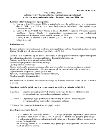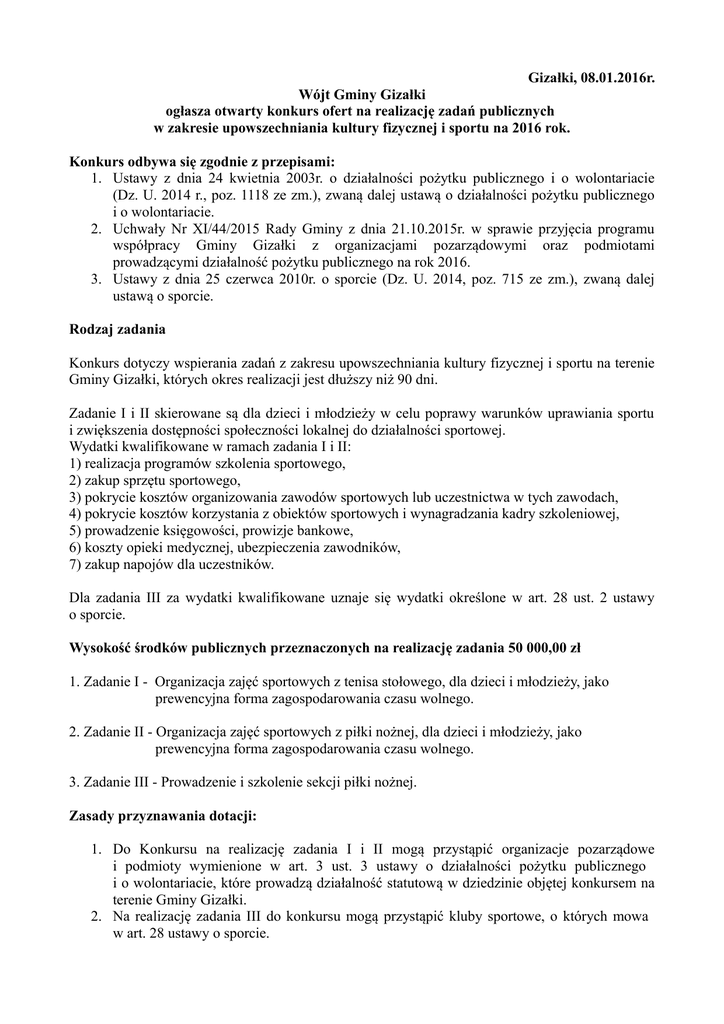 Gizałki, 08.01.2016r. Wójt Gminy Gizałki ogłasza otwarty konkurs ofert na realizację zadań publicznych w zakresie upowszechniania kultury fizycznej i sportu na 2016 rok. Konkurs odbywa się zgodnie z przepisami: 1. Ustawy z dnia 24 kwietnia 2003r. o działalności pożytku publicznego i o wolontariacie (Dz. U. 2014 r., poz. 1118 ze zm.), zwaną dalej ustawą o działalności pożytku publicznego i o wolontariacie. 2. Uchwały Nr XI/44/2015 Rady Gminy z dnia 21.10.2015r. w sprawie przyjęcia programu współpracy Gminy Gizałki z organizacjami pozarządowymi oraz podmiotami prowadzącymi działalność pożytku publicznego na rok 2016. 3. Ustawy z dnia 25 czerwca 2010r. o sporcie (Dz. U. 2014, poz. 715 ze zm.), zwaną dalej ustawą o sporcie. Rodzaj zadania Konkurs dotyczy wspierania zadań z zakresu upowszechniania kultury fizycznej i sportu na terenie Gminy Gizałki, których okres realizacji jest dłuższy niż 90 dni. Zadanie I i II skierowane są dla dzieci i młodzieży w celu poprawy warunków uprawiania sportu i zwiększenia dostępności społeczności lokalnej do działalności sportowej. Wydatki kwalifikowane w ramach zadania I i II: 1) realizacja programów szkolenia sportowego, 2) zakup sprzętu sportowego, 3) pokrycie kosztów organizowania zawodów sportowych lub uczestnictwa w tych zawodach, 4) pokrycie kosztów korzystania z obiektów sportowych i wynagradzania kadry szkoleniowej, 5) prowadzenie księgowości, prowizje bankowe, 6) koszty opieki medycznej, ubezpieczenia zawodników, 7) zakup napojów dla uczestników. Dla zadania III za wydatki kwalifikowane uznaje się wydatki określone w art. 28 ust. 2 ustawy o sporcie. Wysokość środków publicznych przeznaczonych na realizację zadania 50 000,00 zł 1. Zadanie I - Organizacja zajęć sportowych z tenisa stołowego, dla dzieci i młodzieży, jako prewencyjna forma zagospodarowania czasu wolnego. 2. Zadanie II - Organizacja zajęć sportowych z piłki nożnej, dla dzieci i młodzieży, jako prewencyjna forma zagospodarowania czasu wolnego. 3. Zadanie III - Prowadzenie i szkolenie sekcji piłki nożnej. Zasady przyznawania dotacji: 1. Do Konkursu na realizację zadania I i II mogą przystąpić organizacje pozarządowe i podmioty wymienione w art. 3 ust. 3 ustawy o działalności pożytku publicznego i o wolontariacie, które prowadzą działalność statutową w dziedzinie objętej konkursem na terenie Gminy Gizałki. 2. Na realizację zadania III do konkursu mogą przystąpić kluby sportowe, o których mowa w art. 28 ustawy o sporcie. 3. Warunkiem przystąpienia do konkursu jest złożenie w wyznaczonym terminie oferty na druku zgodnym ze wzorem określonym w rozporządzeniu Ministra Pracy i Polityki Społecznej z dnia 15 grudnia 2010r. w sprawie wzoru oferty i ramowego wzoru umowy dotyczących realizacji zadania publicznego oraz wzoru sprawozdania z wykonania tego zadania (Dz. U. z 2011 r. Nr 6 poz. 25). 4. Oferta powinna zawierać dane określone w art. 14 ust. 1 ustawy o działalności pożytku publicznego i o wolontariacie. Do oferty należy dołączyć: a) kopię aktualnego odpisu z KRS lub innego rejestru lub ewidencji, b) aktualny odpis statutu. Kserokopie dokumentów powinny być poświadczone za zgodność z oryginałem przez osoby reprezentujące podmiot. 5. Warunkiem zawarcia umowy jest: a. złożenie zaktualizowanego harmonogramu realizacji zadania (o ile nastąpiły zmiany w stosunku do złożonej oferty), b. złożenie zaktualizowanego kosztorysu realizacji zadania (o ile nastąpiły zmiany w stosunku do złożonej oferty). W przypadku przyznania mniejszego dofinansowania obowiązuje zasada zachowania procentowej wysokości finansowego wkładu własnego oferenta w stosunku do kosztu całkowitego zadania lub utrzymanie zadeklarowanej w ofercie kwoty wkładu własnego. Termin i warunki realizacji zadania: 1. Zadanie powinno być wykonane w terminie od 15.02.2016r. do 12.12.2016r. i zrealizowane w taki sposób, aby w maksymalnym stopniu podmiotami działania byli mieszkańcy Gminy Gizałki. 2. Uruchomienie środków na realizację zadania następuje na podstawie umowy zawartej pomiędzy Gminą a podmiotem, którego oferta została wybrana. Środki finansowe przekazywane będą w transzach określonych w umowie na wskazany rachunek bankowy. 3. Podmiot składający ofertę powinien wskazać udział własny na realizację zadania w wysokości co najmniej 10%, w formie finansowej. 4. Podmiot realizujący zadanie umożliwi w każdym czasie przeprowadzenie kontroli z realizacji zadania oraz sposobu wykorzystania środków. 5. Koszty realizacji zadania poniesione przed podpisaniem umowy nie podlegają refundacji przez Gminę. 6. Podmiot realizujący zadanie zobowiązany jest sporządzić sprawozdanie i przedłożyć je w terminie do 30 dni od dnia zakończenia realizacji zadania publicznego na druku zgodnym ze wzorem określonym w rozporządzeniu Ministra Pracy i Polityki Społecznej z dnia 15 grudnia 2010 r. w sprawie wzoru oferty i ramowego wzoru umowy dotyczących realizacji zadania publicznego oraz wzoru sprawozdania z wykonania tego zadania (Dz. U. z 2011 r. Nr 6 poz. 25). Tryb i kryteria stosowane przy wyborze ofert oraz termin wyboru ofert Oferta złożona w trybie, o którym mowa w art. 11 ust. 2 lub w art. 19a ust. 1 ustawy o działalności pożytku publicznego i o wolontariacie, musi zawierać: • szczegółowy zakres rzeczowy zadania publicznego, • termin i miejsce realizacji zadania, • kalkulację przewidywanych kosztów realizacji zadania, • informację o wcześniejszej działalności organizacji pozarządowej składającej ofertę w zakresie, którego dotyczy zadanie publiczne, informację o posiadanych zasobach rzeczowych i kadrowych zapewniających wykonanie zadania publicznego oraz o planowanej wysokości środków finansowych na realizację zadania pochodzących z innych źródeł, • deklarację o zamiarze odpłatnego lub nieodpłatnego wykonania zadania publicznego. W celu opini