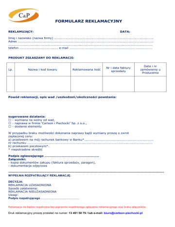 FORMULARZ REKLAMACYJNY REKLAMUJĄCY: DATA: Imię i nazwisko (nazwa firmy) ............................................................................................. Adres ............................................................................................................................... ....................................................................................................................................... telefon .................................... e-mail …………………………………………………………………………………………. PRODUKT ZGŁASZANY DO REKLAMACJI: Lp. Nazwa i kod towaru Reklamowana ilość Nr i data faktury sprzedaŜy Data i nr zamówienia u Producenta Powód reklamacji, opis wad /uszkodzeń/okoliczności powstania: sugerowane działania: - wymiana na wolny od wad, - naprawa w firmie ‘Carlson i Piechocki’ Sp. z o.o., - dosłanie elementu W przypadku braku moŜliwości dokonania naprawy bądź wymiany proszę o zwrot zapłaconej ceny: a) przelewem na mój rachunek bankowy w Banku*................................................................. nr rachunku ..................................................................................................................... b) przekazem pocztowym*. * niepotrzebne skreślić Podpis zgłaszającego …………………………………………….. Załączniki: - kopia dokumentów zakupu (faktura sprzedaŜy, paragon), - dokumentacja zdjęciowa --------------------------------------------------------------------------------------------------------------------------------------------------------------WYPEŁNIA ROZPATRUJĄCY REKLAMACJĘ: DECYZJA: REKLAMACJA UZASADNIONA Sposób załatwienia: REKLAMACJA NIEUZASADNIONA Uwagi: Podpis rozpatrującego…………..……………………………. Reklamacja nie będzie rozpatrzona bez poprawnie wypełnionego zgłoszenia reklamacyjnego oraz braku załączników. Druk reklamacyjny proszę przesłać na numer: 13 491 50 79 / lub e-mail: [email protected]