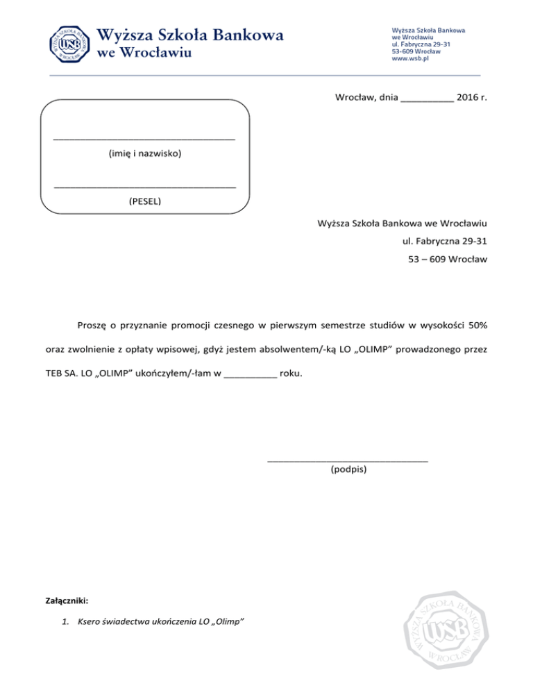 Wrocław, dnia __________ 2016 r. __________________________________ (imię i nazwisko) __________________________________ (PESEL) Wyższa Szkoła Bankowa we Wrocławiu ul. Fabryczna 29-31 53 – 609 Wrocław Proszę o przyznanie promocji czesnego w pierwszym semestrze studiów w wysokości 50% oraz zwolnienie z opłaty wpisowej, gdyż jestem absolwentem/-ką LO „OLIMP” prowadzonego przez TEB SA. LO „OLIMP” ukończyłem/-łam w __________ roku. ______________________________ (podpis) Załączniki: 1. Ksero świadectwa ukończenia LO „Olimp”