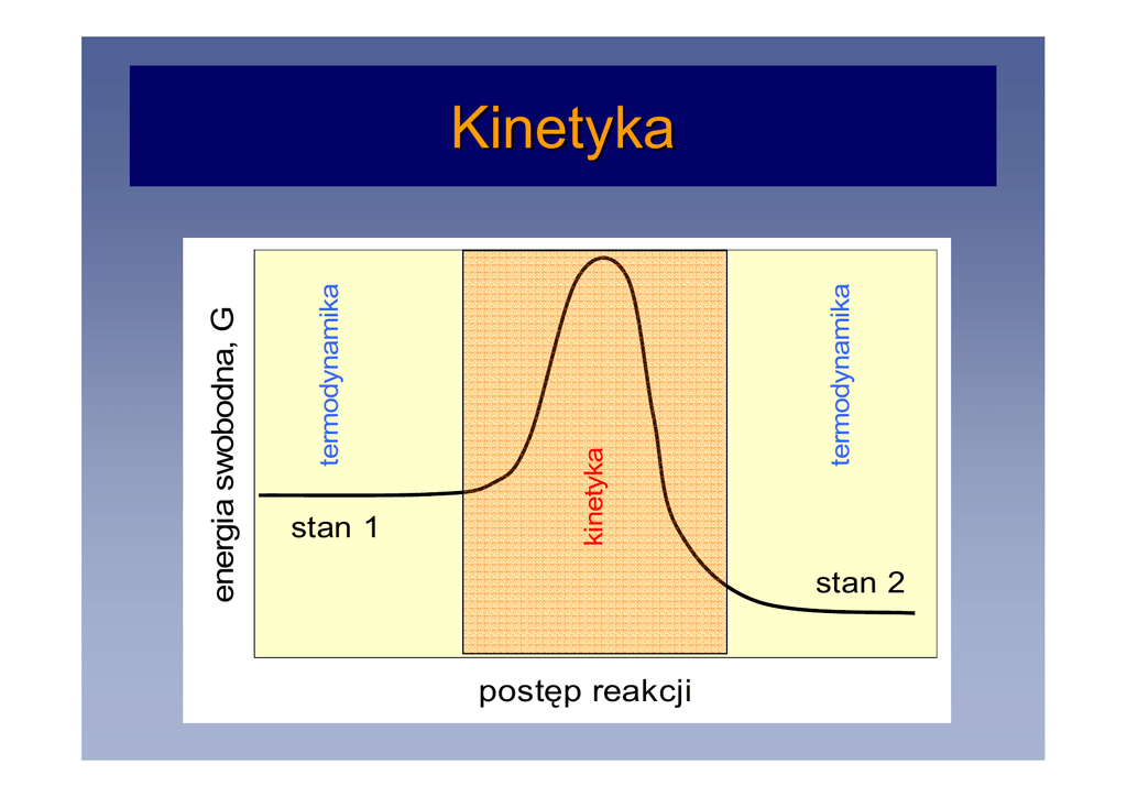 stan 1 postęp reakcji termodynamika kinetyka termodynamika energia swobodna, G Kinetyka stan 2 Kinetyka Stawia dwa pytania: 1) Jak szybko biegną reakcje? 2) W jaki sposób przebiegają reakcje? 1) Jak szybko biegną reakcje? 1. 2. 3. 4. Co to jest szybkość reakcji? Jak wyznaczać szybkość reakcji? Jak szybkość reakcji zależy od stężenia? Jak szybkość reakcji zależy od temperatury? 12_1575 Co to jest szybkość reakcji? Time r=- d[NO2] dt Time NO2 r=- NO (b) (c) ∆c (a) 0,011 0,01 0,009 0,008 0,007 0,006 0,005 0,004 0,003 0,002 0,001 0 0,0026 stężenie, c mol/dm3 NO2(g) → NO(g) + ½O2(g) ∆t −0,0026 mol 110 dm3 s α 110 s O2 = 2,4·10-5 mol/dm3·s r = tg(α) 0 100 200 czas, s 300 400 Co to jest szybkość reakcji? definicja szybkości reakcji r=r= ν ∆csubstratu ∆t ∆csub νsub·∆t ∆cproduktu = ∆t = mol dm3 s ∆cprod νprod·∆t NO2(g) → NO(g) + ½O2(g) −1 1 ½ Co to jest szybkość reakcji? 0,011 0,01 0,009 0,008 0,007 0,006 0,005 0,004 0,003 0,002 0,001 0 r= NO2 NO2 r= 70 s O2 O2 0 100 200 czas, s νNO2 dt 0,0039−0,0045 mol −1·70 dm3 s = 8,6·10-6 mol/dm3·s 0,0003 70 s d[NO2] 0,0006 NO NO 0,0006 stężenie, c mol/dm3 NO2(g) → NO(g) + ½O2(g) 300 400 12_1575 Co to jest szybkość reakcji? Time r= NO2 r= NO (c) 70 s O2 70 s 100 νNO dt 200 czas, s 0,0059−0,0053 1·70 mol dm3 s 0,0006 (b) 0 d[NO] Time = 8,6·10-6 mol/dm3·s 0,0003 (a) 0,011 0,01 0,009 0,008 0,007 0,006 0,005 0,004 0,003 0,002 0,001 0 0,0006 stężenie, c mol/dm3 NO2(g) → NO(g) + ½O2(g) 300 400 12_1575 Co to jest szybkość reakcji? Time r= NO2 r= NO (c) 70 s O2 70 s 100 νO2 dt 200 czas, s 0,0031−0,0027 ½·70 mol dm3 s 0,0006 (b) 0 d[O2] Time = 2·4,3·10-6 mo//dm3·s = 8,6·10-6 mo//dm3·s 0,0003 (a) 0,011 0,01 0,009 0,008 0,007 0,006 0,005 0,004 0,003 0,002 0,001 0 0,0006 stężenie, c mol/dm3 NO2(g) → NO(g) + ½O2(g) 300 400 Co to jest szybkość reakcji? definicja szybkości reakcji ogólnie r= 1 νi · dci mol dt dm3 s pochodna stężenia reagenta względem czasu Co to jest szybkość reakcji? wnioski • szybkość reakcji > 0 • nie zależy od wyboru reagenta (substrat, produkt) Jak wyznaczać szybkość reakcji? 1) Szybkość średnia w danym odcinku czasu – pomiar różnic stężeń, ∆c 2) Szybkość chwilowa – wyznaczenie stycznej w danej chwili, tg(α) Sposóbpomiaru pomiaruszybkości szybkościreakcji reakcjizależy zależyod odtypu typu Sposób stosowanegoreaktora!!!! reaktora!!!! stosowanego definiujemy czas kontaktu dla różnych reaktorów substraty zbiornikowy produkty przepływowy Jak szybkość reakcji zależy od stężenia? równanie kinetyczne NO2(g) → NO(g) + ½O2(g) r = k[NO2]n k = stała szybkości reakcji (liczba wymierna>0) n = rząd reakcji (liczba wymierna) Jak szybkość reakcji zależy od stężenia? równanie kinetyczne NO2(g) → NO(g) + ½O2(g) r = k[NO]n1[O2]n2 n1+n2 = całkowity rząd reakcji (liczba wymierna) Jak szybkość reakcji zależy od stężenia? równanie kinetyczne aA + bB → cC + dD dowolne równanie sumaryczne r = k[A]na[B]nb[C]nc[D]nd na,b,c,d wyznaczane są doświadczalnie na + nb + nc + nd = całkowity rząd reakcji Jak szybkość reakcji zależy od stężenia? równanie kinetyczne dla reakcji I rzędu aA → cC + dD r = k [A] n=1 po scałkowaniu [A] = [A]0exp(-kt) stężenie A, [A] mol/dm 3 dowolne równanie sumaryczne 0,12 0,1 −∆ A r= = Rate =k A 0,06 ∆t 0,08 0,04 0,02 0 0 100 200 czas, s 300 400 Jak szybkość reakcji zależy od stężenia? czaspołowicznego połowicznegozaniku zaniku==czas czas czas potrzebnydo doprzemiany przemianypołowy połowy potrzebny stężeniapoczątkowego początkowegosubstratu substratu stężenia t½ [A] = ½[A]0 Jak szybkość reakcji zależy od stężenia? równanie kinetyczne dla reakcji I rzędu 2N2O5 → 4NO2 + O2 n=1 czas połowicznego zaniku t1/2 0.l693 n2 = k [N2O5]0 0.1000 0.0900 0.0800 [N2O5] (mol/L) r = k [N2O5] 12_294 0.0700 0.0600 [N2O5]0 2 [N2O5]0 4 [N2O5]0 8 0.0500 0.0400 0.0300 0.0200 0.0100 50 t1/2 100 150 200 t1/2 250 t1/2 Time (s) 300 350 400 Jak szybkość reakcji zależy od stężenia? wnioski dla n=1, t½ nie zależy od stężenia początkowego Jak szybkość reakcji zależy od stężenia? wnioski ogólne 12_06T Podsumowanie – równania kinetyczne dla reakcji 0,1,2 rzędu Rząd O Równanie kinetyczne Postać całkowa linearyzacja Czas połowicznego rozpadu 1 r = r = k [A] = - k t + [A] 0 [A] versus t 1/2 = [A] 2k t 0 ln[A] = - 2 k [A] k t + ln[A] ln[A] versus t 1/2 = 0.693 k t 0 r = k [A] 2 1 1 = kt + [A] [A] 0 1 versus t [A] t 1/2 = 1 k [A] 0 Jak szybkość reakcji zależy od temperatury? równanie Arrheniusa k = Ae − Ea / RT 1000 800 k 600 z doświadczenia wynika, że: k = const·exp(-E/RT) 400 200 0 0 200 400 T, K dlaczego tak się dzieje? - cząsteczki muszą się zderzać - tylko zderzenia posiadające pewną energię Ea są aktywne 600 Jak szybkość reakcji zależy od temperatury? Relative number of N2 molecules with given velocity 05_59 273 K 1273 K 2273 K 0 1000 2000 V e lo c ity (m /s ) 3000 Jak szybkość reakcji zależy od temperatury? 12_300 liczba cząstek T1 0 T 2 > T1 T2 0 Ea E n e rg y Energia cząstek Jak szybkość reakcji zależy od temperatury? Jak wyznaczyć energię aktywacji? Logarytmiczna postać równania Arrheniusa ln(k) = ln(A) -E/RT 16,0 14,0 y = -91220x + 131,74 12,0 ln(k) 10,0 8,0 6,0 α 4,0 2,0 0,0 0,001 0,001 0,001 0,001 0,001 0,001 0,001 0,001 1/T, 1/K W jaki sposób przebiegają reakcje? Jaki jest mechanizm reakcji? 1. Sumaryczna postać równania stechiometrycznego nie mówi nic o tym jak cząsteczki reagują ze sobą 2. Cząsteczki reagują w serii kroków pośrednich zwanych aktami elementarnymi W jaki sposób przebiegają reakcje? Jaki jest mechanizm reakcji? • równanie stechiometryczne 2NO2(g) + F2(g) → 2NO2F(g) • równanie kinetyczne Równanie sumaryczne sekwencja aktów elementarnych r = k [NO2][F2] • mechanizm NO2 + F2 → NO2F + F F + NO2 → NO2F 2NO2 + F2 → 2NO2F W jaki sposób przebiegaj