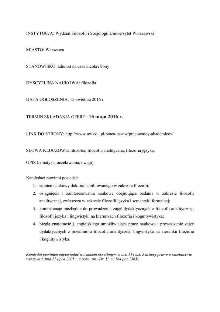 INSTYTUCJA: Wydział Filozofii i Socjologii Uniwersytet Warszawski MIASTO: Warszawa STANOWISKO: adiunkt na czas nieokreślony DYSCYPLINA NAUKOWA: filozofia DATA OGŁOSZENIA: 15 kwietnia 2016 r. TERMIN SKŁADANIA OFERT: 15 maja 2016 r. LINK DO STRONY: http://www.uw.edu.pl/praca-na-uw/pracownicy-akademiccy/ SŁOWA KLUCZOWE: filozofia, filozofia analityczna, filozofia języka, OPIS (tematyka, oczekiwania, uwagi): Kandydaci powinni posiadać: 1. stopień naukowy doktora habilitowanego w zakresie filozofii; 2. osiągnięcia i zainteresowania naukowe obejmujące badania w zakresie filozofii analitycznej, zwłaszcza w zakresie filozofii języka i semantyki formalnej; 3. kompetencje niezbędne do prowadzenia zajęć dydaktycznych z filozofii analitycznej, filozofii języka i lingwistyki na kierunkach filozofia i kognitywistyka; 4. biegłą znajomość j. angielskiego umożliwiającą pracę naukową i prowadzenie zajęć dydaktycznych z przedmiotu filozofia analityczna, lingwistyka na kierunku filozofia i kognitywistyka. Kandydat powinien odpowiadać warunkom określonym w art. 114 ust. 5 ustawy prawo o szkolnictwie wyższym z dnia 27 lipca 2005 r. z późn. zm. /Dz. U. nr 164 poz.1365/. Zgłoszenie na konkurs powinno zawierać: 1. 2. 3. 4. 5. 6. podanie skierowane do Prorektora UW, prof. dra hab. Tadeusza Tomaszewskiego kwestionariusz osobowy ze zdjęciem życiorys naukowy list motywacyjny spis publikacji kilka wybranych publikacji reprezentatywnych dla zainteresowań badawczych kandydata 7. informację dotyczącą dotychczasowej pracy dydaktycznej 8. 2 opinie samodzielnych pracowników naukowych (w tym: co najmniej 1 opinia spoza UW) 9. dyplom doktora habilitowanego 10. świadectwa pracy Kandydaci mogą zostać zaproszeni na rozmowę kwalifikacyjną. Zgłoszenie na konkurs należy przesłać do dnia: 15 maja 2016 r. Biuro Dziekana Wydziału Filozofii i Socjologii UW ul. Nowy Świat 69 00-927 Warszawa (pokój nr 170, III piętro) Rozstrzygnięcie konkursu nastąpi do dnia: 21 czerwca 2016 r. Uwaga! Uczelnia nie zapewnia mieszkania.