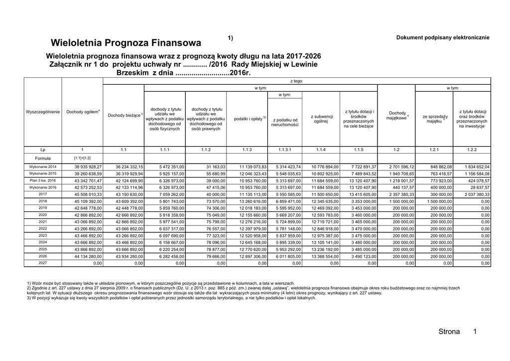 1) Wieloletnia Prognoza Finansowa Dokument podpisany elektronicznie Wieloletnia prognoza finansowa wraz z prognozą kwoty długu na lata 2017-2026 Załącznik nr 1 do projektu uchwały nr ............ /2016 Rady Miejskiej w Lewinie Brzeskim z dnia ...........................2016r. z tego: w tym: w tym: w tym: Wyszczególnienie Dochody ogółem Lp 1 Formuła [1.1]+[1.2] x Dochody bieżące x 1.1 dochody z tytułu dochody z tytułu udziału we udziału we wpływach z podatku wpływach z podatku dochodowego od dochodowego od osób fizycznych osób prawnych 1.1.1 1.1.2 podatki i opłaty 3) 1.1.3 z podatku od nieruchomości 1.1.3.1 z subwencji ogólnej z tytułu dotacji i środków przeznaczonych na cele bieżące Dochody x majątkowe 1.1.4 1.1.5 1.2 ze sprzedaży x majątku z tytułu dotacji oraz środków przeznaczonych na inwestycje 1.2.1 1.2.2 Wykonanie 2014 38 935 928,27 36 234 332,15 5 472 351,00 31 163,03 11 139 073,83 5 314 423,74 10 776 894,00 7 722 891,37 2 701 596,12 848 862,08 1 834 652,04 Wykonanie 2015 38 260 638,59 36 319 929,94 5 925 157,00 55 680,99 12 046 323,43 5 548 035,63 10 802 925,00 7 489 843,52 1 940 708,65 763 416,57 1 156 584,08 Plan 3 kw. 2016 43 342 701,47 42 124 699,90 6 326 973,00 39 000,00 10 953 760,00 5 313 697,00 11 684 559,00 13 120 407,90 1 218 001,57 773 923,00 424 078,57 Wykonanie 2016 42 573 252,53 42 133 114,96 6 326 973,00 47 415,06 10 953 760,00 5 313 697,00 11 684 559,00 13 120 407,90 440 137,57 400 000,00 28 637,57 2017 45 508 010,33 43 150 630,00 7 059 262,00 40 000,00 11 135 113,00 5 550 585,00 11 500 650,00 13 415 605,00 2 357 380,33 300 000,00 2 037 380,33 2018 45 109 392,00 43 609 392,00 5 801 743,00 73 570,00 13 260 616,00 6 859 471,00 12 345 635,00 3 353 000,00 1 500 000,00 1 500 000,00 0,00 2019 42 648 778,00 42 448 778,00 5 859 760,00 74 306,00 12 018 183,00 5 595 952,00 12 469 092,00 3 453 000,00 200 000,00 200 000,00 0,00 2020 42 866 892,00 42 666 892,00 5 918 358,00 75 049,00 12 155 660,00 5 669 207,00 12 593 783,00 3 460 000,00 200 000,00 200 000,00 0,00 2021 43 066 892,00 42 866 892,00 5 977 541,00 75 799,00 12 276 216,00 5 724 899,00 12 719 721,00 3 465 000,00 200 000,00 200 000,00 0,00 2022 43 266 892,00 43 066 892,00 6 037 317,00 76 557,00 12 397 979,00 5 781 148,00 12 846 918,00 3 470 000,00 200 000,00 200 000,00 0,00 2023 43 466 892,00 43 266 892,00 6 097 690,00 77 323,00 12 520 958,00 5 837 959,00 12 975 387,00 3 475 000,00 200 000,00 200 000,00 0,00 2024 43 666 892,00 43 466 892,00 6 158 667,00 78 096,00 12 645 168,00 5 895 339,00 13 105 141,00 3 480 000,00 200 000,00 200 000,00 0,00 2025 43 866 892,00 43 666 892,00 6 220 254,00 78 877,00 12 770 620,00 5 953 292,00 13 236 192,00 3 485 000,00 200 000,00 200 000,00 0,00 2026 44 134 280,00 43 934 280,00 6 282 456,00 79 666,00 12 897 306,00 6 011 805,00 13 368 554,00 3 490 123,00 200 000,00 200 000,00 0,00 2027 0,00 0,00 0,00 0,00 0,00 0,00 0,00 0,00 0,00 0,00 0,00 1) Wzór może być stosowany także w układzie pionowym, w którym poszczególne pozycje są przedstawione w kolumnach, a lata w wierszach. 2) Zgodnie z art. 227 ustawy z dnia 27 sierpnia 2009 r. o finansach publicznych (Dz. U. z 2013 r. poz. 885 z póź. zm.) zwanej dalej „ustawą”, wieloletnia prognoza finansowa obejmuje okres roku budżetowego oraz co najmniej trzech kolejnych lat. W sytuacji dłuższego okresu prognozowania finansowego wzór stosuje się także dla lat wykraczających poza minimalny (4 letni) okres prognozy, wynikający z art. 227 ustawy. 3) W pozycji wykazuje się kwoty wszystkich podatków i opłat pobieranych przez jednostki samorządu terytorialnego, a nie tylko podatków i opłat lokalnych. Strona 1 z tego: w tym: w tym: w tym: w tym: x Wyszczególnienie Wydatki ogółem Lp 2 Formuła [2.1] + [2.2] x Wydatki bieżące z tytułu poręczeń i x gwarancji 2.1 2.1.1 gwarancje i poręczenia podlegające wyłączeniu z limitu spłaty zobowiązań, o którym mowa wx art. 243 ustawy na spłatę przejętych zobowiązań samodzielnego publicznego zakładu opieki zdrowotnej przekształconego na zasadach określonych w przepisach o działalności leczniczej, w wysokości w jakiej nie podlegają sfinansowaniu dotacją z budżetu państwa 4) 2.1.1.1 2.1.2 odsetki i dyskonto podlegające wyłączeniu z limitu spłaty odsetki i dyskonto zobowiązań, o którym podlegające wyłączeniu mowa w art. 243 wydatki na obsługę z limitu spłaty odsetki i dyskonto x ustawy, w terminie nie długu określone w art. 243 dłuższym niż 90 dni po zobowiązań, o którym mowa w art. 243 x zakończeniu programu, ust. 1 ustawy ustawy, z tytułu projektu lub zadania i zobowiązań otrzymaniu refundacji z zaciągniętych na wkład tych środków (bez krajowy x odsetek i dyskonta od zobowiązań na wkład krajowy) x 2.1.3 2.1.3.1 2.1.3.1.1 2.1.3.1.2 x Wydatki majątkowe 2.2 Wykonanie 2014 40 332 684,31 34 411 272,46 0,00 0,00 0,00 375 548,44 374 677,38 0,00 0,00 5 921 411,85 Wykonanie 2015 37 361 782,10 35 354 663,03 0,00 0,00 0,00 292 658,43 292 493,43 0,00 0,00 2 007 119,07 Plan 3 kw. 2016 44 789 072,47 42 125 745,47 147 900,00 0,00 0,00 328 837,00 326 837,00 0,00 0,00 2 663 327,00 Wykonanie 2016 43 189 072,47 41 625 745,47 0,00 0,00 0,00 314 371,13 314 371,13 0,00 0,00 1 563 327,00 2017 45 285 073,33 41 794 466,16 147 900,00 0,00 0,00 600 000,00 598 000,00 0,00 0,00 3 490 607,17 2018 43 989 825,00 39 953 414,00 147 900,00 0,00 0,00 226 156,00 226 156,00 0,00 0,00 4 036 411,00 2019 41 477 069,00 39 758 145,00 147 900,00 0,00 x 375 950,00 375 950,00 0,00 0,00 1 718 924,00 2020 41 677 069,00 39 908 905,00 147 900,00 0,00 x 333 261,00 333 261,00 0,00 0,00 1 768 164,00 2021 41 877 069,00 40 059 660,00 147 900,00 0,00 x 289 882,00 289 882,00 0,00 0,00 1 817 409,00 2022 42 361 134,00 40 182 184,00 147 900,00 0,00 x 253 181,00 253 181,00 0,00 0,00 2 178 950,00 2023 42 561 134,00 40 401 066,00 147 900,00 0,00 x 227 209,00 227 209,00 0,00 0,00 2 160 068,00 2024 43 370 007,00 40 351 249,00 147 900,00 0,00 x 180 209,00 180 209,00 