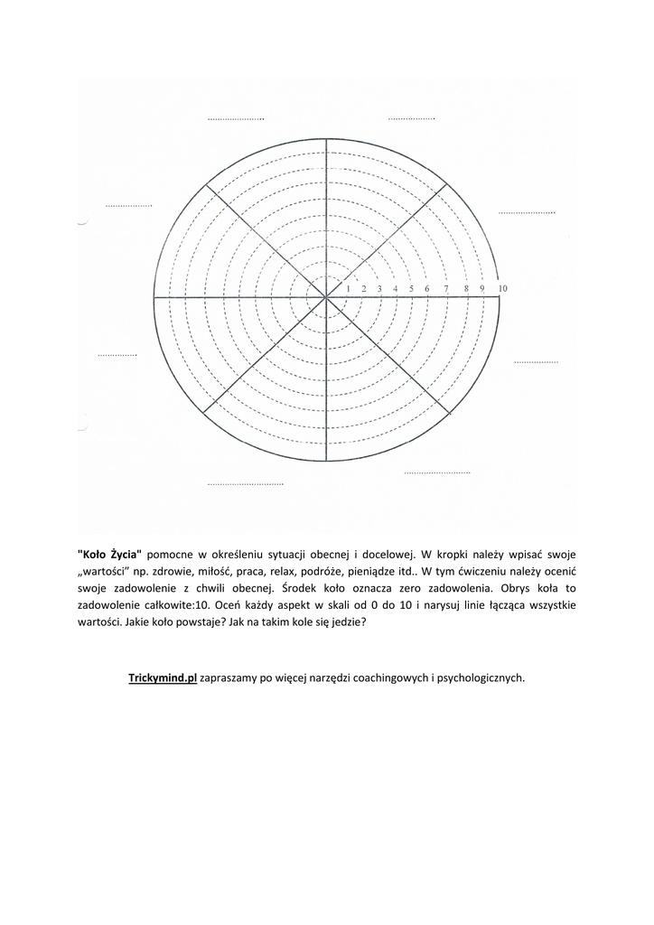 "Koło Życia" pomocne w określeniu sytuacji obecnej i docelowej. W kropki należy wpisać swoje „wartości” np. zdrowie, miłość, praca, relax, podróże, pieniądze itd.. W tym ćwiczeniu należy ocenić swoje zadowolenie z chwili obecnej. Środek koło oznacza zero zadowolenia. Obrys koła to zadowolenie całkowite:10. Oceń każdy aspekt w skali od 0 do 10 i narysuj linie łącząca wszystkie wartości. Jakie koło powstaje? Jak na takim kole się jedzie? Trickymind.pl zapraszamy po więcej narzędzi coachingowych i psychologicznych.