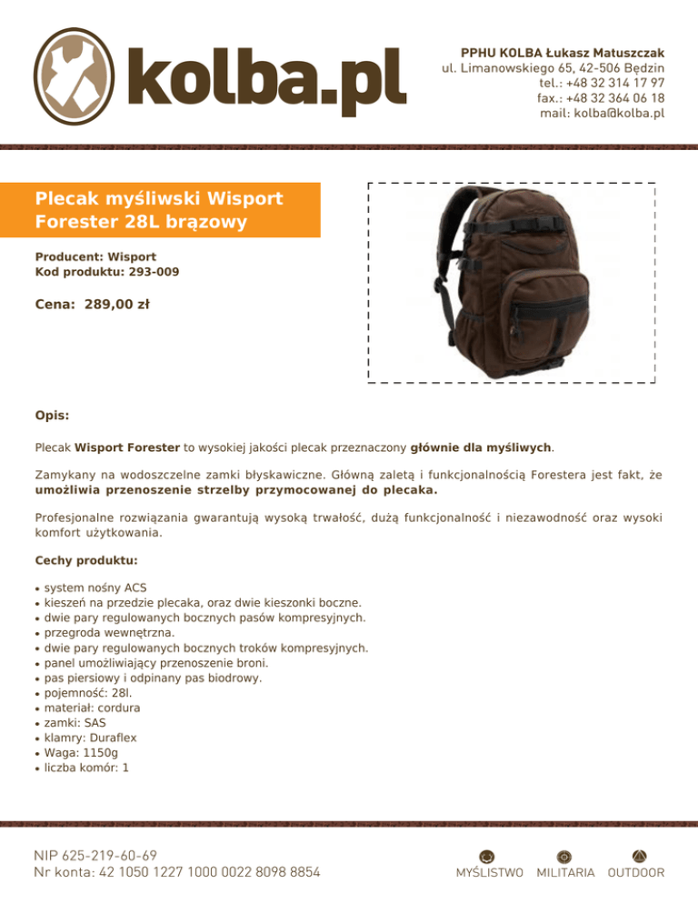 Plecak myśliwski Wisport Forester 28L brązowy Producent: Wisport Kod produktu: 293-009 Cena: 289,00 zł Opis: Plecak Wisport Forester to wysokiej jakości plecak przeznaczony głównie dla myśliwych. Zamykany na wodoszczelne zamki błyskawiczne. Główną zaletą i funkcjonalnością Forestera jest fakt, że umożliwia przenoszenie strzelby przymocowanej do plecaka. Profesjonalne rozwiązania gwarantują wysoką trwałość, dużą funkcjonalność i niezawodność oraz wysoki komfort użytkowania. Cechy produktu: ● ● ● ● ● ● ● ● ● ● ● ● ● system nośny ACS kieszeń na przedzie plecaka, oraz dwie kieszonki boczne. dwie pary regulowanych bocznych pasów kompresyjnych. przegroda wewnętrzna. dwie pary regulowanych bocznych troków kompresyjnych. panel umożliwiający przenoszenie broni. pas piersiowy i odpinany pas biodrowy. pojemność: 28l. materiał: cordura zamki: SAS klamry: Duraflex Waga: 1150g liczba komór: 1 ● ● ● liczba kieszeni: 4 wymiary: 50x27x23cm kolor: brązowy (w naszej ofercie dostępny również oliv) Producent: Wisport Gwarancja 5 lat.