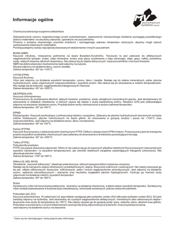 Informacje ogólne automation systems GmbH Chemiczna tolerancja wzajemna sk³adników Zabezpieczanie zaworu magnetycznego przed uszkodzeniami, zapewnienie niezawodnego dzia³ania wymagaj¹ prawid³owego doboru materia³ów: na obudowy zaworów, operatora i na uszczelnienia. Prosimy o podanie stosownego czynnika (medium) i wymaganego zakresu temperatur roboczych, abyœmy mogli zaleciæ zastosowanie w³aœciwych materia³ów. Poni¿ej podajemy wykaz najczêœciej stosowanych elastomerów i innych uszczelnieñ: BUNA (NBR) Kauczuk nitrylowy, mieszanina polimerów na bazie Butadien-Acrylnitritu. Tworzywo to jest zalecane do alifatycznych wêglowodorów (propan, butan, oleje mineralne, smary oraz p³yny uzyskiwane z oleju ziemnego, oleje, gazy, nafta), powietrza, wody, s³abych kwasów, alkoholi i terpentyny. Nie zaleca siê do olejów eterycznych, rozpuszczalników i mocnych kwasów. NBR ma dobre w³asnoœci mechaniczne i jest odporny na zu¿ycie. Nie jest odporny na dzia³anie tlenu, ozonu i œwiat³a. Zakres temperatur -20° do +120°C VITON (FPM) Kauczuk fluorowy. Viton jest odporny na dzia³anie wysokich temperatur, ozonu, tlenu i œwiat³a. Nadaje siê do olejów mineralnych, paliw, p³ynów hydraulicznych, wielu organicznych rozpuszczalników i wysokich pró¿ni. Nie zaleca siê do stosowania w niskich temperaturach. Nie nadaje siê do ketonów, wêglowodorów halogenowych i freonów. Zakres temperatur -30° do +200°C. NEOPREN (CR) Kauczuk chloroprenowy. Przeznaczony do przelewania alkoholi, s³abych kwasów, powietrza, wody, obojêtnych (neutralnych) gazów. Jest akceptowany do stosowania w uk³adach ch³odzenia, w których u¿ywa siê olejów z du¿¹ zawartoœci¹ aniliny. Neopren (CR) jest zadowalaj¹co odporny na starzenie i dzia³anie ozonu. Posiada dobre cechy mechaniczne w du¿ym zakresie temperatur. Zakres temperatur -30° do 100°C. EPMD Etylopropylen. Kauczuk pochodz¹cy z polimeryzacji etylenu i propylenu. Zalecany do p³ynów hydraulicznych tworzonych na bazie estrów fosfatowych, p³ynów hamulcowych na bazie glikoli, do stosowania w gor¹cej wodzie i parze do +130°C oraz rozpuszczalników. Jest odporny na dzia³anie ozonu, tlenu i na starzenie. Zakres temperatur -40° do 130°C. Kairez (PTFM) Kauczuk fluoryzowany z w³aœciwoœciami chemicznymi PTFE (Teflon) i elastycznymi FPM (Vaton). Przeznaczony jest do transportu prawie wszystkich produktów chemicznych i jest zalecany do stosowania w œrodowisku powoduj¹cym korozjê. Zakres temperatur -20° do +250°C. Teflon (PTFE) Policzterofluoroetylen. PTFE ma prawie absolutn¹ odpornoœæ. Mimo to nie zaleca siê go do topionych alkaliów niektórych fluoryzowanych mieszanek pod wysokim ciœnieniem i w wysokich temperaturach, jak równie¿ niektórych zwi¹zków zawieraj¹cych halogenki (chlorowce). Nie absorbuje p³ynów i wody. Zakres temperaur -150° do 180°C. Silikon (Q, MQ, MVQ) Okreœlenie ,,kauczuk silikonowy’’ obejmuje wiele tworzyw, których baz¹ jest silikon metylowo-winylowy. Nadaje siê do transportu olejów silnikowych i przek³adniowych, olejów, t³uszczów roœlinnych i zwierzêcych. Nie nale¿y stosowaæ go do par, olejów silikonowych, t³uszczów silikonowych, paliw i innych wêglowodorów aromatycznych. Jest odporny na dzia³anie ozonu, wp³ywów atmosferycznych i starzenie oraz neutralny wzglêdem p³ynów fizjologicznych. Cechuje go równie¿ du¿a odpornoœæ na dzia³anie niskich i wysokich temperatur. Zakres temperatur -50° do 190°C. Rubin Syntetyczny rubin lub korund jest praktycznie neutralny na dzia³anie chemiczne, a tak¿e wp³yw wysokich temperatur. Syntetyczny rubin znalaz³ zastosowanie w budowie dysz wtryskiwaczy, koñcówek wylotowych, pokryw zaworów palników. Poliuretan (AU, EU) Kauczuk poliuretanowy. W zale¿noœci od jego sk³adu wystêpuje jako poliester-uretan (AU) albo jako poliester-uretan (EU). EU jest bardziej odporny na hydrolizê. Jest stosowany do czystych wêglowodorów alifatycznych, mineralnych albo silikonowych olejów i t³uszczów oraz wody do temperatury do +50°C. Nie nale¿y u¿ywaæ go do gor¹cej wody i pary, esterów, eteru, alkoholi oraz glikolu. Poliuretan w porównaniu z innymi elastomerami cechuje siê du¿¹ odpornoœci¹ na œcieranie i znaczn¹ elastycznoœci¹. Jest odporny na dzia³anie ozonu i na starzenie. * Dane s¹ nie obowi¹zuj¹ce i s³u¿¹ jedynie jako informacje Odpornoœæ x o o x o o o o o o x o o o o x o o o x o x o o o o x o o o o x x x x x x o o x o x x x o o x x x x o x x o o x x o o x o o o o o x o o o o o o o o o o x o x o x o o o o o o o o x o o o o x o o o o o o o o o x x x x x o o o x x x x o o x x x o o o o o o o o x o x o o x o o x o o o o o o o o o x x o o x o x o x o x x o x o x o x o x x o o x o o x x o x o o o x o o x o x x o o o o o o o x o x x o x x o x x x o o o x o o o o x o o x x x x x o x o o o o x x o o o o o o o x o o o x o o x o o o o o o x o o o x o o x o o o o o o o o o o o o x o x x o o o o o x x o o o o o o o o x x x x o o x o o o o o x x o o o o o x o o o o o o o o o o o o o x o o o o o o o o x o o o o x o x x x x o o o o o o x o o o x o o x o o o o o x x x x o x x x o x x o o o x x o o o o o o o o o x o o o o o o o o o o x o x x o o o o o o o o o o o x o o o o o o x o o o o o x o o o o o o o x x x x x x x x o o o o o o o o o o o o o o o o o o o o o o o o o o o o o o o o x o o o o o x o o x o o o o o o o o o o o o o o o o o o o o o o o o o o o o o o o o o o o o o o o o o o o o o o o o o o o o o o o o o o o o o o o o o o o o o o o o o o o o o o o o o o o o o o x x o o o x x o x x x x x x o x x o o x o x x o x x x x x o o o o o o o x o o x o x x x x o x o o o o o o o o o o o x o o x x o o o o o o o Kairez PFPM o o o o o o o o o o o o o o o o o o o o o o o o o o o x o x o o o o o o o o o o o o o o o o o o o o o o o o o o o o o o o o o o o o o x o o o o o o Silikon MQ o x x o x x o o x o o x o o o o o o o o o o o o o x x o o x o o o o o o o o o o o x x x o x o o o o o o o o o o x o o o o x o o o x o o o o o o x x