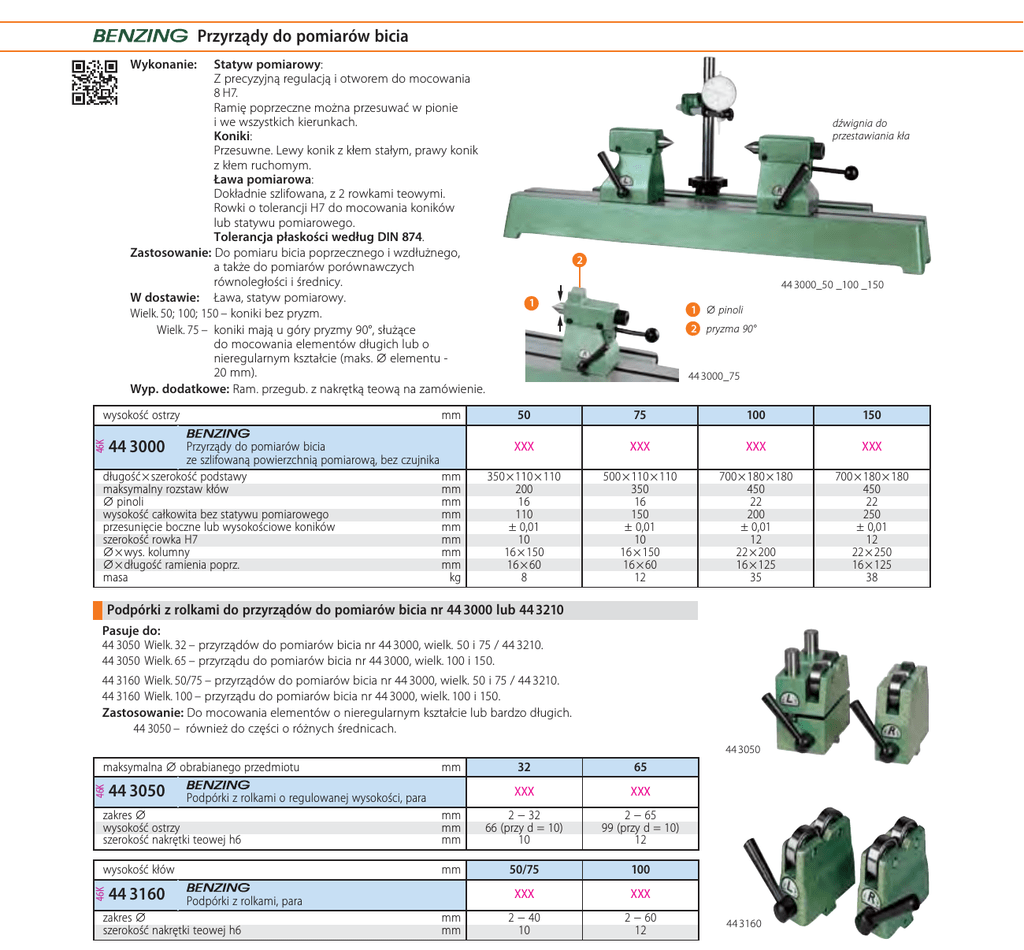 Przyrządy do pomiarów bicia Wykonanie: dźwignia do przestawiania kła • 2 •• 44 3000_50 _100 _150 1 ⌀ pinoli ▶ • 1 ▶ Statyw pomiarowy: Z precyzyjną regulacją i otworem do mocowania 8 H7. Ramię poprzeczne można przesuwać w pionie i we wszystkich kierunkach. Koniki: Przesuwne. Lewy konik z kłem stałym, prawy konik z kłem ruchomym. Ława pomiarowa: Dokładnie szlifowana, z 2 rowkami teowymi. Rowki o tolerancji H7 do mocowania koników lub statywu pomiarowego. Tolerancja płaskości według DIN 874. Zastosowanie: Do pomiaru bicia poprzecznego i wzdłużnego, a także do pomiarów porównawczych równoległości i średnicy. W dostawie: Ława, statyw pomiarowy. Wielk. 50; 100; 150 – koniki bez pryzm. Wielk. 75 – koniki mają u góry pryzmy 90°, służące do mocowania elementów długich lub o nieregularnym kształcie (maks. ⌀ elementu 20 mm). Wyp. dodatkowe: Ram. przegub. z nakrętką teową na zamówienie. 2 pryzma 90° 44 3000_75 mm 50 75 100 150 Przyrządy do pomiarów bicia ze szlifowaną powierzchnią pomiarową, bez czujnika długość×szerokość podstawy mm maksymalny rozstaw kłów mm ⌀ pinoli mm wysokość całkowita bez statywu pomiarowego mm przesunięcie boczne lub wysokościowe koników mm szerokość rowka H7 mm ⌀×wys. kolumny mm ⌀×długość ramienia poprz. mm masa kg XXX XXX XXX XXX 350×110×110 200 16 110 ± 0,01 10 16×150 16×60 8 500×110×110 350 16 150 ± 0,01 10 16×150 16×60 12 700×180×180 450 22 200 ± 0,01 12 22×200 16×125 35 700×180×180 450 22 250 ± 0,01 12 22×250 16×125 38 46K wysokość ostrzy 44 3000 Podpórki z rolkami do przyrządów do pomiarów bicia nr 44 3000 lub 44 3210 Pasuje do: 44 3050 Wielk. 32 – przyrządów do pomiarów bicia nr 44 3000, wielk. 50 i 75 / 44 3210. 44 3050 Wielk. 65 – przyrządu do pomiarów bicia nr 44 3000, wielk. 100 i 150. 44 3160 Wielk. 50/75 – przyrządów do pomiarów bicia nr 44 3000, wielk. 50 i 75 / 44 3210. 44 3160 Wielk. 100 – przyrządu do pomiarów bicia nr 44 3000, wielk. 100 i 150. Zastosowanie: Do mocowania elementów o nieregularnym kształcie lub bardzo długich. 44 3050 – również do części o różnych średnicach. 44 3050 maksymalna ⌀ obrabianego przedmiotu 32 44 3050 Podpórki z rolkami o regulowanej wysokości, para zakres ⌀ wysokość ostrzy szerokość nakrętki teowej h6 XXX XXX mm mm mm 2 − 32 66 (przy d = 10) 10 2 − 65 99 (przy d = 10) 12 wysokość kłów mm 50/75 100 XXX XXX 2 − 40 10 2 − 60 12 46K 46K mm 44 3160 Podpórki z rolkami, para zakres ⌀ szerokość nakrętki teowej h6 mm mm 65 44 3160