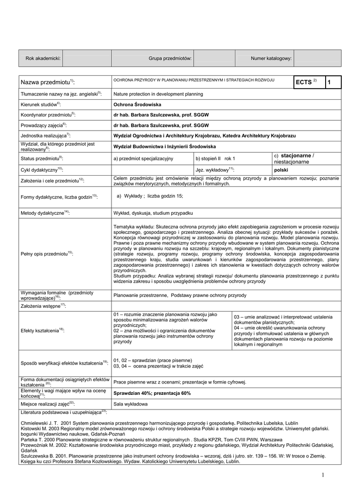 Rok akademicki: Grupa przedmiotów: Numer katalogowy: Nazwa przedmiotu1): OCHRONA PRZYRODY W PLANOWANIU PRZESTRZENNYM I STRATEGIACH ROZWOJU Tłumaczenie nazwy na jęz. angielski3): Nature protection in development planning 4) ECTS 2) 1 Ochrona Środowiska Kierunek studiów : Koordynator przedmiotu5): dr hab. Barbara Szulczewska, prof. SGGW 6) dr hab. Barbara Szulczewska, prof. SGGW Prowadzący zajęcia : 7) Jednostka realizująca : Wydział Ogrodnictwa i Architektury Krajobrazu, Katedra Architektury Krajobrazu Wydział, dla którego przedmiot jest realizowany8): Wydział Budownictwa i Inżynierii Środowiska Status przedmiotu9): a) przedmiot specjalizacyjny 10) b) stopień II rok 1 11) Cykl dydaktyczny : Jęz. wykładowy : c) stacjonarne / niestacjonarne polski Celem przedmiotu jest omówienie relacji między ochroną przyrody a planowaniem rozwoju; poznanie związków merytorycznych, metodycznych i formalnych. 12) Założenia i cele przedmiotu : a) Wykłady ; liczba godzin 15; Formy dydaktyczne, liczba godzin13): Metody dydaktyczne14): Wykład, dyskusja, studium przypadku Pełny opis przedmiotu15): Tematyka wykładu: Skuteczna ochrona przyrody jako efekt zapobiegania zagrożeniom w procesie rozwoju społecznego, gospodarczego i przestrzennego. Analiza obecnej sytuacji: przykłady sukcesów i porażek. Koncepcja równowagi przyrodniczej w zastosowaniu do planowania rozwoju. Model planowania rozwoju. Prawne i poza prawne mechanizmy ochrony przyrody wbudowane w system planowania rozwoju. Ochrona przyrody w planowaniu rozwoju na szczeblu: krajowym, regionalnym i lokalnym. Dokumenty planistyczne (strategie rozwoju, programy rozwoju, programy ochrony środowiska, koncepcja zagospodarowania przestrzennego kraju, studia uwarunkowań i kierunków zagospodarowania przestrzennego, plany zagospodarowania przestrzennego) i zakres ich stanowienia w kwestiach dotyczących ochrony walorów przyrodniczych. Studium przypadku: Analiza wybranej strategii rozwoju/ dokumentu planowania przestrzennego z punktu widzenia zakresu i sposobu uwzględnienia problemów ochrony przyrody Wymagania formalne (przedmioty wprowadzające)16): Planowanie przestrzenne, Podstawy prawne ochrony przyrody Założenia wstępne17): Efekty kształcenia18): 01 – rozumie znaczenie planowania rozwoju jako sposobu minimalizowania zagrożeń walorów przyrodniczych; 02 – zna możliwości i ograniczenia dokumentów planowania rozwoju jako instrumentów ochrony przyrody Sposób weryfikacji efektów kształcenia19): 01, 02 – sprawdzian (prace pisemne) 03, 04 – ocena prezentacji w trakcie zajęć 03 – umie analizować i interpretować ustalenia dokumentów planistycznych; 04 – umie określić uwarunkowania ochrony przyrody i sformułować ustalenia w głównych dokumentach planowania rozwoju na poziomie lokalnym i regionalnym Forma dokumentacji osiągniętych efektów Prace pisemne wraz z ocenami; prezentacje w formie cyfrowej. kształcenia 20): Elementy i wagi mające wpływ na ocenę Sprawdzian 40%; prezentacja 60% końcową21): Miejsce realizacji zajęć22): Sala wykładowa 23) Literatura podstawowa i uzupełniająca : Chmielewski J. T. 2001 System planowania przestrzennego harmonizującego przyrodę i gospodarkę. Politechnika Lubelska, Lublin Kistowski M. 2003 Regionalny model zrównoważonego rozwoju i ochrony środowiska Polski a strategie rozwoju województw. Uniwersytet gdański. bogunki Wydawnictwo naukowe, Gdańsk-Poznań Parteka T. 2000 Planowanie strategiczne w równoważeniu struktur regionalnych . Studia KPZR, Tom CVIII PWN, Warszawa Przewoźniak M. 2002: Kształtowanie środowiska przyrodniczego miast, przykłady z regionu gdańskiego, Wydział Architektury Politechniki Gdańskiej, Gdańsk Szulczewska B. 2001. Planowanie przestrzenne jako instrument ochrony środowiska – wczoraj, dziś i jutro. str. 139 – 156. W: W trosce o Ziemię. Księga ku czci Profesora Stefana Kozłowskiego. Wydaw. Katolickiego Uniwersytetu Lubelskiego, Lublin. 1 Szulczewska B. 2000. Koncepcja rozwoju zrównoważonego jako podstawa strategii regionalnej – uwagi metodyczne. - Człowiek i Środowisko, 2000, z. 2, Warszawa : 121-136. Szulczewska B. 2008. Planowanie przestrzenne a ochrona przyrody. W: Ochrona przyrody. Studia Biura Analiz Sejmowych Kancelarii Sejmu nr 10, Warszawa: 57-79 UWAGI24): Wskaźniki ilościowe charakteryzujące moduł/przedmiot25) : Szacunkowa sumaryczna liczba godzin pracy studenta (kontaktowych i pracy własnej) niezbędna dla osiągnięcia zakładanych efektów kształcenia18) - na tej podstawie należy wypełnić pole ECTS2: Łączna liczba punktów ECTS, którą student uzyskuje na zajęciach wymagających bezpośredniego udziału nauczycieli akademickich: (15 h wykłady + 5 h konsultacje) Łączna liczba punktów ECTS, którą student uzyskuje w ramach zajęć o charakterze praktycznym, takich jak zajęcia laboratoryjne, projektowe, itp.: 30 h (1,2 ECTS) 0,8 ECTS 0 ECTS Tabela zgodności kierunkowych efektów kształcenia efektami przedmiotu 26) Nr /symbol efektu 01 02 Wymienione w wierszu efekty kształcenia: rozumie znaczenie planowania rozwoju jako sposobu minimalizowania zagrożeń walorów przyrodniczych; zna możliwości i ograniczenia dokumentów planowania rozwoju jako instrumentów ochrony przyrody 03 umie analizować i interpretować ustalenia dokumentów planistycznych 04 umie określić uwarunkowania ochrony przyrody i sformułować ustalenia w głównych dokumentach planowania rozwoju na poziomie lokalnym i regionalnym Odniesienie do efektów dla programu kształcenia na kierunku K_W06++: W08 +++ K_W06+; K_W08 ++ K_U03++; K_U09+; K_U10++; K_S03 K_U09+; K_S03++ 2