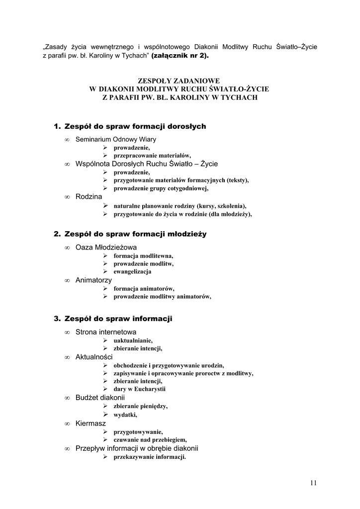 „Zasady życia wewnętrznego i wspólnotowego Diakonii Modlitwy Ruchu Światło–Życie z parafii pw. bł. Karoliny w Tychach” (załącznik nr 2). ZESPOŁY ZADANIOWE W DIAKONII MODLITWY RUCHU ŚWIATŁO-ŻYCIE Z PARAFII PW. BŁ. KAROLINY W TYCHACH 1. Zespół do spraw formacji dorosłych • Seminarium Odnowy Wiary prowadzenie, przepracowanie materiałów, • Wspólnota Dorosłych Ruchu Światło – Życie prowadzenie, przygotowanie materiałów formacyjnych (teksty), prowadzenie grupy cotygodniowej, • Rodzina naturalne planowanie rodziny (kursy, szkolenia), przygotowanie do życia w rodzinie (dla młodzieży), 2. Zespół do spraw formacji młodzieży • Oaza Młodzieżowa formacja modlitewna, prowadzenie modlitw, ewangelizacja • Animatorzy formacja animatorów, prowadzenie modlitwy animatorów, 3. Zespół do spraw informacji • Strona internetowa uaktualnianie, zbieranie intencji, • Aktualności • obchodzenie i przygotowywanie urodzin, zapisywanie i opracowywanie proroctw z modlitwy, zbieranie intencji, dary w Eucharystii Budżet diakonii zbieranie pieniędzy, wydatki, • Kiermasz przygotowywanie, czuwanie nad przebiegiem, • Przepływ informacji w obrębie diakonii przekazywanie informacji. 11