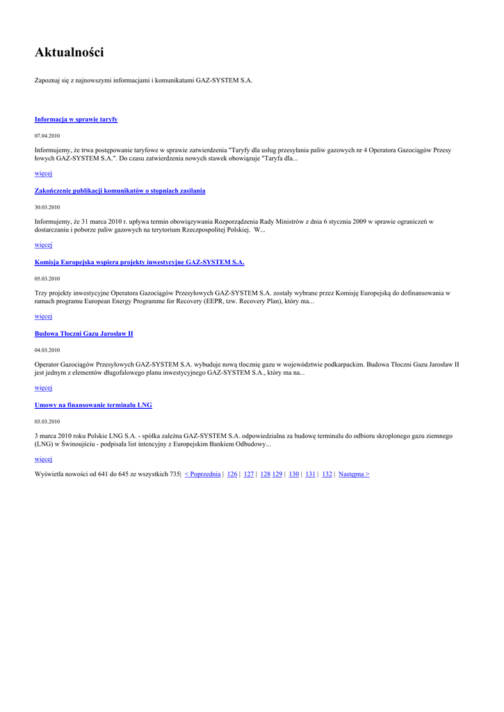 Aktualności Zapoznaj się z najnowszymi informacjami i komunikatami GAZ-SYSTEM S.A. Informacja w sprawie taryfy 07.04.2010 Informujemy, że trwa postępowanie taryfowe w sprawie zatwierdzenia "Taryfy dla usług przesyłania paliw gazowych nr 4 Operatora Gazociągów Przesy łowych GAZ-SYSTEM S.A.". Do czasu zatwierdzenia nowych stawek obowiązuje "Taryfa dla... więcej Zakończenie publikacji komunikatów o stopniach zasilania 30.03.2010 Informujemy, że 31 marca 2010 r. upływa termin obowiązywania Rozporządzenia Rady Ministrów z dnia 6 stycznia 2009 w sprawie ograniczeń w dostarczaniu i poborze paliw gazowych na terytorium Rzeczpospolitej Polskiej. W... więcej Komisja Europejska wspiera projekty inwestycyjne GAZ-SYSTEM S.A. 05.03.2010 Trzy projekty inwestycyjne Operatora Gazociągów Przesyłowych GAZ-SYSTEM S.A. zostały wybrane przez Komisję Europejską do dofinansowania w ramach programu European Energy Programme for Recovery (EEPR, tzw. Recovery Plan), który ma... więcej Budowa Tłoczni Gazu Jarosław II 04.03.2010 Operator Gazociągów Przesyłowych GAZ-SYSTEM S.A. wybuduje nową tłocznię gazu w województwie podkarpackim. Budowa Tłoczni Gazu Jarosław II jest jednym z elementów długofalowego planu inwestycyjnego GAZ-SYSTEM S.A., który ma na... więcej Umowy na finansowanie terminalu LNG 03.03.2010 3 marca 2010 roku Polskie LNG S.A. - spółka zależna GAZ-SYSTEM S.A. odpowiedzialna za budowę terminalu do odbioru skroplonego gazu ziemnego (LNG) w Świnoujściu - podpisała list intencyjny z Europejskim Bankiem Odbudowy... więcej Wyświetla nowości od 641 do 645 ze wszystkich 735| < Poprzednia | 126 | 127 | 128 129 | 130 | 131 | 132 | Następna >