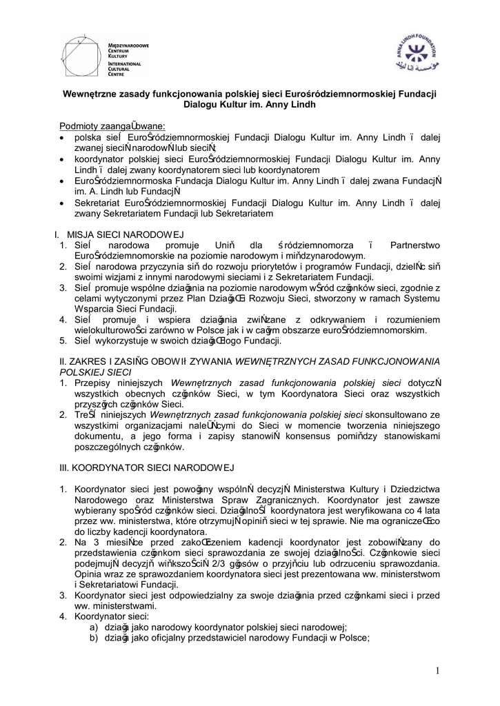 Wewnętrzne zasady funkcjonowania polskiej sieci Eurośródziemnormoskiej Fundacji Dialogu Kultur im. Anny Lindh Podmioty zaangażowane: · polska sieć Eurośródziemnormoskiej Fundacji Dialogu Kultur im. Anny Lindh – dalej zwanej siecią narodową lub siecią; · koordynator polskiej sieci Eurośródziemnormoskiej Fundacji Dialogu Kultur im. Anny Lindh – dalej zwany koordynatorem sieci lub koordynatorem · Eurośródziemnormoska Fundacja Dialogu Kultur im. Anny Lindh – dalej zwana Fundacją im. A. Lindh lub Fundacją · Sekretariat Eurośródziemnormoskiej Fundacji Dialogu Kultur im. Anny Lindh – dalej zwany Sekretariatem Fundacji lub Sekretariatem I. MISJA SIECI NARODOW EJ 1. Sieć narodowa promuje Unię dla Śródziemnomorza – Partnerstwo Eurośródziemnomorskie na poziomie narodowym i międzynarodowym. 2. Sieć narodowa przyczynia się do rozwoju priorytetów i programów Fundacji, dzieląc się swoimi wizjami z innymi narodowymi sieciami i z Sekretariatem Fundacji. 3. Sieć promuje wspólne działania na poziomie narodowym wśród członków sieci, zgodnie z celami wytyczonymi przez Plan Działań i Rozwoju Sieci, stworzony w ramach Systemu Wsparcia Sieci Fundacji. 4. Sieć promuje i wspiera działania związane z odkrywaniem i rozumieniem wielokulturowości zarówno w Polsce jak i w całym obszarze eurośródziemnomorskim. 5. Sieć wykorzystuje w swoich działań logo Fundacji. II. ZAKRES I ZASIĘG OBOW IĄZYWANIA WEWNĘTRZNYCH ZASAD FUNKCJONOW ANIA POLSKIEJ SIECI 1. Przepisy niniejszych Wewnętrznych zasad funkcjonowania polskiej sieci dotyczą wszystkich obecnych członków Sieci, w tym Koordynatora Sieci oraz wszystkich przyszłych członków Sieci. 2. Treść niniejszych Wewnętrznych zasad funkcjonowania polskiej sieci skonsultowano ze wszystkimi organizacjami należącymi do Sieci w momencie tworzenia niniejszego dokumentu, a jego forma i zapisy stanowią konsensus pomiędzy stanowiskami poszczególnych członków. III. KOORDYNA TOR SIECI NARODOW EJ 1. Koordynator sieci jest powołany wspólną decyzją Ministerstwa Kultury i Dziedzictwa Narodowego oraz Ministerstwa Spraw Zagranicznych. Koordynator jest zawsze wybierany spośród członków sieci. Działalność koordynatora jest weryfikowana co 4 lata przez ww. ministerstwa, które otrzymują opinię sieci w tej sprawie. Nie ma ograniczeń co do liczby kadencji koordynatora. 2. Na 3 miesiące przed zakończeniem kadencji koordynator jest zobowiązany do przedstawienia członkom sieci sprawozdania ze swojej działalności. Członkowie sieci podejmują decyzję większością 2/3 głosów o przyjęciu lub odrzuceniu sprawozdania. Opinia wraz ze sprawozdaniem koordynatora sieci jest prezentowana ww. ministerstwom i Sekretariatowi Fundacji. 3. Koordynator sieci jest odpowiedzialny za swoje działania przed członkami sieci i przed ww. ministerstwami. 4. Koordynator sieci: a) działa jako narodowy koordynator polskiej sieci narodowej; b) działa jako oficjalny przedstawiciel narodowy Fundacji w Polsce; 1 c) promuje wizerunek Fundacji jako eurośródziemnomorskiej instytucji ustanowionej w celu wzmocnienia regionalnego wymiaru Partnerstwa Eurośródziemnomorskiego – Unii dla Śródziemnomorza w zakresie spraw społecznych i kulturalnych (trzeci rozdział Deklaracji Barcelońskiej); d) zarządza członkostwami w sieci; identyfikuje potencjalnych, aktywnych członków społeczeństwa obywatelskiego w kraju, którzy mogliby przyłączyć się do sieci; e) bierze udział w tworzeniu rocznych i trzyletnich programów Fundacji biorąc pod uwagę interes swojej sieci narodowej; f) wspiera oraz nadzoruje szkolenia i warsztaty organizowane dla sieci narodowej; g) działa jako specjalista do spraw PR, tworząc materiały promocyjne gotowe do rozpowszechniania oraz przygotowując wkład na stronę Fundacji (mini-website); h) informuje członków sieci o konkursach grantowych, możliwościach współorganizacji wydarzeń członków sieci przez Fundację, sposobach i procedurach ubiegania się o wsparcie ze strony Fundacji; i) wspiera członków sieci w poszukiwaniu partnerów do projektów; w procesie tworzenia współpracy z zagranicznymi partnerami koordynator może przykładać szczególną wagę do członków sieci mających szczególne problemy, natury organizacyjnej lub innej, w korzystaniu z możliwości oferowanych przez Fundację; j) zachęca do składania wniosków o dofinansowanie projektów przez Fundację; k) bierze udział w corocznych spotkaniach koordynatorów sieci narodowych Fundacji. Przed spotkaniem koordynator organizuje spotkanie z członkami sieci lub w inny sposób zapewnia odpowiednią formę konsultacji i dyskusji na poziomie narodowym spraw mających się pojawić na spotkaniu koordynatorów; l) pozostaje w regularnym kontakcie z Sekretariatem Fundacji. IV. CZŁONKOSTWO W SIECI KRAJOW EJ FUNDACJI 1. Polska sieć narodowa jest niezależna od władz narodowych i Sekretariatu Fundacji. 2. Polska sieć narodowa jest stałą częścią Fundacji im. A. Lindh, która działa w ramach Partnerstwa Eurośródziemnomorskiego. 3. Sieć jest otwarta dla wszystkich instytucji, organizacji i innych partnerów, którzy przyjmują zasady i misję Fundacji im. A. Lindh, zdefiniowane w art. II.1 Statutu Fundacji oraz które działają w oparciu o demokratyczne i pluralistyczne zasady oraz wspólnie wyznawane wartości; Sieć, przede wszystkim, reprezentuje społeczeństwo obywatelskie. 4. Członkowie sieci mogą, zgodnie z zasadami, należeć do następujących kategorii: członkowie indywidualni, organizacje pozarządowe, instytucje publiczne, w tym władze lokalne i regionalne, publiczne i prywatne fundacje non-profit, inni partnerzy komercyjni promujący działania non-profit i odpowiedzialną politykę społeczną. 5. Sieci narodowe odzwierciedlają różnorodność społeczeństwa obywatelskiego i są zaproszone do angażowania partnerów działających w następujących obszarach wskazanych przez Fundację: stosunki