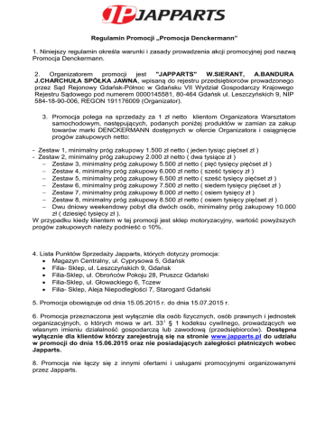 Regulamin Promocji „Promocja Denckermann” 1. Niniejszy regulamin określa warunki i zasady prowadzenia akcji promocyjnej pod nazwą Promocja Denckermann. 2. Organizatorem promocji jest "JAPPARTS" W.SIERANT, A.BANDURA J.CHARCHUŁA SPÓŁKA JAWNA, wpisaną do rejestru przedsiębiorców prowadzonego przez Sąd Rejonowy Gdańsk-Północ w Gdańsku VII Wydział Gospodarczy Krajowego Rejestru Sądowego pod numerem 0000145581, 80-464 Gdańsk ul. Leszczyńskich 9, NIP 584-18-90-006, REGON 191176009 (Organizator). 3. Promocja polega na sprzedaży za 1 zł netto klientom Organizatora Warsztatom samochodowym, następujących, podanych poniżej produktów w zamian za zakup towarów marki DENCKERMANN dostępnych w ofercie Organizatora i osiągnięcie progów zakupowych netto: - Zestaw 1, minimalny próg zakupowy 1.500 zł netto ( jeden tysiąc pięćset zł ) - Zestaw 2, minimalny próg zakupowy 2.000 zł netto ( dwa tysiące zł ) Zestaw 3, minimalny próg zakupowy 5.500 zł netto ( pięć tysięcy pięćset zł ) Zestaw 4, minimalny próg zakupowy 6.000 zł netto ( sześć tysięcy zł ) Zestaw 5, minimalny próg zakupowy 6.500 zł netto ( sześć tysięcy pięćset zł ) Zestaw 6, minimalny próg zakupowy 7.500 zł netto ( siedem tysięcy pięćset zł ) Zestaw 7, minimalny próg zakupowy 8.000 zł netto ( osiem tysięcy zł ) Zestaw 8, minimalny próg zakupowy 8.500 zł netto ( osiem tysięcy pięćset zł ) Dwu dniowy weekendowy pobyt dla dwóch osób, minimalny próg zakupowy 10.000 zł ( dziesięć tysięcy zł ). W przypadku kiedy klientem w tej promocji jest sklep motoryzacyjny, wartość powyższych progów zakupowych należy podnieść o 10%. 4. Lista Punktów Sprzedaży Japparts, których dotyczy promocja: Magazyn Centralny, ul. Cyprysowa 5, Gdańsk Filia- Sklep, ul. Leszczyńskich 9, Gdańsk Filia-Sklep, ul. Obrońców Pokoju 28, Pruszcz Gdański Filia-Sklep, ul. Głowackiego 6, Tczew Filia- Sklep, Aleja Niepodległości 7, Starogard Gdański 5. Promocja obowiązuje od dnia 15.05.2015 r. do dnia 15.07.2015 r. 6. Promocja przeznaczona jest wyłącznie dla osób fizycznych, osób prawnych i jednostek organizacyjnych, o których mowa w art. 33 1 § 1 kodeksu cywilnego, prowadzących we własnym imieniu działalność gospodarczą lub zawodową (przedsiębiorców). Dostępna wyłącznie dla klientów którzy zarejestrują się na stronie www.japparts.pl do udziału w promocji do dnia 15.06.2015 oraz nie posiadających zaległości płatniczych wobec Japparts. 8. Promocja nie łączy się z innymi ofertami i usługami promocyjnymi organizowanymi przez Japparts. 9. W zakresie reklamacji i zwrotów wadliwych towarów, zastosowanie znajdują Ogólne Warunki Zakupu obowiązujące w JAPPARTS i dostępne na stronie www.japparts.pl oraz w Punktach Sprzedaży Japparts, a także przepisy Kodeksu Cywilnego. 10. Klientowi nie przysługują jakiekolwiek roszczenia o wymianę otrzymywanego w promocji produktu na ekwiwalent pieniężny. 11. Regulamin dostępny jest na stronie internetowej organizatora oraz w Punktach Sprzedaży Japparts. 12. Organizator zastrzega sobie niniejsze prawa: - Prawo zmiany niniejszego Regulaminu w każdym czasie bez podania przyczyny, - Prawo do zakończenia Promocji przed upływem okresu trwania Promocji. 13. Oferta jest ważna do dnia, o którym mowa w pkt. 5 lub do dnia wyczerpania zapasów produktów, w zależności od tego co nastąpi wcześniej. Zostanie rozliczona po 31.07.2015.