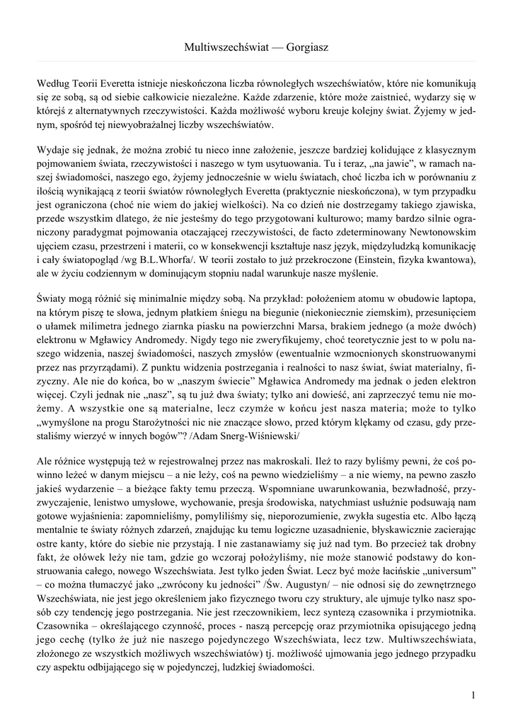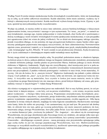 Multiwszechświat — Gorgiasz Według Teorii Everetta istnieje nieskończona liczba równoległych wszechświatów, które nie komunikują się ze sobą, są od siebie całkowicie niezależne. Każde zdarzenie, które może zaistnieć, wydarzy się w którejś z alternatywnych rzeczywistości. Każda możliwość wyboru kreuje kolejny świat. Żyjemy w jednym, spośród tej niewyobrażalnej liczby wszechświatów. Wydaje się jednak, że można zrobić tu nieco inne założenie, jeszcze bardziej kolidujące z klasycznym pojmowaniem świata, rzeczywistości i naszego w tym usytuowania. Tu i teraz, „na jawie”, w ramach naszej świadomości, naszego ego, żyjemy jednocześnie w wielu światach, choć liczba ich w porównaniu z ilością wynikającą z teorii światów równoległych Everetta (praktycznie nieskończona), w tym przypadku jest ograniczona (choć nie wiem do jakiej wielkości). Na co dzień nie dostrzegamy takiego zjawiska, przede wszystkim dlatego, że nie jesteśmy do tego przygotowani kulturowo; mamy bardzo silnie ograniczony paradygmat pojmowania otaczającej rzeczywistości, de facto zdeterminowany Newtonowskim ujęciem czasu, przestrzeni i materii, co w konsekwencji kształtuje nasz język, międzyludzką komunikację i cały światopogląd /wg B.L.Whorfa/. W teorii zostało to już przekroczone (Einstein, fizyka kwantowa), ale w życiu codziennym w dominującym stopniu nadal warunkuje nasze myślenie. Światy mogą różnić się minimalnie między sobą. Na przykład: położeniem atomu w obudowie laptopa, na którym piszę te słowa, jednym płatkiem śniegu na biegunie (niekoniecznie ziemskim), przesunięciem o ułamek milimetra jednego ziarnka piasku na powierzchni Marsa, brakiem jednego (a może dwóch) elektronu w Mgławicy Andromedy. Nigdy tego nie zweryfikujemy, choć teoretycznie jest to w polu naszego widzenia, naszej świadomości, naszych zmysłów (ewentualnie wzmocnionych skonstruowanymi przez nas przyrządami). Z punktu widzenia postrzegania i realności to nasz świat, świat materialny, fizyczny. Ale nie do końca, bo w „naszym świecie” Mgławica Andromedy ma jednak o jeden elektron więcej. Czyli jednak nie „nasz”, są tu już dwa światy; tylko ani dowieść, ani zaprzeczyć temu nie możemy. A wszystkie one są materialne, lecz czymże w końcu jest nasza materia; może to tylko „wymyślone na progu Starożytności nic nie znaczące słowo, przed którym klękamy od czasu, gdy przestaliśmy wierzyć w innych bogów”? /Adam Snerg-Wiśniewski/ Ale różnice występują też w rejestrowalnej przez nas makroskali. Ileż to razy byliśmy pewni, że coś powinno leżeć w danym miejscu – a nie leży, coś na pewno wiedzieliśmy – a nie wiemy, na pewno zaszło jakieś wydarzenie – a bieżące fakty temu przeczą. Wspomniane uwarunkowania, bezwładność, przyzwyczajenie, lenistwo umysłowe, wychowanie, presja środowiska, natychmiast usłużnie podsuwają nam gotowe wyjaśnienia: zapomnieliśmy, pomyliliśmy się, nieporozumienie, zwykła sugestia etc. Albo łączą mentalnie te światy różnych zdarzeń, znajdując ku temu logiczne uzasadnienie, błyskawicznie zacierając ostre kanty, które do siebie nie przystają. I nie zastanawiamy się już nad tym. Bo przecież tak drobny fakt, że ołówek leży nie tam, gdzie go wczoraj położyliśmy, nie może stanowić podstawy do konstruowania całego, nowego Wszechświata. Jest tylko jeden Świat. Lecz być może łacińskie „universum” – co można tłumaczyć jako „zwrócony ku jedności” /Św. Augustyn/ – nie odnosi się do zewnętrznego Wszechświata, nie jest jego określeniem jako fizycznego tworu czy struktury, ale ujmuje tylko nasz sposób czy tendencję jego postrzegania. Nie jest rzeczownikiem, lecz syntezą czasownika i przymiotnika. Czasownika – określającego czynność, proces - naszą percepcję oraz przymiotnika opisującego jedną jego cechę (tylko że już nie naszego pojedynczego Wszechświata, lecz tzw. Multiwszechświata, złożonego ze wszystkich możliwych wszechświatów) tj. możliwość ujmowania jego jednego przypadku czy aspektu odbijającego się w pojedynczej, ludzkiej świadomości. 1 Mamy więc jeden Wszechświat, będący odzwierciedleniem, jednym z niezliczonych odzwierciedleń Multiwszechświata. Ale to moje, subiektywne jego odbicie w mojej świadomości. Tylko ja je postrzegam. Twoje jest inne. Może różni się jednym listkiem na drzewie w parku, w którym kiedyś się spotkamy i spacerując, będziemy rozmawiać o światach równoległych. I może wtedy zdamy sobie sprawę, że każdy z nas idzie we własnym świecie (skoro jest ich nieskończona liczba, to po cóż tłoczyć się w jednym?), że każdy z nas dźwiga (nie zważając na ich ciężar) miliardy własnych galaktyk. A jeśli uświadomimy sobie, że to, co nazywamy światem, to tylko elektryczne sygnały w naszym mózgu o napięciu ułamków volta, to łatwiej będzie je nam dźwigać. I gdzieś, w jednym ze światów, te nasze własne, subiektywne światy spotykają się, przenikają i zazębiają, tworząc wspólną płaszczyznę, na której możemy się porozumiewać i wspólnie cieszyć obrazem jednej, wspólnej rzeczywistości (oczywiście pod warunkiem, że nie będziemy liczyć listków na drzewach, o atomach nie wspominając). Ten tzw. „obiektywny” Wszechświat, w którym wspólnie spacerujemy i dyskutujemy, jest tylko (albo aż) wypadkową praktycznie nieskończonej liczby subiektywnych Wszechświatów, Wszechświatów realnie istniejących (nie ma to nic wspólnego z solipsyzmem w ujęciu sofisty Gorgiasza), materialnych, fizycznych – oczywiście w naszym pojęciu, a innym na razie raczej nie dysponujemy, choć dałoby się takowe znaleźć, np. u niektórych szczepów Indian – a w jaki sposób zachodzi to połączenie, tego wyjaśnić dziś nie potrafimy. Objęcie myślą i zrozumieniem Multiwszechświata też chyba się nie uda, choć werbalnie już do