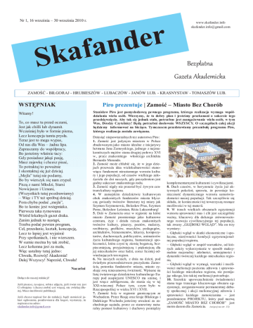 Nr 1, 16 września – 30 września 2010 r. r e d n a f a k S www.skafander.info [email protected] Bezpłatna Gazeta Akademicka ZAMOŚĆ - BIŁGORAJ - HRUBIESZÓW - LUBACZÓW - JANÓW LUB. - KRASNYSTAW - TOMASZÓW LUB. WSTĘPNIAK Piro prezentuje | Zamość – Miasto Bez Chorób Witamy! To, co masz tu przed oczami, Jest jak chilli lub dynamit. Wcześniej było w formie pisma, Lecz koncepcja tamta prysła. Teraz jest to mega wypas, Od nas dla Was – żadna lipa. Zapraszamy do współpracy, Bo jesteśmy właśnie tacy: Gdy posiadasz jakąś pasję, Masz zajawkę i chcesz pisać, To potraktuj to poważnie I skontaktuj się już dzisiaj. „Mejla” tutaj nie podamy, Bo by wierszyk się nam zrypał. Piszą z nami Młodzi, Starsi Nowicjusze i Uznani, (Wszystkich tutaj pozdrawiamy) – Więc i TY też spróbuj dzisiaj. Pora chyba podać „mejla”, Bo to koniec jest wstępniaka. Pierwsza taka rymowana Wśród lokalnych gazet draka. Zanim jednak to nastąpi, Trzeba podać pewien program, Cel, przesłanie, kształt, koncepcję, Lecz to lepiej jest wyjaśnić Przy spotkaniach, i nie wierszem. W sumie można by tak zrobić, Lecz kolumna jest za mała, Więc ustalmy tutaj jedno: Chwała, Rozwój! Akademia! Dalej Wszyscy! Naprzód, Chwała! Naczelni Dołącz do naszej redakcji! Jeśli piszesz, rysujesz, robisz zdjęcia, jeśli świat n ie jest Ci obojętny i chcesz zrobić coś więcej, nie zwlekaj dłużej. Masz mo żliwość publikacji. Jeśli chcesz napisać list do redakcji, bądź zamieścić jakieś ogłoszenie, pozdro wien ie dla kogoś, wystarczy, że napiszesz na adres: skafander.info@g mail.co m Stanisław Piro jest pomysłodawcą pe wnego programu, którego realizacja wymaga współdziałania wielu osób. Wierzymy, że to dobry plan i jesteśmy przekonani o sukcesie tego przedsięwzięcia. Aby tak się jednak stało, potrzebne jest zaangażowanie wielu osób, w tym Was, Drodzy Czytelnicy! Będą potrzebni dosłownie WSZYSCY. O s zczegółach całej akcji będzie my informować na bie żąco. Tymczasem przedstawiamy preambułę programu Piro, którego realizacja została zawiązana. Dziesięć niepowtarzalnych tez autorstwa Piro: 1. Zamość jest jedynym miastem w Polsce zbudowanym jako miasto idealne z inicjatywy hetmana Jana Zamoyskiego, jednego z najznakomitszych mężów stanu drugiej połowy XVI w., przez znakomitego włoskiego architekta Bernardo Morando. 2. Zamość może chlubić się, że w jego dziejach przeważa idea wielokulturowości stanowiąca fundament nieustannego wzrostu kultury i jego populacji, od czasów wielkiego założyciela do dni naszych, gdy prezydentem jest godny sukcesor znakomitego rodu. 3. Zamość nigdy nie przestał być żywym centrum kultury regionu. 4. W zamojskim dziedzictwie kulturowym obok znakomitych fundatorów miasta błyszczą gwiazdy twórców literatury tej miary jak Szymon Szymonowic, Bolesław Prus, Szymon Perec, Bolesław Leśmian, Róża Luksemburg! 5. Dziś w Zamościu oraz w regionie na które miasto Zamość promieniuje jako kulturowe centrum, żyje i działa rzesza znakomitych twórców kultury, pisarzy, poetów, malarzy, rzeźbiarzy, grafików, muzyków, pedagogów, architektów, biznesmenów, lekarzy, kompozytorów, duchownych, publicystów, animatorów życia kulturalnego regionu, humanizacji społeczności, która czyni tę ziemię bogatszą, bezpieczniejszą, przyjaźniejszą i piękniejszą dla jej mieszkańców oraz ludzi, coraz liczniej odwiedzających ten region. 6. Na naszych oczach, z dnia na dzień, pod światłym przewodnictwem prezydenta Zamościa, potomka fundatorów miasta, miasto zyskuje swą renesansową świetność. Wpisane na listę światowego dziedzictwa kulturalnego Europy pod auspicjami UNESCO ma szansę, i jest wręcz zobligowane, do stania się w tej XXI-wiecznej Polsce tym, czym było w Rzeczpospolitej w wieku XVI i XVII. 7. Zamość leży w regionie graniczącym ze Wschodem. Przez Rosję oraz kraje Bliskiego i Dalekiego Wschodu jesteśmy uważani za zachodniego sąsiada, przez co stanowimy naturalny pomost kulturowy i duchowy pomiędzy komplementarnymi kulturami i cywilizacjami. 8. Duch czasów, w horyzoncie życia już aktywnych pokoleń, sprawia, że powstaje konieczność dynamicznego wzrostu samoświadomości naszej populacji. Tak szczęśliwie się składa, że konieczności tej towarzyszą rosnące możliwości w tej materii. 9. W trzech wielkich obszarach egzystencji wzrostu sprawności mas i elit jest szczególnie ważny, kluczowy dla dalszego zrównoważonego rozwoju cywilizacyjnego tej populacji, tak zwany „GŁĘBOKI WGLĄD”. Ma on trzy wymiary: – Głęboki wgląd w skutki ekonomiczne i społeczne, nierówności kondycji egzystencjonalnej populacji regionu, – Głęboki wgląd w zespół warunków, od których zależy wykorzystanie w sposób maksymalnie racjonalny: zdolności, umiejętności i dynamiki twórczej każdego mieszkańca regionu, – Głęboki wgląd w wymogi, warunki i możliwości melioracji poziomu zdrowia i sprawności każdego mieszkańca regionu, nie pomijając nikogo, kto takiej melioracji potrzebuje. 10. Szerokie upowszechnienie świadomości stanu tego trzeciego kluczowego obszaru egzystencji, zorganizowanie permanentnej debaty społecznej i akcji melioracyjnej zdrowia i sprawności każdego zamościanina – jest przedmiotem PROJEKTU, który pod nazwą „ZAMOŚĆ MIASTO BEZ CHORÓB” jest moim darem dla Zamościa. (więcej na str. 11) 2 www.skafander.info Wydarzenia Dofinansowanie Muzeum Fortyfikacji i Broni Zanussi odsłonił swoją tablicę w Alei Sław Reżyser Krzysztof Zanussi odsłonił swoją tablicę w zamojskiej Alei Sław. W ten sposób mieszkańcy miasta uhonorowali go za wkład w promocję Zamościa. Zanussi od kilkunastu lat patronuje Festiwalowi Filmów Religijnych „Sacrofilm”. Tablicę z brązu wykonał zamojski rzeźbiarz Bartłomiej Sęczawa. Znajduje się na niej napis „Krzysztof Zanussi – filmowiec, pedagog” oraz odciski butów reżysera.