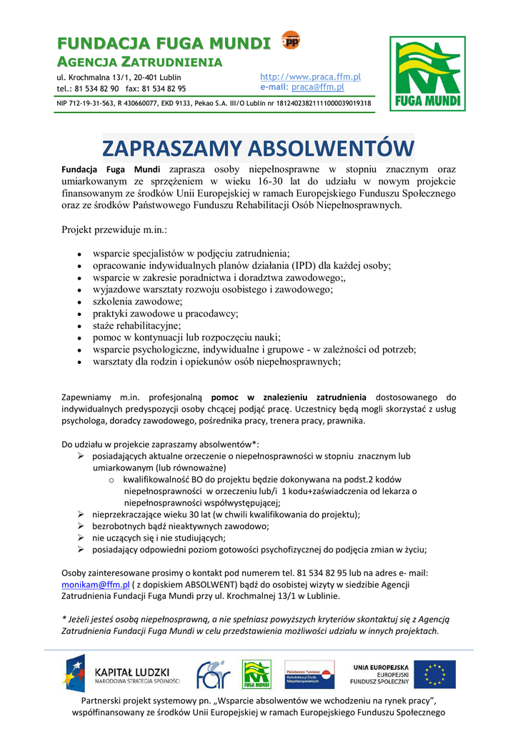 FUNDACJA FUGA MUNDI AGENCJA ZATRUDNIENIA ul. Krochmalna 13/1, 20-401 Lublin tel.: 81 534 82 90 fax: 81 534 82 95 http://www.praca.ffm.pl e-mail: [email protected] NIP 712-19-31-563, R 430660077, EKD 9133, Pek ao S.A. III/O Lubl in nr 18124023821111000039019318 ZAPRASZAMY ABSOLWENTÓW Fundacja Fuga Mundi zaprasza osoby niepełnosprawne w stopniu znacznym oraz umiarkowanym ze sprzężeniem w wieku 16-30 lat do udziału w nowym projekcie finansowanym ze środków Unii Europejskiej w ramach Europejskiego Funduszu Społecznego oraz ze środków Państwowego Funduszu Rehabilitacji Osób Niepełnosprawnych. Projekt przewiduje m.in.: wsparcie specjalistów w podjęciu zatrudnienia; opracowanie indywidualnych planów działania (IPD) dla każdej osoby; wsparcie w zakresie poradnictwa i doradztwa zawodowego;, wyjazdowe warsztaty rozwoju osobistego i zawodowego; szkolenia zawodowe; praktyki zawodowe u pracodawcy; staże rehabilitacyjne; pomoc w kontynuacji lub rozpoczęciu nauki; wsparcie psychologiczne, indywidualne i grupowe - w zależności od potrzeb; warsztaty dla rodzin i opiekunów osób niepełnosprawnych; Zapewniamy m.in. profesjonalną pomoc w znalezieniu zatrudnienia dostosowanego do indywidualnych predyspozycji osoby chcącej podjąć pracę. Uczestnicy będą mogli skorzystać z usług psychologa, doradcy zawodowego, pośrednika pracy, trenera pracy, prawnika. Do udziału w projekcie zapraszamy absolwentów*: posiadających aktualne orzeczenie o niepełnosprawności w stopniu znacznym lub umiarkowanym (lub równoważne) o kwalifikowalność BO do projektu będzie dokonywana na podst.2 kodów niepełnosprawności w orzeczeniu lub/i 1 kodu+zaświadczenia od lekarza o niepełnosprawności współwystępującej; nieprzekraczające wieku 30 lat (w chwili kwalifikowania do projektu); bezrobotnych bądź nieaktywnych zawodowo; nie uczących się i nie studiujących; posiadający odpowiedni poziom gotowości psychofizycznej do podjęcia zmian w życiu; Osoby zainteresowane prosimy o kontakt pod numerem tel. 81 534 82 95 lub na adres e- mail: [email protected] ( z dopiskiem ABSOLWENT) bądź do osobistej wizyty w siedzibie Agencji Zatrudnienia Fundacji Fuga Mundi przy ul. Krochmalnej 13/1 w Lublinie. * Jeżeli jesteś osobą niepełnosprawną, a nie spełniasz powyższych kryteriów skontaktuj się z Agencją Zatrudnienia Fundacji Fuga Mundi w celu przedstawienia możliwości udziału w innych projektach. Partnerski projekt systemowy pn. „Wsparcie absolwentów we wchodzeniu na rynek pracy”, współfinansowany ze środków Unii Europejskiej w ramach Europejskiego Funduszu Społecznego