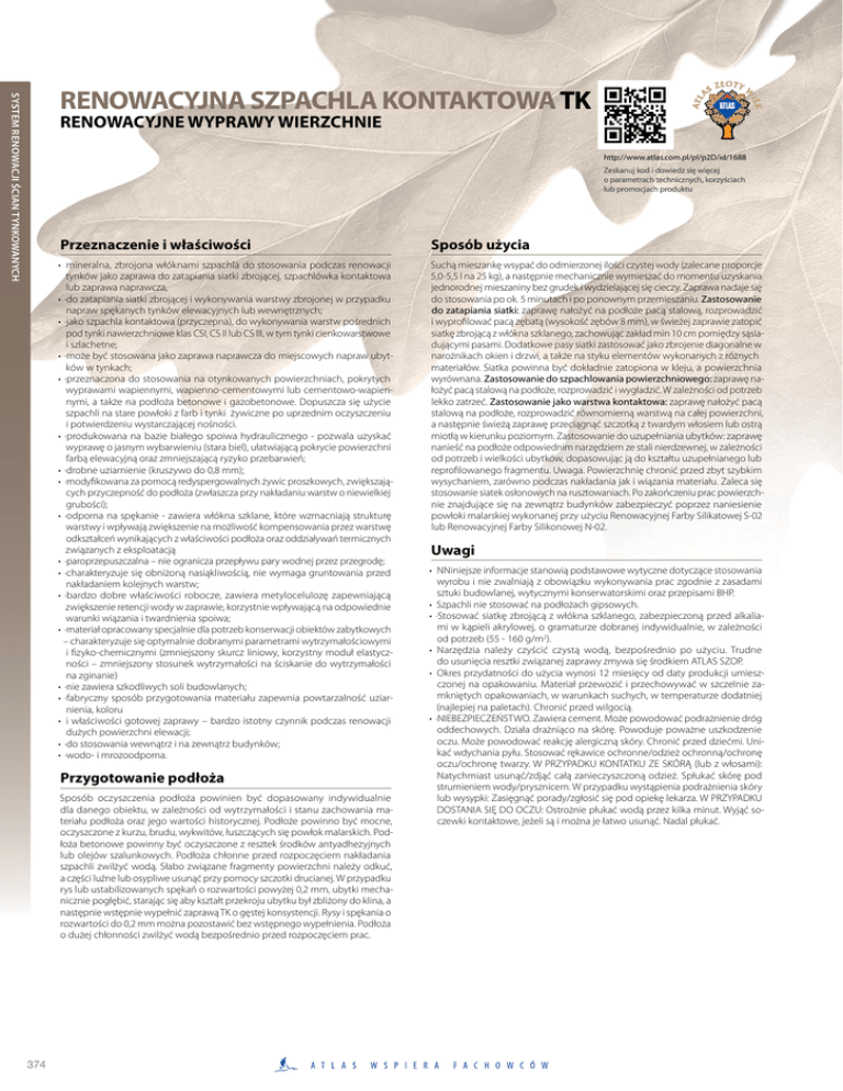 SYSTEM RENOWACJI ŚCIAN TYNKOWANYCH RENOWACYJNA SZPACHLA KONTAKTOWA TK RENOWACYJNE WYPRAWY WIERZCHNIE http://www.atlas.com.pl/pl/p2D/id/1688 Zeskanuj kod i dowiedz się więcej o parametrach technicznych, korzyściach lub promocjach produktu Przeznaczenie i właściwości Sposób użycia • mineralna, zbrojona włóknami szpachla do stosowania podczas renowacji tynków jako zaprawa do zatapiania siatki zbrojącej, szpachlówka kontaktowa lub zaprawa naprawcza, • ·do zatapiania siatki zbrojącej i wykonywania warstwy zbrojonej w przypadku napraw spękanych tynków elewacyjnych lub wewnętrznych; • ·jako szpachla kontaktowa (przyczepna), do wykonywania warstw pośrednich pod tynki nawierzchniowe klas CSI, CS II lub CS III, w tym tynki cienkowarstwowe i szlachetne; • ·może być stosowana jako zaprawa naprawcza do miejscowych napraw ubytków w tynkach; • ·przeznaczona do stosowania na otynkowanych powierzchniach, pokrytych wyprawami wapiennymi, wapienno-cementowymi lub cementowo-wapiennymi, a także na podłoża betonowe i gazobetonowe. Dopuszcza się użycie szpachli na stare powłoki z farb i tynki żywiczne po uprzednim oczyszczeniu i potwierdzeniu wystarczającej nośności. • ·produkowana na bazie białego spoiwa hydraulicznego - pozwala uzyskać wyprawę o jasnym wybarwieniu (stara biel), ułatwiającą pokrycie powierzchni farbą elewacyjną oraz zmniejszającą ryzyko przebarwień; • ·drobne uziarnienie (kruszywo do 0,8 mm); • ·modyfikowana za pomocą redyspergowalnych żywic proszkowych, zwiększających przyczepność do podłoża (zwłaszcza przy nakładaniu warstw o niewielkiej grubości); • ·odporna na spękanie - zawiera włókna szklane, które wzmacniają strukturę warstwy i wpływają zwiększenie na możliwość kompensowania przez warstwę odkształceń wynikających z właściwości podłoża oraz oddziaływań termicznych związanych z eksploatacją • ·paroprzepuszczalna – nie ogranicza przepływu pary wodnej przez przegrodę; • ·charakteryzuje się obniżoną nasiąkliwością, nie wymaga gruntowania przed nakładaniem kolejnych warstw; • ·bardzo dobre właściwości robocze, zawiera metylocelulozę zapewniającą zwiększenie retencji wody w zaprawie, korzystnie wpływającą na odpowiednie warunki wiązania i twardnienia spoiwa; • ·materiał opracowany specjalnie dla potrzeb konserwacji obiektów zabytkowych – charakteryzuje się optymalnie dobranymi parametrami wytrzymałościowymi i fizyko-chemicznymi (zmniejszony skurcz liniowy, korzystny moduł elastyczności – zmniejszony stosunek wytrzymałości na ściskanie do wytrzymałości na zginanie) • ·nie zawiera szkodliwych soli budowlanych; • ·fabryczny sposób przygotowania materiału zapewnia powtarzalność uziarnienia, koloru • i właściwości gotowej zaprawy – bardzo istotny czynnik podczas renowacji dużych powierzchni elewacji; • ·do stosowania wewnątrz i na zewnątrz budynków; • ·wodo- i mrozoodporna. Suchą mieszankę wsypać do odmierzonej ilości czystej wody (zalecane proporcje 5,0-5,5 l na 25 kg), a następnie mechanicznie wymieszać do momentu uzyskania jednorodnej mieszaniny bez grudek i wydzielającej się cieczy. Zaprawa nadaje się do stosowania po ok. 5 minutach i po ponownym przemieszaniu. Zastosowanie do zatapiania siatki: zaprawę nałożyć na podłoże pacą stalową, rozprowadzić i wyprofilować pacą zębatą (wysokość zębów 8 mm), w świeżej zaprawie zatopić siatkę zbrojącą z włókna szklanego, zachowując zakład min 10 cm pomiędzy sąsiadującymi pasami. Dodatkowe pasy siatki zastosować jako zbrojenie diagonalne w narożnikach okien i drzwi, a także na styku elementów wykonanych z różnych materiałów. Siatka powinna być dokładnie zatopiona w kleju, a powierzchnia wyrównana. Zastosowanie do szpachlowania powierzchniowego: zaprawę nałożyć pacą stalową na podłoże, rozprowadzić i wygładzić. W zależności od potrzeb lekko zatrzeć. Zastosowanie jako warstwa kontaktowa: zaprawę nałożyć pacą stalową na podłoże, rozprowadzić równomierną warstwą na całej powierzchni, a następnie świeżą zaprawę przeciągnąć szczotką z twardym włosiem lub ostrą miotłą w kierunku poziomym. Zastosowanie do uzupełniania ubytków: zaprawę nanieść na podłoże odpowiednim narzędziem ze stali nierdzewnej, w zależności od potrzeb i wielkości ubytków, dopasowując ją do kształtu uzupełnianego lub reprofilowanego fragmentu. Uwaga. Powierzchnię chronić przed zbyt szybkim wysychaniem, zarówno podczas nakładania jak i wiązania materiału. Zaleca się stosowanie siatek osłonowych na rusztowaniach. Po zakończeniu prac powierzchnie znajdujące się na zewnątrz budynków zabezpieczyć poprzez naniesienie powłoki malarskiej wykonanej przy użyciu Renowacyjnej Farby Silikatowej S-02 lub Renowacyjnej Farby Silikonowej N-02. Przygotowanie podłoża Sposób oczyszczenia podłoża powinien być dopasowany indywidualnie dla danego obiektu, w zależności od wytrzymałości i stanu zachowania materiału podłoża oraz jego wartości historycznej. Podłoże powinno być mocne, oczyszczone z kurzu, brudu, wykwitów, łuszczących się powłok malarskich. Podłoża betonowe powinny być oczyszczone z resztek środków antyadhezyjnych lub olejów szalunkowych. Podłoża chłonne przed rozpoczęciem nakładania szpachli zwilżyć wodą. Słabo związane fragmenty powierzchni należy odkuć, a części luźne lub osypliwe usunąć przy pomocy szczotki drucianej. W przypadku rys lub ustabilizowanych spękań o rozwartości powyżej 0,2 mm, ubytki mechanicznie pogłębić, starając się aby kształt przekroju ubytku był zbliżony do klina, a następnie wstępnie wypełnić zaprawą TK o gęstej konsystencji. Rysy i spękania o rozwartości do 0,2 mm można pozostawić bez wstępnego wypełnienia. Podłoża o dużej chłonności zwilżyć wodą bezpośrednio przed rozpoczęciem prac. 374 Uwagi • NNiniejsz