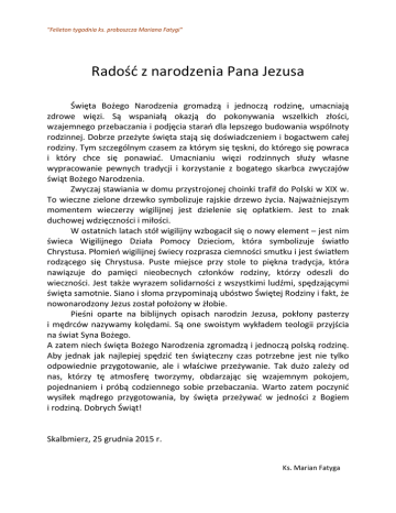 "Felieton tygodnia ks. proboszcza Mariana Fatygi" Radość z narodzenia Pana Jezusa Święta Bożego Narodzenia gromadzą i jednoczą rodzinę, umacniają zdrowe więzi. Są wspaniałą okazją do pokonywania wszelkich złości, wzajemnego przebaczania i podjęcia starań dla lepszego budowania wspólnoty rodzinnej. Dobrze przeżyte święta stają się doświadczeniem i bogactwem całej rodziny. Tym szczególnym czasem za którym się tęskni, do którego się powraca i który chce się ponawiać. Umacnianiu więzi rodzinnych służy własne wypracowanie pewnych tradycji i korzystanie z bogatego skarbca zwyczajów świąt Bożego Narodzenia. Zwyczaj stawiania w domu przystrojonej choinki trafił do Polski w XIX w. To wieczne zielone drzewko symbolizuje rajskie drzewo życia. Najważniejszym momentem wieczerzy wigilijnej jest dzielenie się opłatkiem. Jest to znak duchowej wdzięczności i miłości. W ostatnich latach stół wigilijny wzbogacił się o nowy element – jest nim świeca Wigilijnego Działa Pomocy Dzieciom, która symbolizuje światło Chrystusa. Płomień wigilijnej świecy rozprasza ciemności smutku i jest światłem rodzącego się Chrystusa. Puste miejsce przy stole to piękna tradycja, która nawiązuje do pamięci nieobecnych członków rodziny, którzy odeszli do wieczności. Jest także wyrazem solidarności z wszystkimi ludźmi, spędzającymi święta samotnie. Siano i słoma przypominają ubóstwo Świętej Rodziny i fakt, że nowonarodzony Jezus został położony w żłobie. Pieśni oparte na biblijnych opisach narodzin Jezusa, pokłony pasterzy i mędrców nazywamy kolędami. Są one swoistym wykładem teologii przyjścia na świat Syna Bożego. A zatem niech święta Bożego Narodzenia zgromadzą i jednoczą polską rodzinę. Aby jednak jak najlepiej spędzić ten świąteczny czas potrzebne jest nie tylko odpowiednie przygotowanie, ale i właściwe przeżywanie. Tak dużo zależy od nas, którzy tę atmosferę tworzymy, obdarzając się wzajemnym pokojem, pojednaniem i próbą codziennego sobie przebaczania. Warto zatem poczynić wysiłek mądrego przygotowania, by święta przeżywać w jedności z Bogiem i rodziną. Dobrych Świąt! Skalbmierz, 25 grudnia 2015 r. Ks. Marian Fatyga