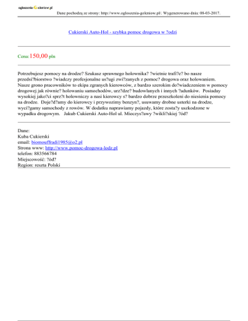 Dane pochodzą ze strony: http://www.ogloszenia-goleniow.pl/. Wygenerowano dnia: 08-03-2017. Cukierski Auto-Hol - szybka pomoc drogowa w ?odzi Cena:150,00 pln Potrzebujesz pomocy na drodze? Szukasz sprawnego holownika? ?wietnie trafi?e? bo nasze przedsi?biorstwo ?wiadczy profesjonalne us?ugi zwi?zanych z pomoc? drogowa oraz holowaniem. Nasze grono pracowników to ekipa zgranych kierowców, z bardzo szerokim do?wiadczeniem w pomocy drogowej jak równie? holowaniu samochodów, urz?dze? budowlanych i innych ?adunków. Posiaday wysokiej jako?ci sprz?t holowniczy a nasi kierowcy s? bardzo dobrze przeszkoleni do niesienia pomocy na drodze. Doje?d?amy do kierowcy i przywozimy benzyn?, usuwamy drobne usterki na drodze, wyci?gamy samochody z rowów. W dodatku naprawiamy pojazdy, które zosta?y uszkodzone w wypadku drogowym. Jakub Cukierski Auto-Hol ul. Mieczys?awy ?wikli?skiej ?ód? Dane: Kuba Cukierski email: [email protected] Strona www: http://www.pomoc-drogowa-lodz.pl telefon: 883566784 Miejscowość: ?ód? Region: reszta Polski