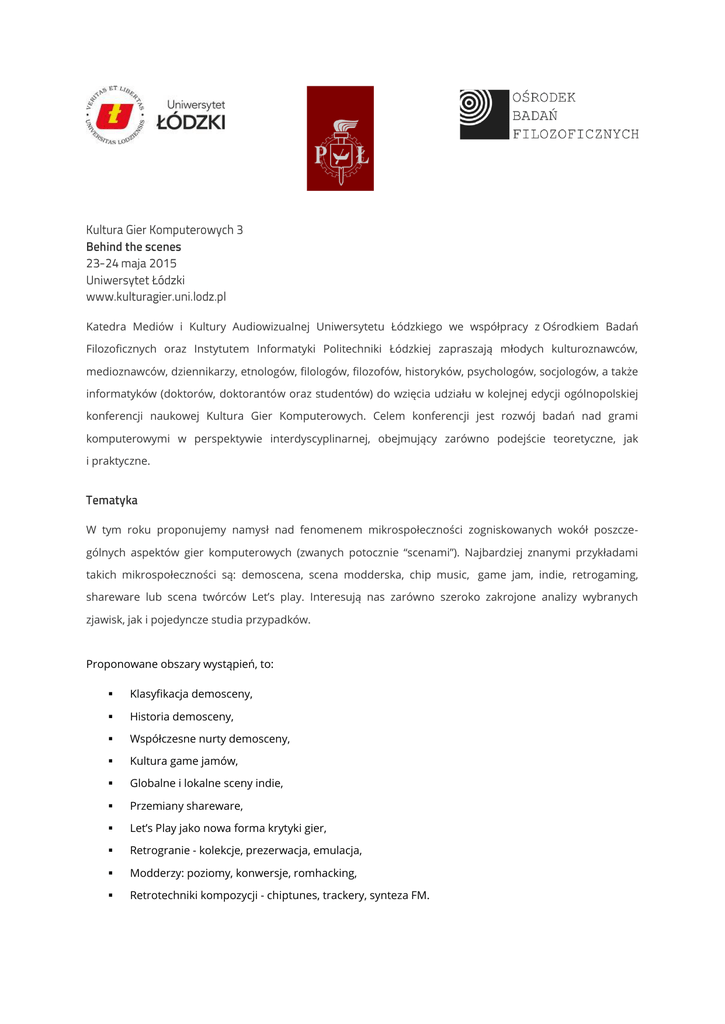 Katedra Mediów i Kultury Audiowizualnej Uniwersytetu Łódzkiego we współpracy z Ośrodkiem Badań Filozoficznych oraz Instytutem Informatyki Politechniki Łódzkiej zapraszają młodych kulturoznawców, medioznawców, dziennikarzy, etnologów, filologów, filozofów, historyków, psychologów, socjologów, a także informatyków (doktorów, doktorantów oraz studentów) do wzięcia udziału w kolejnej edycji ogólnopolskiej konferencji naukowej Kultura Gier Komputerowych. Celem konferencji jest rozwój badań nad grami komputerowymi w perspektywie interdyscyplinarnej, obejmujący zarówno podejście teoretyczne, jak i praktyczne. W tym roku proponujemy namysł nad fenomenem mikrospołeczności zogniskowanych wokół poszczególnych aspektów gier komputerowych (zwanych potocznie “scenami”). Najbardziej znanymi przykładami takich mikrospołeczności są: demoscena, scena modderska, chip music, game jam, indie, retrogaming, shareware lub scena twórców Let’s play. Interesują nas zarówno szeroko zakrojone analizy wybranych zjawisk, jak i pojedyncze studia przypadków. Proponowane obszary wystąpień, to: Klasyfikacja demosceny, Historia demosceny, Współczesne nurty demosceny, Kultura game jamów, Globalne i lokalne sceny indie, Przemiany shareware, Let’s Play jako nowa forma krytyki gier, Retrogranie - kolekcje, prezerwacja, emulacja, Modderzy: poziomy, konwersje, romhacking, Retrotechniki kompozycji - chiptunes, trackery, synteza FM. Gościem specjalnym konferencji jest Markku Reunanen (Finlandia), czołowy badacz demosceny na świecie, doktorant na Uniwersytecie w Turku i wykładowca na Uniwersytecie Aalto w Espoo. Autor rozprawy „Computer Demos – What Makes Them Tick?” (2010), która jest jednym z nielicznych opracowań akademickich poruszającym problematykę dem komputerowych i kultury demosceny. Markku jest współtwórcą i redaktorem Demoscene Research – bibliografii on-line, która od 2004 roku zbiera publikacje związane z demosceną. Przewidujemy wystąpienia 20-minutowe, w językach polskim i angielskim (bez tłumaczenia). Prosimy o nadsyłanie abstraktów (do 300 słów) do 31 marca 2015 roku korzystając z serwisu Easychair (https://easychair.org/conferences/?conf=cgc3). Informacje o przyjęciu będą rozesłane do 20 kwietnia 2015 roku. Wybrane referaty zostaną opublikowane w czasopiśmie groznawczym “Replay. The Polish Journal of Game Studies”. Opłatę konferencyjną w wysokości 80 zł (tzw. Early bird) można wpłacać do 30 kwietnia 2015 roku, później jej kwota wzrasta do 120 zł. Opłata konferencyjna pokrywa koszty organizacji konferencji, przerw kawowych i publikacji pokonferencyjnej. Koszty podróży, zakwaterowania i wyżywienia uczestnicy pokrywają we własnym zakresie. Wpłat należy dokonywać na numer rachunku Wydziału Filologicznego UŁ: 96 1240 3028 1111 0010 2943 1767, z dopiskiem: „Konferencja gry”. Organizator konferencji zobowiązany jest do wystawienia faktury tylko i wyłącznie na osobę lub instytucję dokonującą wpłaty na konto UŁ. Jeśli opłata jest dokonywana z konta innego, niż fakturowanej instytucji – należy podać w tytule przelewu jej dane (nazwę, adres i NIP). Dr Maria B. Garda Dr Paweł Grabarczyk Prof. dr. hab. Ryszard W. Kluszczyński Dr hab. prof. UŁ Piotr Sitarski Dr Katarzyna Prajzner Dr Marcin Składanek Dr Rafał Szrajber Dr Adam Wojciechowski Mgr Marcin M. Chojnacki Mgr Dominika Staszenko