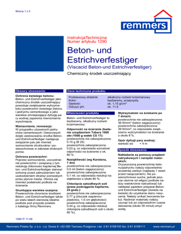 Strona 1 z 3 InstrukcjaTechniczna Numer artykułu 1290 Beton- und Estrichverfestiger (Viscacid Beton-und Estrichverfestiger) Chemiczny środek uszczelniający Obszary stosowania: Ochrona świeżego betonu: Beton- und Estrichverfestiger jako chemiczny środek uszczelniający powoduje zwiększenie wytrzymałości powierzchni świeżego betonu i jastrychu cementowego a jako warstwa zmniejszająca dyfuzję pary wodnej zapewnia równomierne wyschnięcie. Wzmacnianie, renowacja: W przypadku używanych jastrychów cementowych i betonowych dzięki zastosowaniu środka Betonund Estrichverfestiger następuje związanie pyłu jak również wzmocnienie strukturalne i powierzchniowe w zakresie drobnych porów. Ochrona powierzchni: Poprzez wzmocnienie, uszczelnienie powierzchni i związaną z tym redukcję chłonności kapilarnej Beton- und Estrichverfestiger stanowi ochronę przed zabrudzeniem lub uszkodzeniem struktur porowatych przez płynne media. Obniża się również podatność podłoża na ścieranie. Gruntująca warstwa sczepna: Powierzchnie chronione środkiem Beton- und Estrichverfestiger także po wielu latach stanowią idealne podłoże pod przyszłe powłoki z katalogu firmy Remmers. Dane techniczne produktu Podstawowy składnik: Kolor: Gęstość: Odczyn pH: alkaliczny roztwór krzemianowy bezbarwny, przejrzysty ok. 1,15 g/cm³ ok. 11,5 Właściwości produktu Beton- und Estrichverfestiger to bezbarwny, alkaliczny roztwór krzemianowy: Odporność na ścieranie (badanie urządzeniem Tabera 1000 obr./1000 g wałek CS 17): powierzchnia nie zabezpieczona: 0,15 g (B 25) powierzchnia zabezpieczona: 0,03 g, co odpowiada wzrostowi odporności na ścieranie o ok. 80 %. Nasiąkliwość (wg Karstena, 7 dni) powierzchnia nie zabezpieczona: 0,5 ml (beton zagęszczony) powierzchnia zabezpieczona: 0,1 ml, co odpowiada redukcji nasiąkliwości o około 80 %. Chłonięcie szkodliwych soli (przez podciąganie kapilarne, 24 godz.): powierzchnia nie zabezpieczona: 0,77 g (bloczek wapiennopiaskowy, 1,5 cm głębokości) powierzchnia zabezpieczona: 0,44 g, co odpowiada redukcji chłonięcia szkodliwych soli o około 60 %). Wytrzymałość na ściskanie po 7 dniach: powierzchnia nie zabezpieczona: 36 N/mm² (beton zagęszczony) powierzchnia zabezpieczona: 39 N/mm², co odpowiada zwiększeniu wytrzymałości na ściskanie o około 8 %. Opór dyfuzji pary wodnej: wartość sd: <4m Sposób stosowania Nakładanie za pomocą urządzeń natryskowych i narzędzi malarskich: Oczyszczoną powierzchnię betonu/jastrychu należy odpowiednio wcześniej zwilżyć (najlepiej 1 dzień przed nasączaniem). Na powierzchniowo suche, jednak jeszcze ciemne od wilgoci podłoże należy wielokrotnie natryskiwać lub nakładać pędzlem preparat Betonund Estrichverfestiger (świeże na świeże) do uzyskania stanu nasycenia. Należy unikać tworzenia kałuż. Nadmiar materiału należy usunąć lub po odpowiednim czasie żelowania (około 30 minut) zmyć wodą. 1290 IT 11.09 Remmers Baustofftechnik Tel 05432/83-0 Fax: •05432/3985 Remmers Polska Sp. z o.o. • ul.49624 SowiaLöningen 8 • 62-080 Tarnowo Podgórne tel. 0-61 8168100 fax: 0-61 8168111 www.remmers.de www.remmers.pl Strona 2 z 3 Nakładanie metodą bezciśnieniowego nasączania: Oczyszczoną powierzchnię betonu/jastrychu należy odpowiednio wcześniej zwilżyć (najlepiej 1 dzień przed nasączaniem). Na powierzchniowo suche, jednak jeszcze ciemne od wilgoci podłoże, należy nakładać w nadmiarze preparat Beton- und Estrichverfestiger, do uzyskania stanu nasycenia. Następnie powierzchnię poddaje się obróbce za pomocą twardej miotły, do chwili rozpoczęcia procesu żelowania (około 30 minut). Po utworzeniu żelu nadmiar miesza się z dużą ilością wody, rozrabia za pomocą miotły i całkowicie odsysa z powierzchni. W przypadku stosowania preparatu Beton- und Estrichverfestiger na dużej powierzchni zaleca się stosowanie maszyn myjących wyposażonych w urządzenia do odsysania. Jeżeli na powierzchni pozostają resztki mieszaniny żelu z wodą, to stanowiące pozostałość białe kryształy można zmieść za pomocą miękkiej miotły. Wskazówki wykonawcze Stare nawierzchnie: W przypadku renowacji starych powierzchni po wyschnięciu można po nich chodzić. W zależności od wcześniejszego stopnia uszkodzenia po 2 do 7 dniach posadzka może być w pełni użytkowana lub można ją pokryć cienkowarstwową powłoką Epoxy BS 2000/3000 w celu barwnego wykończenia powierzchni. Ochrona świeżego betonu: Stosowanie środka Beton und Estrichverfestiger jako ochrony świeżego betonu może nastąpić, gdy tylko po powierzchni można już chodzić. Po uzyskaniu pożądanej wytrzymałości powierzchni nadaje się ona do użytkowania. Przed nakładaniem powłok podłoże musi osiągnąć wilgotność równowagi. Zabezpieczone powierzchnie można barwnie wykończyć materiałami Remmers Epoxy BS 2000/3000. Wskazówki: Należy chronić okulary, szkło, klinkier, cegły, płytki przed rozpryskami. Przykryć i natychmiast zmywać wodą. W przypadku jastrychów pigmentowanych po nałożeniu Beton- und Estrichverfestiger może dojść do zmiany zabarwienia. Na skutek zróżnicowanej chłonności podłoży mineralnych, zaimpregnowane powierzchnie mogą mieć niejednolity wygląd. Beton- und Estrichverfestiger nie może być stosowany na powierzchniach już zaimpregnowanych żywicami syntetycznymi jak również w przypadku bardzo zniszczonej struktury (wyłomy, makroskopowe rysy lub pory). Narzędzia, czyszczenie Ławkowiec, miotła z włosia, spryskiwacz MV2, odpowiednie maszyny czyszczące. Mycie wodą w stanie świeżym. Przereagowany materiał można usunąć już tylko mechanicznie. Rodzaj opakowania, zużycie, składowanie Rodzaj opakowania: Kanistry z tworzywa sztucznego 10 kg, 30 kg i beczki 200 kg. Zużycie: W zależności od chłonności podłoża i metody aplikacji około 0,15 2 0,5 kg/m . Składowanie: W zamkniętym oryginalnym opakowaniu, w miejscu ch