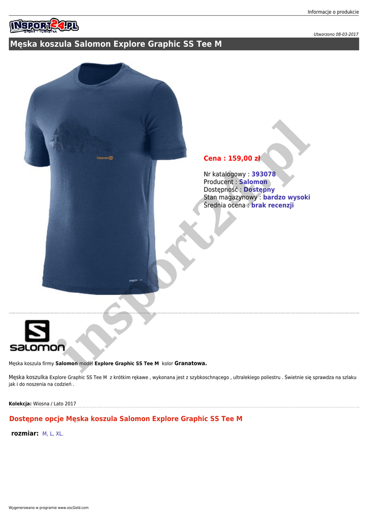 Informacje o produkcie Utworzono 08-03-2017 l Męska koszula Salomon Explore Graphic SS Tee M 4. p Cena : 159,00 zł in sp or t2 Nr katalogowy : 393078 Producent : Salomon Dostępność : Dostępny Stan magazynowy : bardzo wysoki Średnia ocena : brak recenzji Męska koszula firmy Salomon model Explore Graphic SS Tee M kolor Granatowa. Męska koszulka Explore Graphic SS Tee M z krótkim rękawe , wykonana jest z szybkoschnącego , ultralekiego poliestru . Świetnie się sprawdza na szlaku jak i do noszenia na codzień . Kolekcja: Wiosna / Lato 2017 Dostępne opcje Męska koszula Salomon Explore Graphic SS Tee M rozmiar: M, L, XL. Wygenerowano w programie www.oscGold.com