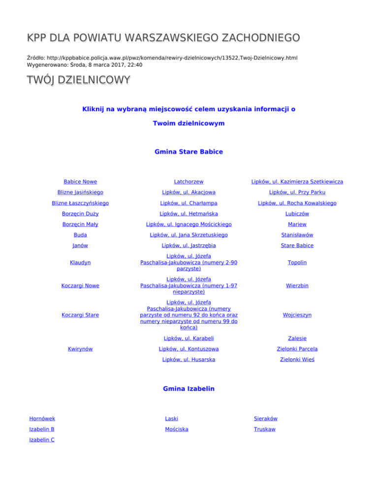 KPP DLA POWIATU WARSZAWSKIEGO ZACHODNIEGO Źródło: http://kppbabice.policja.waw.pl/pwz/komenda/rewiry-dzielnicowych/13522,Twoj-Dzielnicowy.html Wygenerowano: Środa, 8 marca 2017, 22:40 TWÓJ DZIELNICOWY Kliknij na wybraną miejscowość celem uzyskania informacji o Twoim dzielnicowym Gmina Stare Babice Babice Nowe Latchorzew Lipków, ul. Kazimierza Szetkiewicza Blizne Jasińskiego Lipków, ul. Akacjowa Lipków, ul. Przy Parku Blizne Łaszczyńskiego Lipków, ul. Charłampa Lipków, ul. Rocha Kowalskiego Borzęcin Duży Lipków, ul. Hetmańska Lubiczów Borzęcin Mały Lipków, ul. Ignacego Mościckiego Mariew Buda Lipków, ul. Jana Skrzetuskiego Stanisławów Janów Lipków, ul. Jastrzębia Stare Babice Klaudyn Lipków, ul. Józefa Paschalisa-Jakubowicza (numery 2-90 parzyste) Topolin Koczargi Nowe Lipków, ul. Józefa Paschalisa-Jakubowicza (numery 1-97 nieparzyste) Wierzbin Koczargi Stare Lipków, ul. Józefa Paschalisa-Jakubowicza (numery parzyste od numeru 92 do końca oraz numery nieparzyste od numeru 99 do końca) Wojcieszyn Lipków, ul. Karabeli Zalesie Lipków, ul. Kontuszowa Zielonki Parcela Lipków, ul. Husarska Zielonki Wieś Kwirynów Gmina Izabelin Hornówek Laski Sieraków Izabelin B Mościska Truskaw Izabelin C Gmina Kampinos Bieliny Koszówka Prusy Bromierzyk Krubice Rzęszyce Budki Żelazowskie Kwiatkówek Skarbikowo Grabnik Ludwików Stare Gnatowice Granica Łazy Strojec Józefów Łazy Leśne Strzyżew Kampinos Narty Szczytno Kampinos A Pasikonie Wiejca Karolinów Pindal Wola Pasikońska Kiersztajnów Podkampinos Zawady Komorów Gmina Leszno Czarnów Marianów Walentów Feliksów Plewniak Wąsy Kolonia Gawartowa Wola Podrochale Wąsy Wieś Grabina Powązki Wiktorów Grądki Rochale Wielkie Wilkowa Wieś Grądy Roztoka Wilków Julinek Stelmachowo Wólka Kępiaste Szadkówek Wyględy Korfowe Szymanówek Zaborów Ławy Towarzystwo Czarnów Zaborówek (PGR) Łubiec Trzciniec miejscowość Leszno z wyodrębnionymi ulicami Błońska(numery nieparzyste 1-73) Mickiewicza Słowackiego Bohaterów Puszczy Kampinoskiej Miłosza Sochaczewska Broniewskiego Młynarska Sokołowska Fabryczna Murarska Sosnowa Harcerska Ogrodowa Stanisława Lema Hubala Dobrzańskiego Otuliny Strażacka Inżynierska Parkowa Szkolna Jaśminowa Partyzantów (numery nieparzyste 3-35) Tuwima Kochanowskiego Piekarska Warszawska Krótka Podchorążych Wąska Księdza Jana Raczkowskiego Podleśna Widokowa Kwiatowa Podzaborówek Wrzosowa Leśna Polna Al. Wojska Polskiego Leśmiana Sienkiewicza Żeromskiego Marysieńki Mariana Lipowa Partyzantów (numery parzyste 2-4) Tadeusza Błońska (numery parzyste 2-36) Miasto Błonie z wyodrębnionymi ulicami 3 Maja Kwiatowa Powstańców Poznańska 11 Listopada Kwiatów Polnych Projektowana Aksamitna Legionów Przejazd Armii Krajowej Lesznowska Przeskok Armii Ludowej Łąki Przybysza Łukasińskiego Przytulna Batalionów Chłopskich Macieja z Błonia Reymonta Bieniewicka Mała Rynek Brzozowa Mazowiecka Sadowa Bykowskiego Mickiewicza (numery od 12 do 29) Sienkiewicza Asnyka Bajkowa Reginy Cicha Mickiewicza (numery od 1 do 11) Składowa Dobrzyńskiego Mikołaja z Błonia Słoneczna Emilii Plater Modlińska Słowackiego Engelmana Mokra Sochaczewska (numery 1-33A oraz numery 2-58A) Fabryczna Moniuszki Solidarności Faszczycka Nadrzeczna Sowińskiego Graniczna Narodowych Sił Zbrojnych Spacerowa Grażyny Narutowicza Spedycyjna Grodziska Niecała Staszica Harcerska Niemstaka Szarych Szeregów Jagiellońska Norwida Szkolna Jana Pawła II Nowa Chopina Jasna Nowakowskiego Szparagi Nowomiejska Śląska Ogrodowa Targowa Jaśminowa Kalinowa Kamosińskiego Karczewskiego Okrężna Towarowa Kilińskiego Traugutta Okrzei Kniołka Trojańczyka Klonowa Orzeszkowej Uśmiech Kolejowa Parkowa Warszawska Kombatantów Passowska Wąska Konopnickiej Piaskowa Wiejska Kopernika Piłsudskiego Wierzbowa Kościuszki Piwna Wspólna Krasickiego Plantowa Wyszyńskiego Krótka Polna Zacisze Zapomniana Krzywa Poniatowskiego Zdziecha Żeromskiego Kulisiewiczów Poprzeczna Żukówka gmina Błonie Białutki Stare Faszczyce Piorunów Białuty Górna Radonice Bieniewice Górna Wieś Radzików Bieniewo Konstantów Łaźniewek Bieniewo Parcela Kopytów Rochaliki Bieniewo Wieś Łaźniew Rokitno Błonie Wieś Marysiek Stary Łuszczewek Bramki Nowa Górna Wawrzyszew Cholewy Nowa Wieś Witki Dębówka Nowy Łuszczewek Wola Łuszczewska Nowe Faszczyce Pass Żukówka gmina Łomianki z wyodrębnionymi ulicami 1 Maja Karola Szymanowskiego prof. Stanisława Brzósko 3 Maja Kasztanowa Prosta 9 Maja Kazimierza „Dziadka” Lisieckiego Przebiśniega 11 Listopada Klemensa Lipińskiego Przechodnia 6 Pułku Piechoty Klonowa Przelotowa 22 Września Klonowy Park Przełajowa Adama Asnyka Kmicica Przeskok Adama Mickiewicza Kolejowa (numery parzyste 2-58) Przygodna Adm. Krzysztofa Arciszewskiego Kolejowa (numery parzyste 60-156 oraz numery nieparzyste 1-135) Przy Jeziorze Agawy Kolejowa ( numery nieparzyste od 137 i numery parzyste od 158 do końca) Racławicka Akacjowa Koncertowa Rajska Aleksandra Fredry Konwaliowa Rolnicza (numery 1-143 oraz 2-158) Aleja Fryderyka Chopina Kopciuszka Rolnicza (od numeru 160 do końca oraz od numeru 145 do końca) Aleja Lip Kosynierów Romantyczna Antonio Vivaldiego Koszałka Opałka Równa Armii Krajowej Kościelna Droga Równoległa Armii Poznań (numery parzyste) Kota w Butach Rzemieślnicza I Armii Wojska Polskiego Krajobrazowa Sasanki Asfaltowa Krasnoludków Sezamkowa Baonu Zośka Krokusa Sielanki Baśniowa Królowej Marysieńki Sierakowska Batalionów Chłopskich Krótka sierż. Władysława Szymczaka Biedronki Krzysztofa Kamila Baczyńskiego Skrzetuskiego Błotna Krzywa Słoneczna Boczna księcia Henryka Pobożnego Sosnowa Bolka i Lolka księcia Józefa Poniatowskiego Spacerowa Borówkowa ks. Hugona Kołłątaja Spokojna Brukowa (numery 1-23 oraz 2-18) Kwiatowa Sportowa Brukowa (od numeru 20 do końca oraz od numeru 25 do końca) Lalkowa Stanisława Konarskiego Brzegowa (numery 2-34 oraz 1