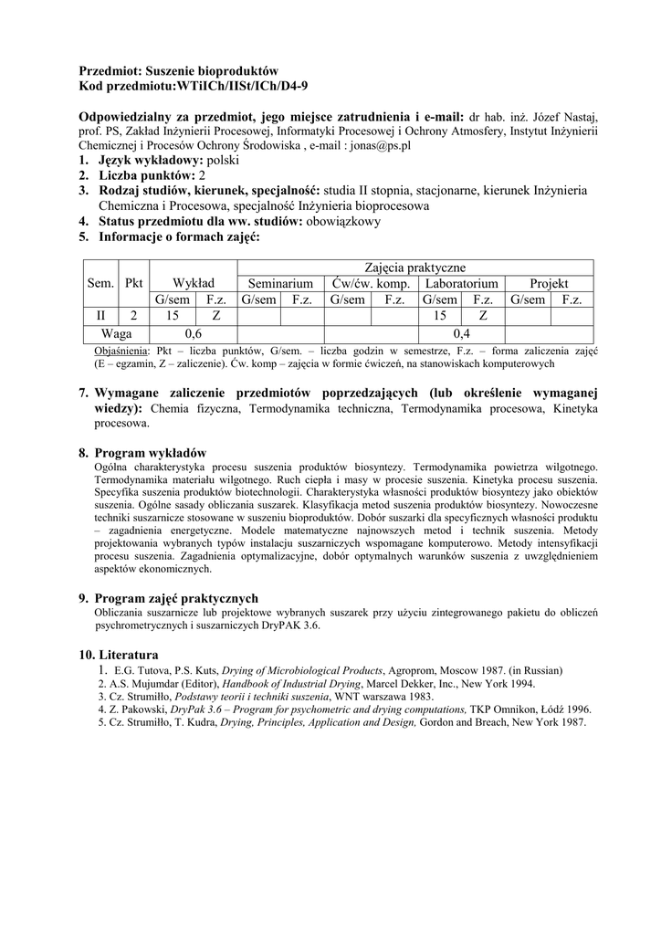 Przedmiot: Suszenie bioproduktów Kod przedmiotu:WTiICh/IISt/ICh
