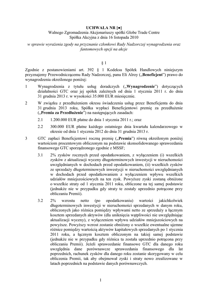 UCHWAŁA NR [●] Walnego Zgromadzenia Akcjonariuszy spółki Globe Trade Centre Spółka Akcyjna z dnia 16 listopada 2010 w sprawie wyrażenia zgody na przyznanie członkowi Rady Nadzorczej wynagrodzenia oraz fantomowych opcji na akcje §1 Zgodnie z postanowieniami art. 392 § 1 Kodeksu Spółek Handlowych niniejszym przyznajemy Przewodniczącemu Rady Nadzorczej, panu Eli Alroy („Beneficjent”) prawo do wynagrodzenia określonego poniżej: 1 Wynagrodzenia z tytułu usług doradczych („Wynagrodzenie”) dotyczących działalności GTC oraz jej spółek zależnych od dnia 1 stycznia 2011 r. do dnia 31 grudnia 2013 r. w wysokości 35.000 EUR miesięcznie. 2 W związku z przedłużeniem okresu świadczenia usług przez Beneficjenta do dnia 31 grudnia 2013 roku, Spółka wypłaci Beneficjentowi premię za przedłużenie („Premia za Przedłużenie”) na następujących zasadach: 3 2.1 1.200.000 EUR płatne do dnia 1 stycznia 2011 r.; oraz 2.2 300.000 EUR płatne każdego ostatniego dnia kwartału kalendarzowego w okresie od dnia 1 stycznia 2012 do dnia 31 grudnia 2013 r. GTC zapłaci Beneficjentowi roczną premię („Premia”) równą określonym poniżej wartościom procentowym obliczonym na podstawie skonsolidowanego sprawozdania finansowego GTC sporządzonego zgodnie z MSSF; 3.1 2% zysków rocznych przed opodatkowaniem, z wyłączeniem (i) wszelkich zysków z aktualizacji wyceny długoterminowych inwestycji w nieruchomości uwzględnianych w dochodach przed opodatkowaniem, (ii) wszelkich zysków ze sprzedaży długoterminowych inwestycji w nieruchomości uwzględnianych w dochodach przed opodatkowaniem z wyłączeniem wpływu wszelkich udziałów mniejszościowych na ten zysk. Powyższe zyski zostaną obniżone o wszelkie straty od 1 stycznia 2011 roku, obliczone na tej samej podstawie (jednakże nie w przypadku gdy straty te zostały uprzednio potrącone przy obliczaniu Premii). 3.2 2% wzrostu netto (po opodatkowaniu) wartości jakichkolwiek długoterminowych inwestycji w nieruchomości sprzedanych w danym roku, obliczonych jako różnica pomiędzy wpływami netto ze sprzedaży a łącznym kosztem sprzedanych aktywów (dla uniknięcia wątpliwości nie uwzględniając aktualizacji wyceny), z wyłączeniem wpływu udziałów mniejszościowych na powyższe. Powyższy wzrost zostanie obniżony o wszelkie ewentualne ujemne różnice pomiędzy wartością aktywów kapitałowych sprzedanych po 1 stycznia 2011 roku, a łącznym kosztem obliczonym na takiej samej podstawie (jednakże nie w przypadku gdy różnica ta została uprzednio potrącona przy obliczaniu Premii). Jeżeli sprawozdanie finansowe GTC dla danego roku uwzględnia dane porównawcze sprawozdania finansowego dla lat poprzednich, rachunek zysków dla danego roku zostanie skorygowany w celu obliczenia Premii, tak aby obejmował zyski i straty nowo zrealizowane w latach poprzednich na podstawie danych porównawczych. 1 Premia zostanie wypłacona za okres od 1 stycznia 2011 roku do 31 grudnia 2013 roku lub na koniec kwartału kalendarzowego, w którym Umowa zostanie wypowiedziana. 4 Beneficjent będzie uprawniony do następujących nowych Płatności Fantomowych (zgodnie z definicją zawartą w punkcie 8 poniżej) na podstawie uprawnienia do 2,992,000 Akcji Fantomowych w okresie od 1 stycznia 2011 roku do 31 grudnia 2013 roku („Okres”), w następujących transzach: 4.1 Pierwsza transza w wysokości 1.000.000 Akcji Fantomowych stanie się wymagalna w dniu 1 stycznia 2011 roku; 4.2 Miesięczne transze w wysokości 83.000 Akcji Fantomowych każda staną się wymagalne w ostatnim dniu każdego miesiąca w okresie od 1 stycznia 2012 roku do 31 grudnia 2013 roku. 5 W przypadku wypowiedzenia Umowy o Świadczenie Usług z dnia 19 maja 1998 roku (z późn. zmianami) pomiędzy GTC a spółką zależną Beneficjenta lub umowy, która zastąpi Umowę o Świadczenie Usług („Umowa o Świadczeniu Usług”), z innego powodu niż Ważny Powód, Beneficjent będzie uprawniony do wszystkich Akcji Fantomowych, zarówno już wymagalnych jak i jeszcze nie wymagalnych. 6 W przypadku rozwiązania Umowy o Świadczeniu Usług przez Beneficjenta po wystąpieniu Zmiany Kontroli, Beneficjent uprawniony będzie do wszystkich wymagalnych Akcji Fantomowych oraz Akcji Fantomowych, które mają stać się wymagalne w okresie 12 miesięcy od rozwiązania. 7 W przypadku podziału akcji GTC, Akcje Fantomowe oraz cena wykonania określona poniżej jako B zostaną odpowiednio podzielone, a w przypadku podwyższenia kapitału zakładowego liczba Akcji Fantomowych oraz cena wykonania określona poniżej jako B zostaną podwyższone proporcjonalnie. 8 Beneficjent może wykonywać uprawnienia ze swoich wymagalnych Akcji Fantomowych wielokrotnie w okresie od dnia 1 stycznia 2011 roku do dnia 31 grudnia 2014 roku. Z chwilą wykonania uprawnień, Beneficjent będzie do płatności fantomowych („Płatności Fantomowe”) obliczonych zgodnie z następującym wzorem: P = Z * (A-B) gdzie: 9 P - Płatność Fantomowa w PLN; Z - liczba Akcji Fantomowych, z których Beneficjent wykonuje swoje prawo; A - średnia cena zamknięcia dla akcji Spółki na Giełdzie Papierów Wartościowych w Warszawie w okresie 30 dni przed datą doręczenia Spółce zawiadomienia o wykonaniu; oraz B - 22 PLN pomniejszone o wartość na jedną akcję wszystkich dywidend wypłaconych przez Spółkę jej akcjonariuszom od dnia niniejszej uchwały do dnia doręczenia zawiadomienia o wykonaniu. Alternatywą do realizacji Płatności Fantomowych jest wydanie przez Spółkę Beneficjentowi akcji Spółki w liczbie równej Płatności Fantomowej podzielonej przez średnią cenę zamknięcia dla akcji Spółki na Giełdzie Papierów Wartościowych w Warszawie w okresie 30 dni przed doręczeniem Spółce zawiadomienia o wykonaniu, pomniejszonej o 0,1 PLN. Cena emisyjna takich akcji wynosi 0,1 PLN. 10 11 12 Beneficjent będzie uprawniony do następujących płatności w następujących sytuacjach: 