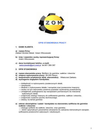 OPIS STANOWISKA PRACY 1. DANE KLIENTA a) nazwa firmy: Zakład Obróbki Metali Adam Włoczewski b) imię i nazwisko osoby reprezentującej firmę: Adam Włoczewski c) dane kontaktowe( telefon, e-mail) [email protected] tel.601 269 397 2. OPIS STANOWISKA a) b) c) d) nazwa stanowiska pracy: Szlifierz do gwintów, wałków i otworów miejsce wykonywania pracy: 09-200 Sierpc bezpośredni przełożony( dział, stanowisko): Właściciel Zakładu wymagania względem kandydata: → dokładność w wykonywaniu powierzonych detali, → cierpliwość, → dbałość o wykonywane detale i narzędzia oraz powierzone maszyny, → osoba na tym stanowisku powinna posiadać wyobraźnię przestrzenną, → umiejętność posługiwania się narzędziami pomiarowymi do mierzenia wykonanych detali, → znajomość obsługi maszyny do szlifowania gwintów, wałków i otworów, → znajomość czytania rysunku technicznego → wiedzy na temat gwintów e) zakres obowiązków i zadań kandydata na stanowisku szlifierza do gwintów wałków i otworów: → obsługa szlifierki do wałków, otworów, oraz gwintów, → dobór optymalnych parametrów skrawania do ostrzenia różnorodnych narzędzi. szlifowanie powierzchni walcowych i stożkowych. 1 3. WYMAGANE KWALIFIKACJE KANDYDATA a) edukacja: minimum szkoła zawodowa lub tytuł Mistrza w zawodzie,mile widziane wykształcenie średnie techniczne w zakresie obróbki metali. . b) mile widziane doświadczenie przy szlifowaniu gwintów. c) umiejętności: Oczekujemy: → Bardzo dobrej znajomości rysunku technicznego, → Znajomości narzędzi pomiarowych, → Umiejętności obsługi szlifierek, → Wykonywania /szlifowania/ gwintów, wałków i otworów, → Wykształcenia zawodowego lub średniego technicznego, → Umiejętności pracy w zespole, → Komunikatywności, odpowiedzialności, samodzielności, → Umiejętność obsługi szlifierki do wałków, otworów oraz gwintów, → Dobór optymalnych parametrów skrawania do ostrzenia różnorodnych narzędzi, szlifowanie powierzchni walcowych i stożkowych. d) znajomość języków obcych: mile widziana 4. Oferujemy: → wynagrodzenie adekwatne do umiejętności, → stabilne zatrudnienie w oparciu o umowę o pracę, → miłą atmosferę w pracy, 2